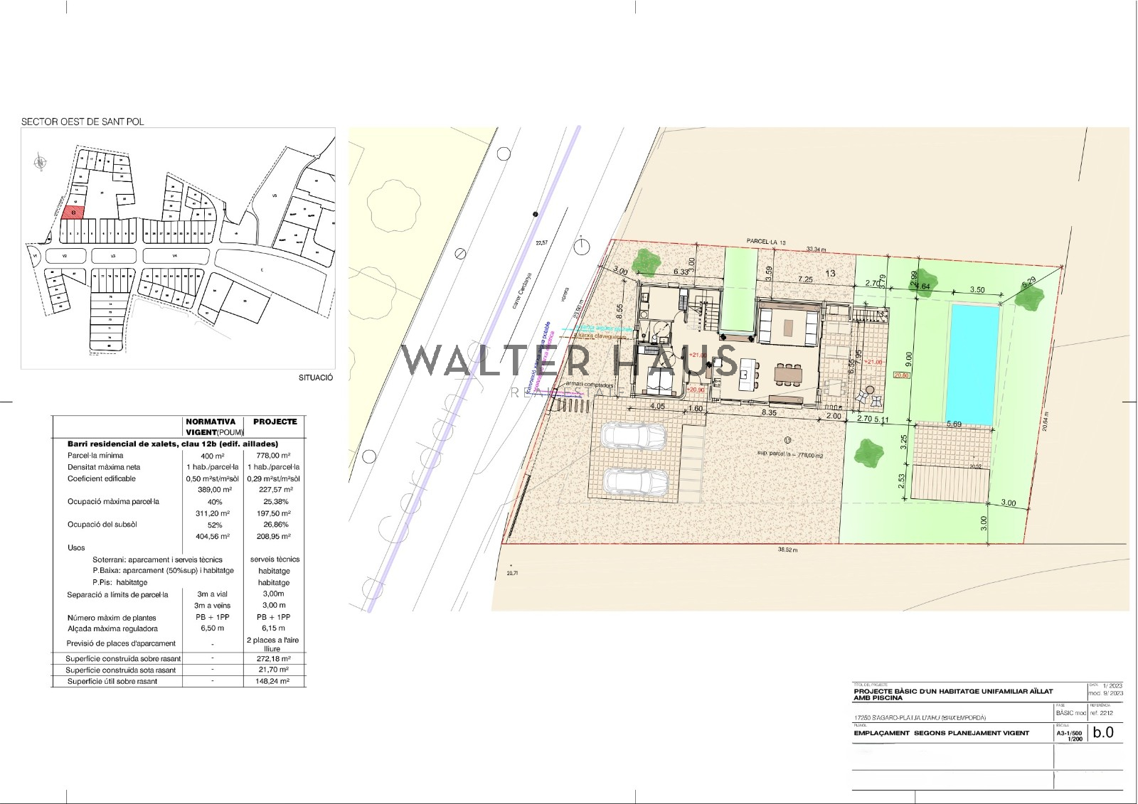 Al residencial S’Agaró Nou s’ofereixen diverses parcel·les amb projectes personalitzables, situades a pocs minuts caminant de la Platja de Sant Pol. Una de les opcions destacades és la Parcel·la 11, de 771 m2, que inclou un habitatge de 210 m² construïts. L’altra opció seria un habitatge de 270 m2 i, en aquest cas, el preu, amb la construcció inclosa, seria de 1.890.000€.