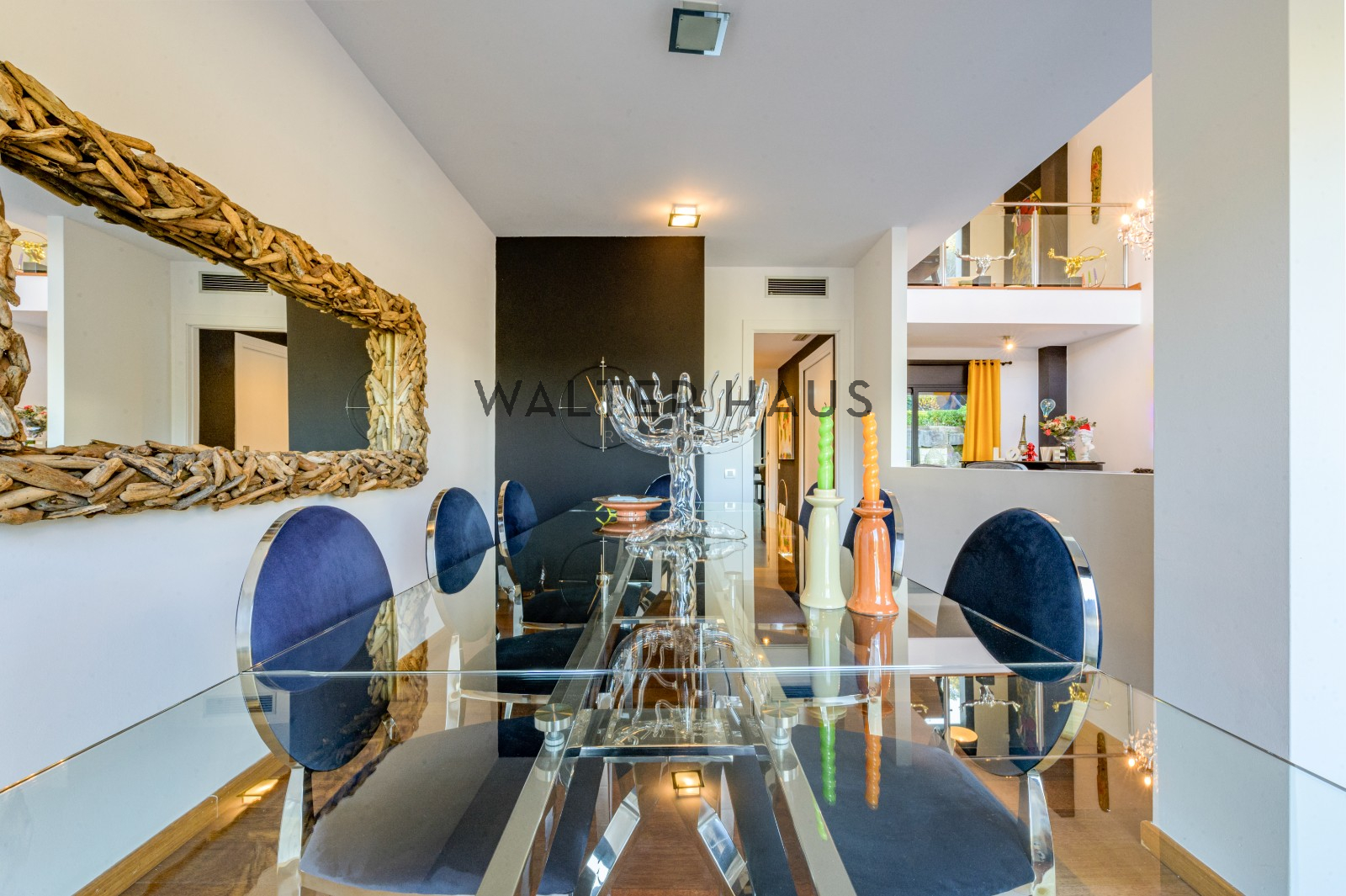 La planta baixa compta amb un espai polivalent ideal com a sala de jocs, oficina o dormitori de convidats, complementat amb terrasses que ofereixen vistes espectaculars de les muntanyes. A la planta principal, el saló amb llar de foc connecta amb un elegant menjador i una terrassa chill-out. La cuina moderna, equipada amb una illa central i rebost, dóna accés directe al jardí, on una piscina climatitzada i zones de descans creen un ambient perfecte per relaxar-se. A la planta superior, el dormitori principal en suite amb terrasses privades se suma a cinc habitacions addicionals, ideals per a família o convidats.