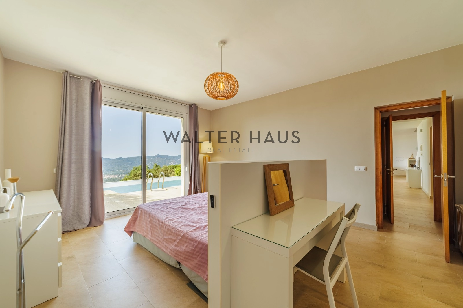 L´habitatge compta amb quatre dormitoris dobles, dos d´ells en suite, tots equipats amb amplis finestrals que permeten gaudir d´una gran entrada de llum natural i vistes clares. A la planta superior hi ha tres dormitoris, un bany complet i un espai originalment destinat a garatge, actualment condicionat com a despatx amb una gran finestra panoràmica. La distribució ha estat pensada per oferir comoditat i privadesa, utilitzant materials de qualitat en tots els acabats. A la planta inferior hi ha la zona principal de la vivenda: un ampli menjador amb grans finestrals, cuina moderna i completament equipada, un bany complet i la suite principal amb accés directe al jardí. Des d´aquesta planta s´accedeix a la zona exterior, que compta amb piscina privada tipus infinita, un jardí cuidat i espais dissenyats per gaudir del bon clima i la privadesa de l´entorn.