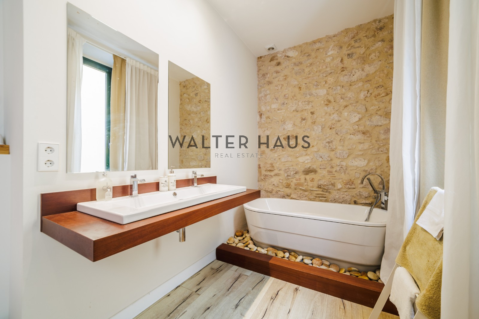 A l’interior, s’aprecia un ampli rebedor amb sostres alts i parets de pedra, que dóna pas a un saló menjador lluminós ia una cuina independent equipada amb zona office.