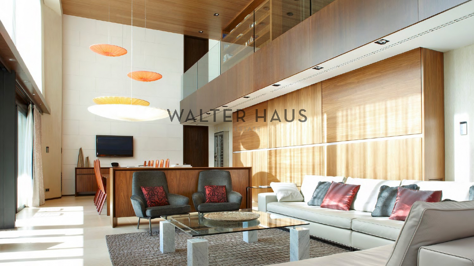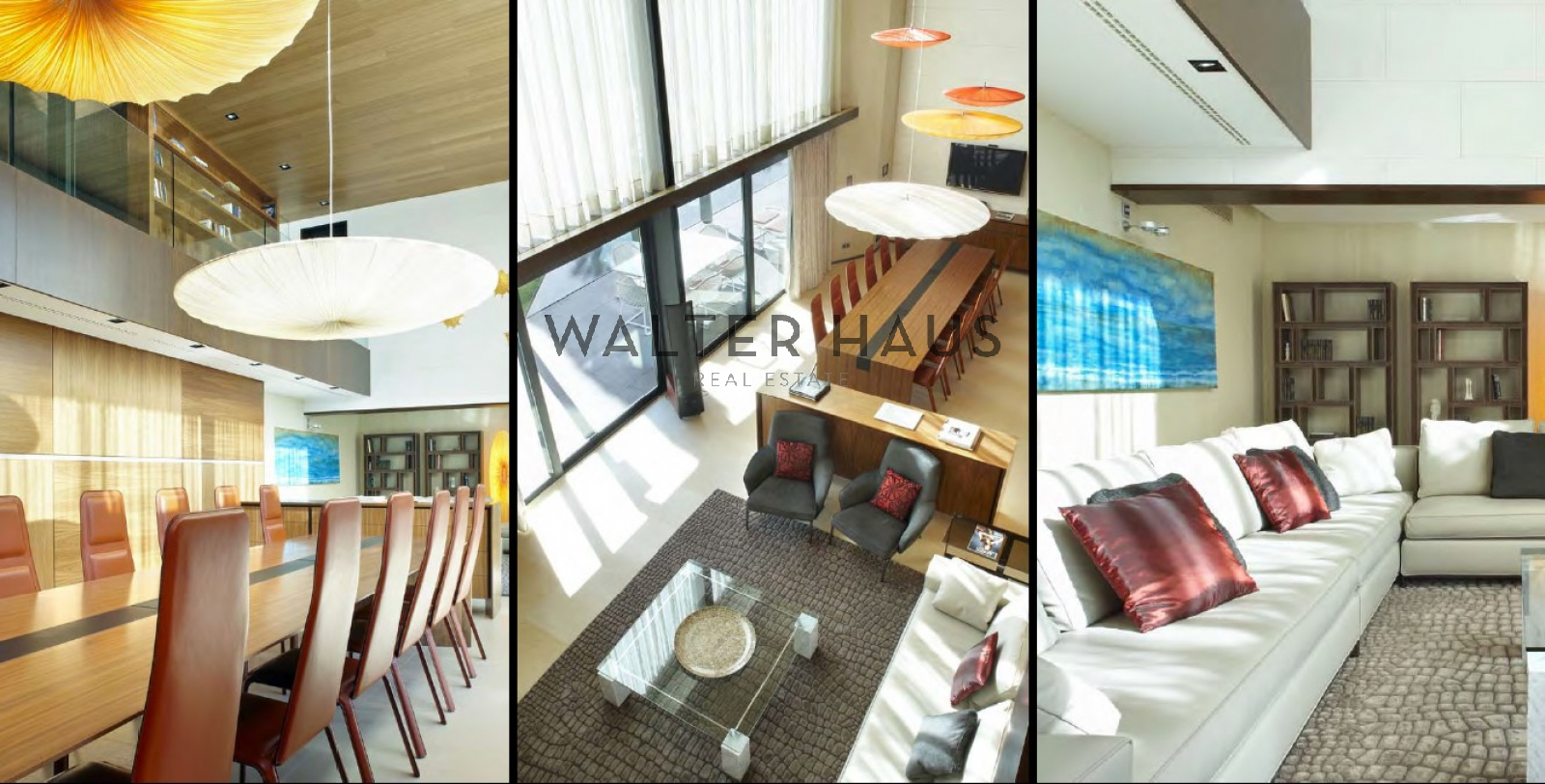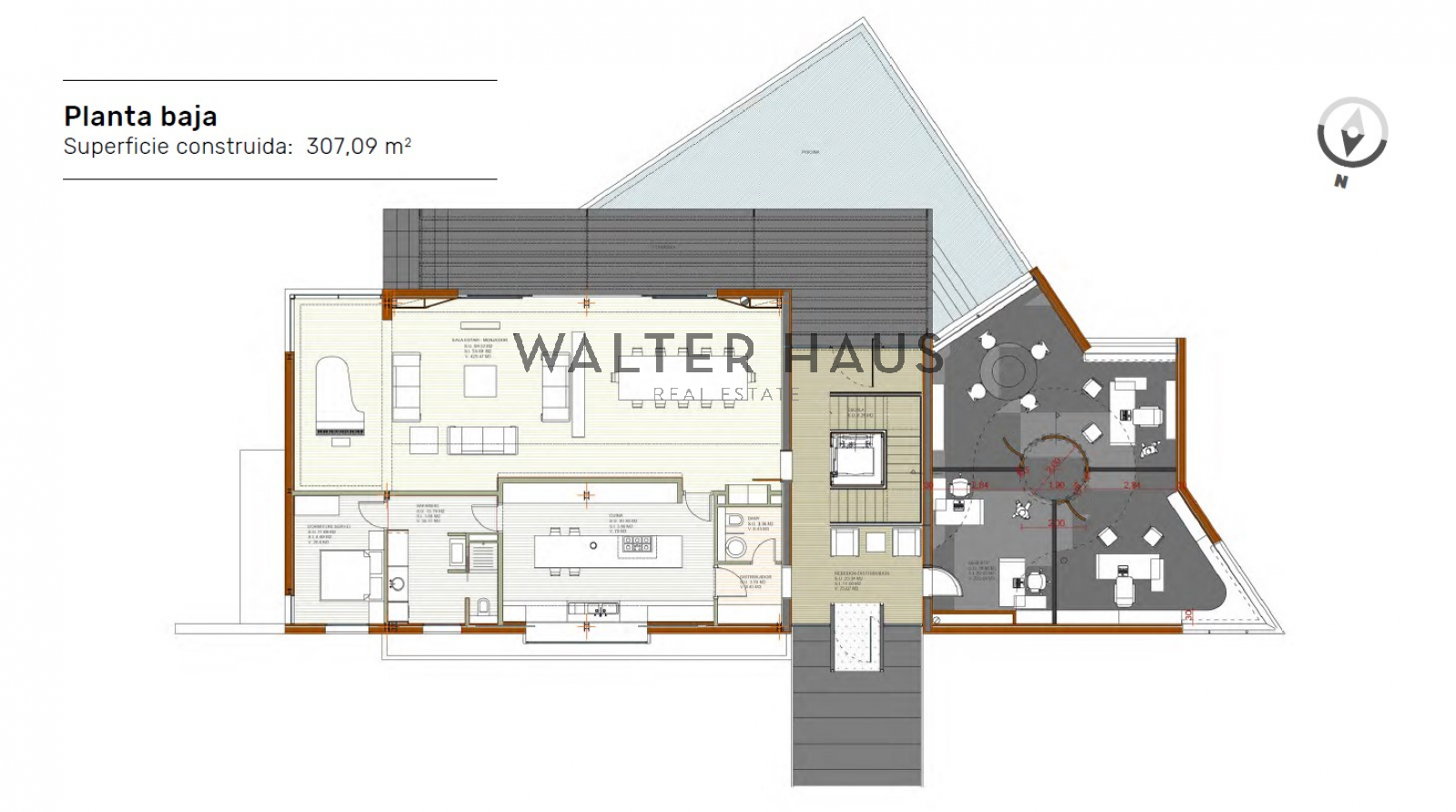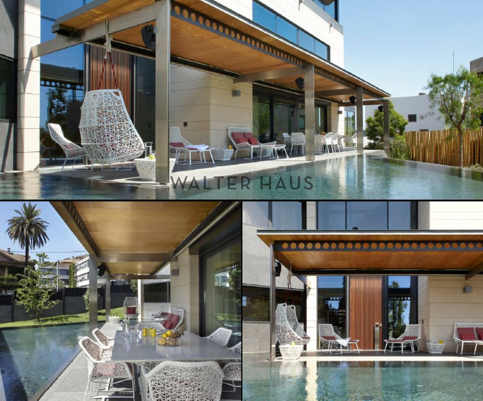 La casa es compon de 4 plantes independents. La planta baixa (307m2) acull un elegant saló menjador a doble alçada amb grans finestrals, i amb accés directe al jardí, piscina desbordant i porxo, cuina oberta completament moblada i equipada, un lavabo de cortesia per als convidats i una zona habilitada per al servei amb una habitació, una zona de bugaderia i un lavabo. A més hi ha dues sales office com a àrea de treball o estudi a què s’accedeix per una entrada independent.