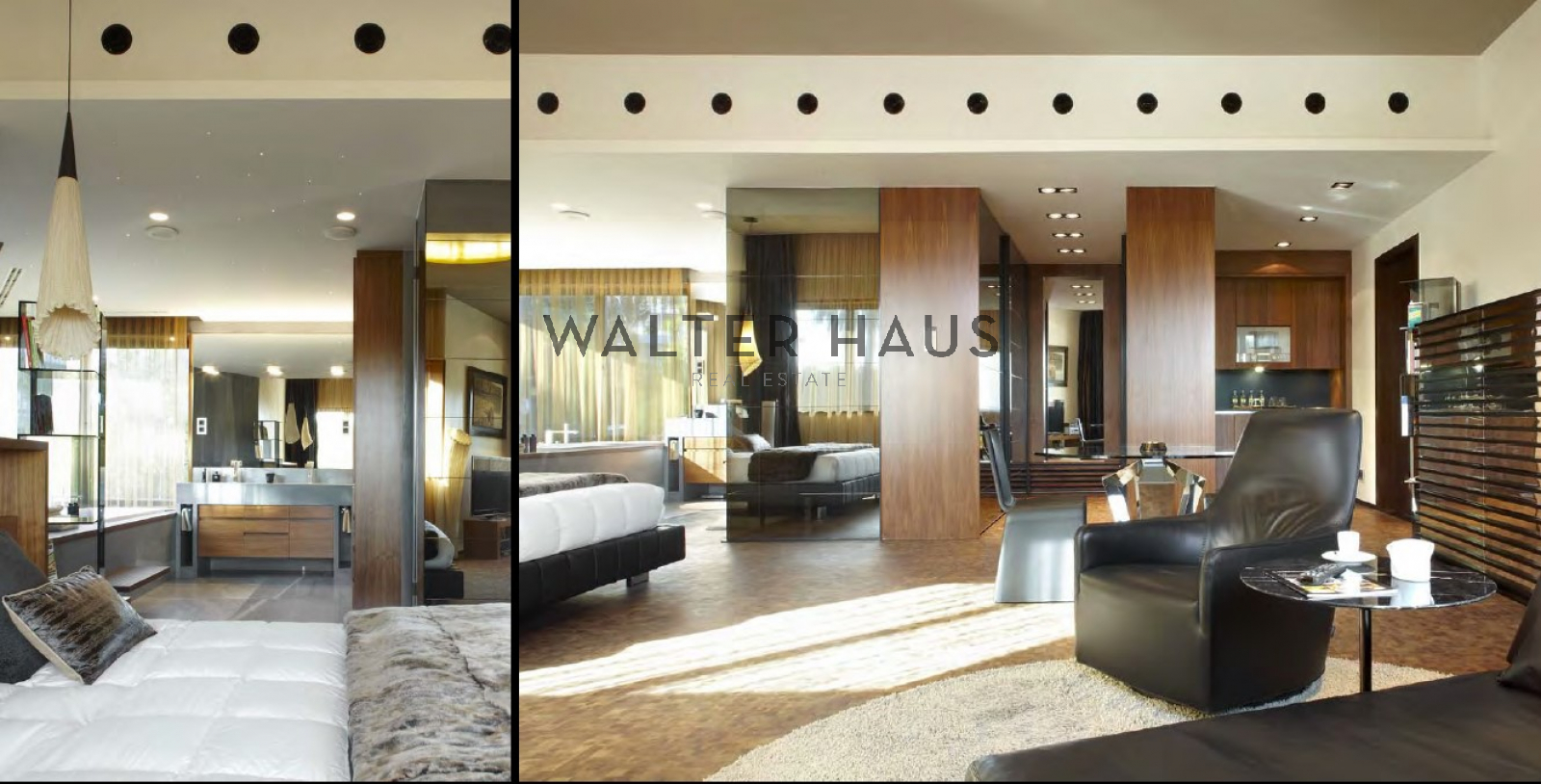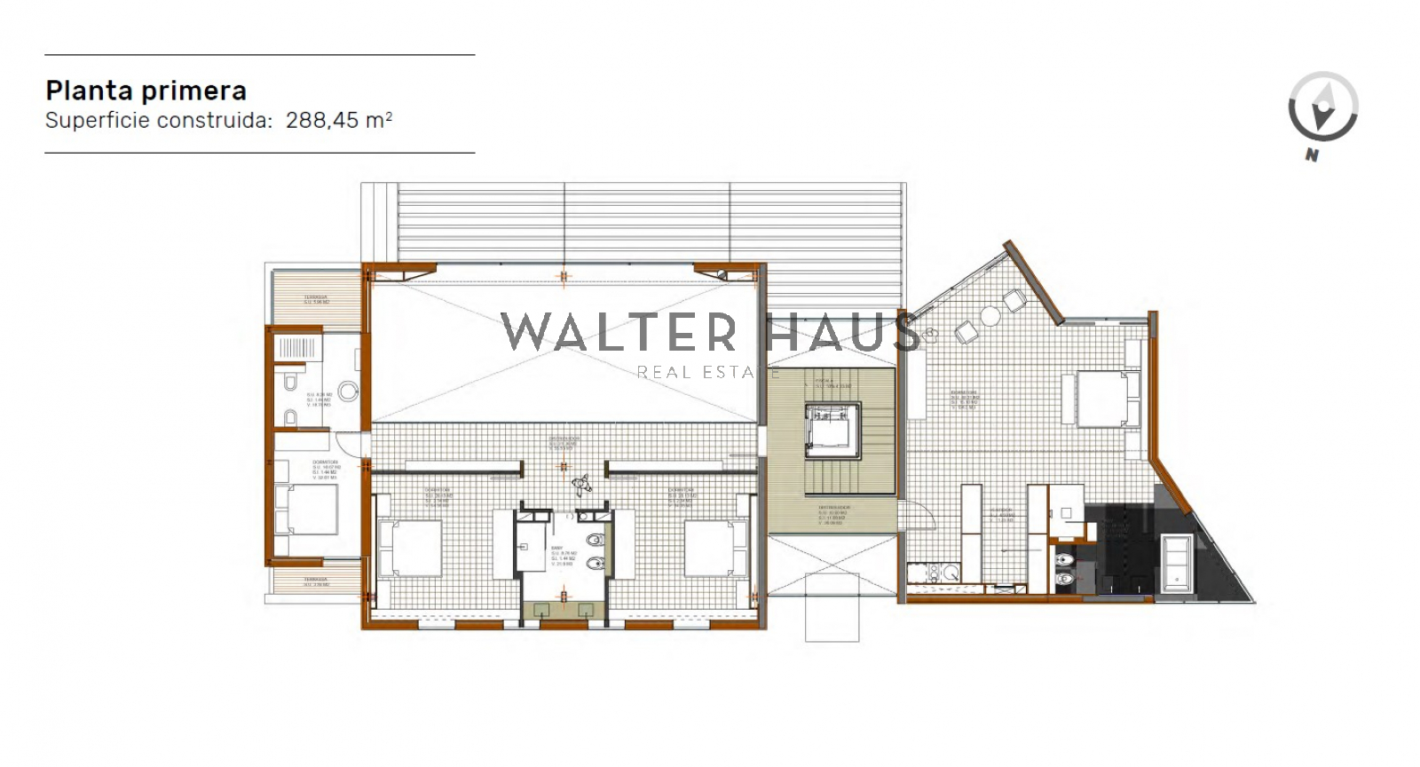 A la primera planta (288m2) hi trobem un apartament suite independent per a màxima intimitat, que es distribueix en una gran habitació en suite i dues habitacions dobles que comparteixen un bany complet.