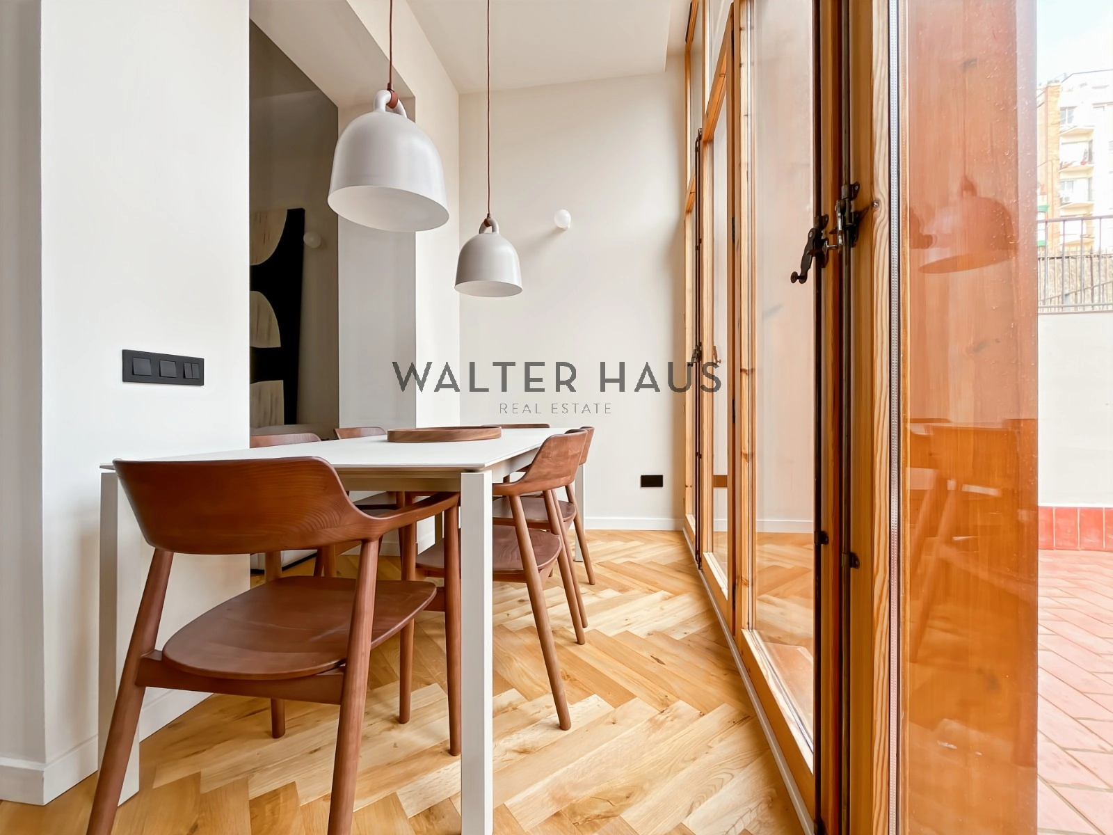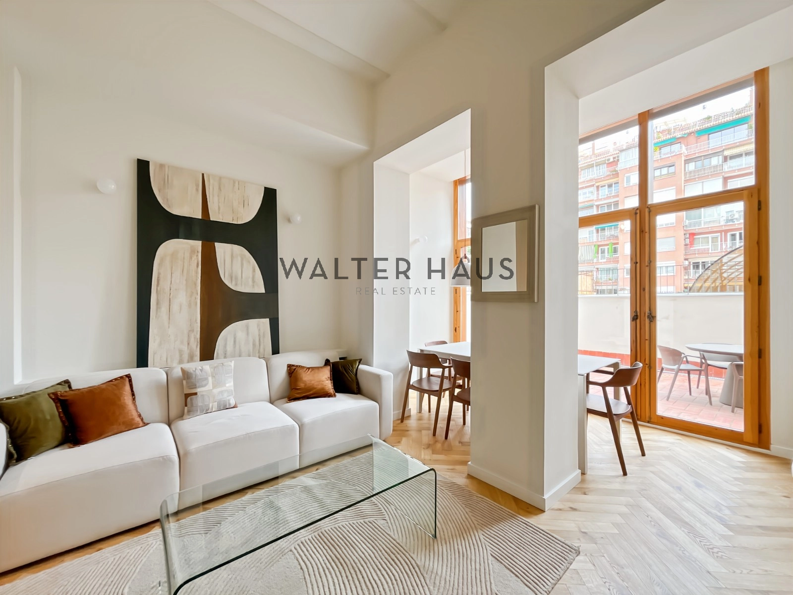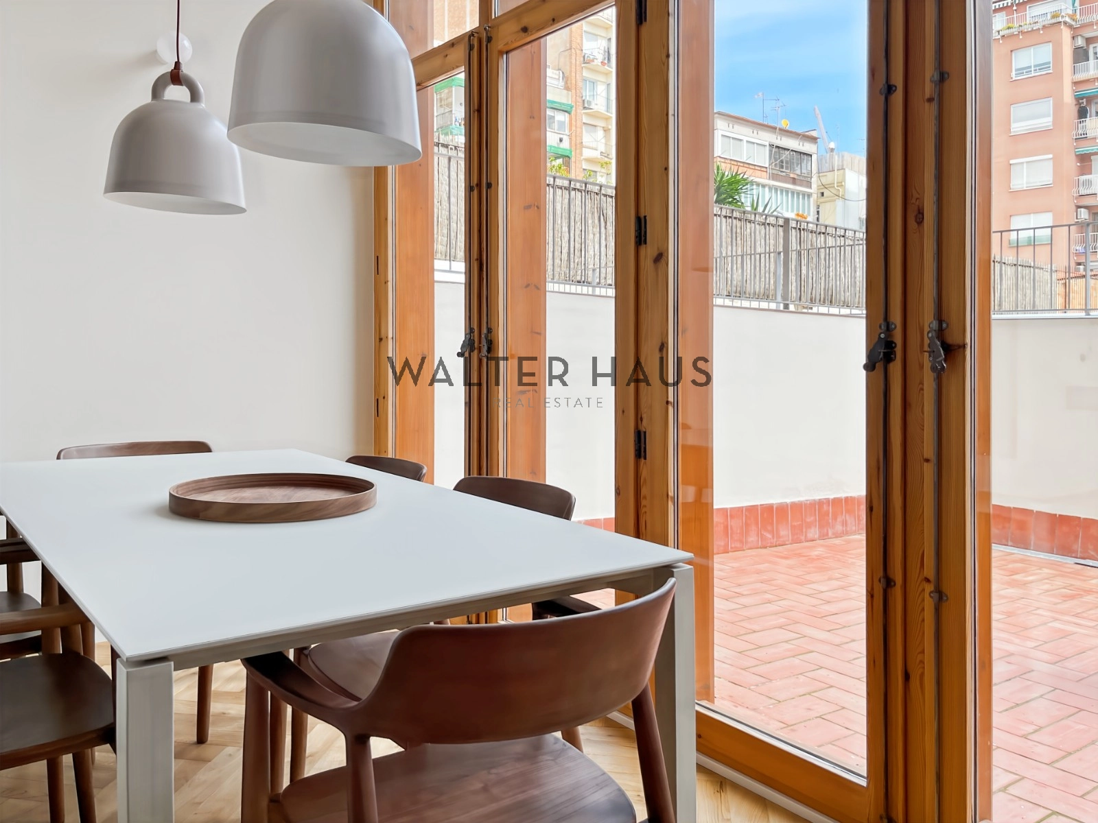 LLOGUER DE TEMPORADA. MOBLAT I EQUIPAT PREMIUM. Exclusiu pis renovat al cor de l’Eixample, Barcelona. Aquest pis lluminós, completament reformat el 2024, compta amb una superfície construïda de 110 m², acuradament dissenyada per oferir comoditat i funcionalitat. Ubicat en un edifici senyorial del 1900, l’habitatge combina a la perfecció elements històrics com sostres de volta catalana i fusteria original amb detalls moderns i acabats d’alta qualitat. La distribució inclou un vestíbul amb armaris de paret, una suite principal amb balcó al carrer i bany complet, un segon dormitori amb accés al pati interior, un segon bany complet, i un ampli saló-menjador connectat amb una cuina equipada amb electrodomèstics de primeres marques. A més, hi destaca una terrassa privada de 19,19 m² i un innovador sistema d’Aerotèrmia que garanteix un confort tèrmic eficient i sostenible. Situat a una de les avingudes més icòniques de l’Eixample, aquest pis està envoltat d’edificis modernistes, centres culturals, restaurants de prestigi i tots els serveis essencials. La seva ubicació ofereix un estil de vida únic a l’epicentre cultural i social de Barcelona. A Walter Haus, treballem per oferir propietats que no només compleixin les seves necessitats, sinó que també superin les seves expectatives. Us convidem a descobrir aquesta llar única i gaudir d’una experiència de lloguer incomparable. Contacti’ns per a més informació!*En compliment de la Llei 12/2023, Llei 18/2007 i Decret Llei 01/2025, informem que:Preu últim contracte: €6.000Condició de gran forquilla: NoSistema Estatal de Referència de Preus de Lloguer d´Habitatge: 1365,90€ Despeses de Comunitat i I.B.I.: inclosesCost dels subministraments: no inclosos al preu.