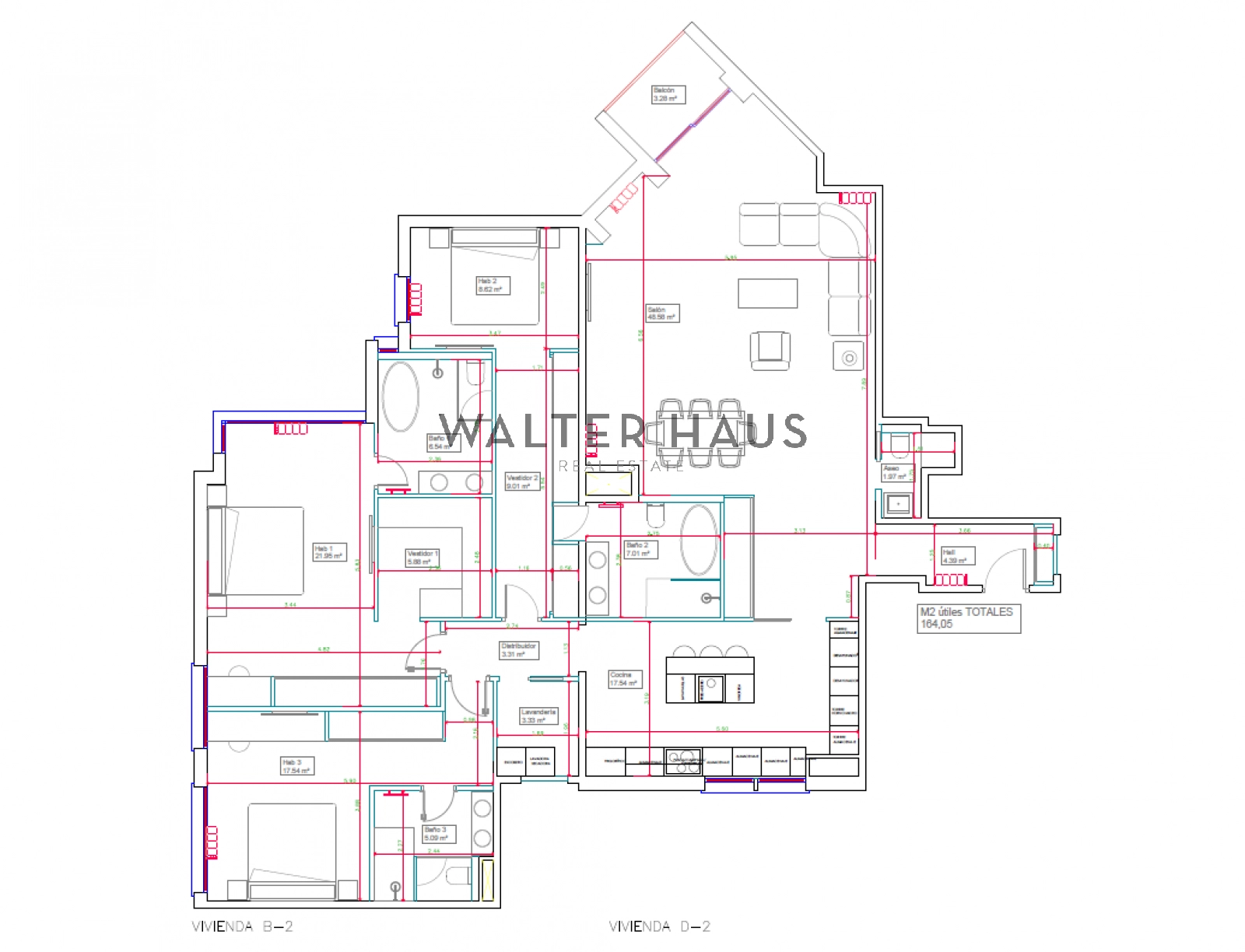 L’habitatge ha estat meticulosament dissenyat per maximitzar el confort. L´accés es realitza a través d´un distribuïdor privat des de dos ascensors, que condueix a un elegant hall d´entrada amb armaris. L´impressionant saló exterior, amb accés a una terrassa privada, es divideix en dos ambients diferenciats, ideal per al lleure i la recepció de convidats, i complementat per un lavabo de cortesia. A l’altra banda, hi trobem la cuina independent, equipada amb una pràctica illa central i una zona de bugaderia. La zona de descans es compon de tres habitacions, totes amb bany en suite i amplis armaris encastats, destacant el dormitori principal per la seva completa zona de vestidor.