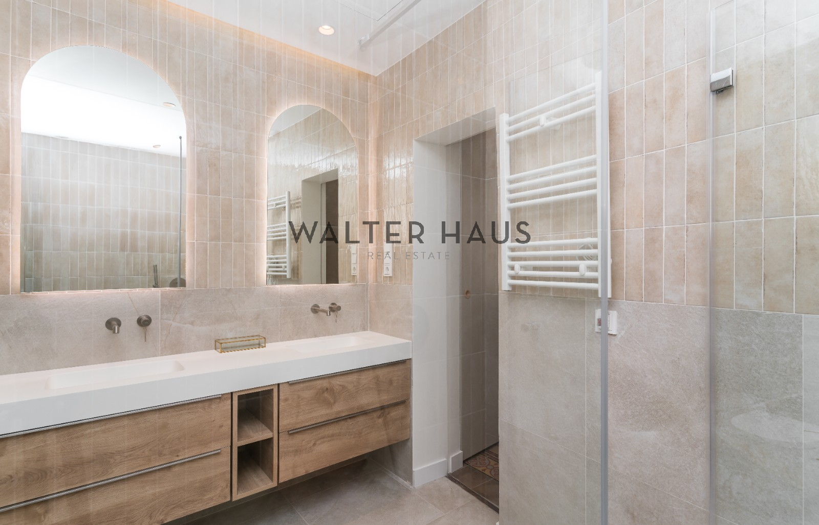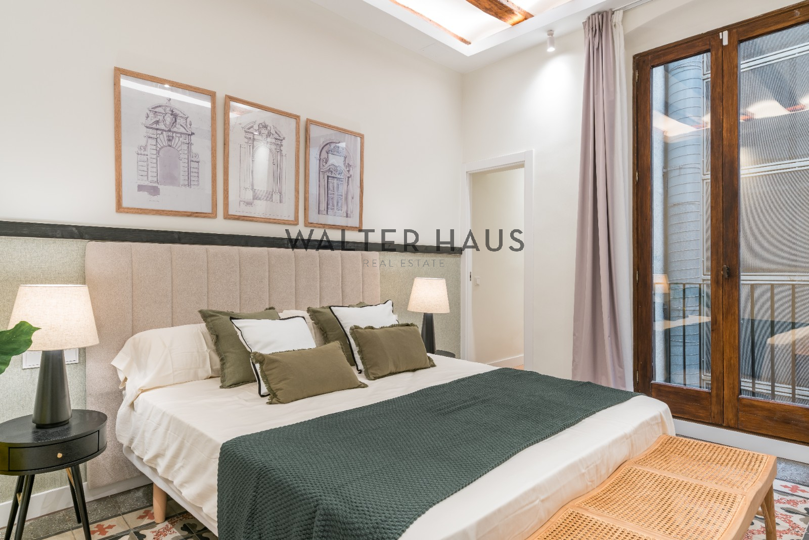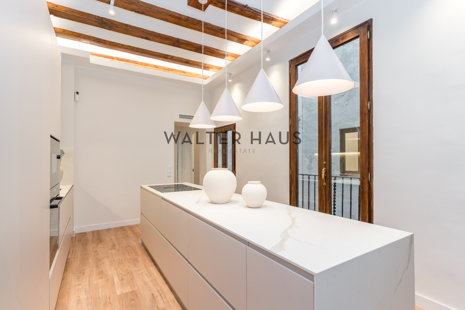 El pis compta amb 2 dormitoris, un és una suite amb vestidor i orientació a l’exterior. A més, disposa d´un còmode estudi amb un bany independent i un lavabo de cortesia. L´interior destaca per un ampli saló-menjador amb abundant il·luminació natural gràcies a les altes finestres, sostres alts amb bigues de fusta restaurades i llums LED indirectes que realcen el seu encant. La cuina amb estil americà ve equipada amb electrodomèstics de la marca Bosch i una àmplia illa amb taulell Neolith, per crear un espai únic i amb personalitat pròpia que s’integra harmoniosament per generar un ambient modern i acollidor.