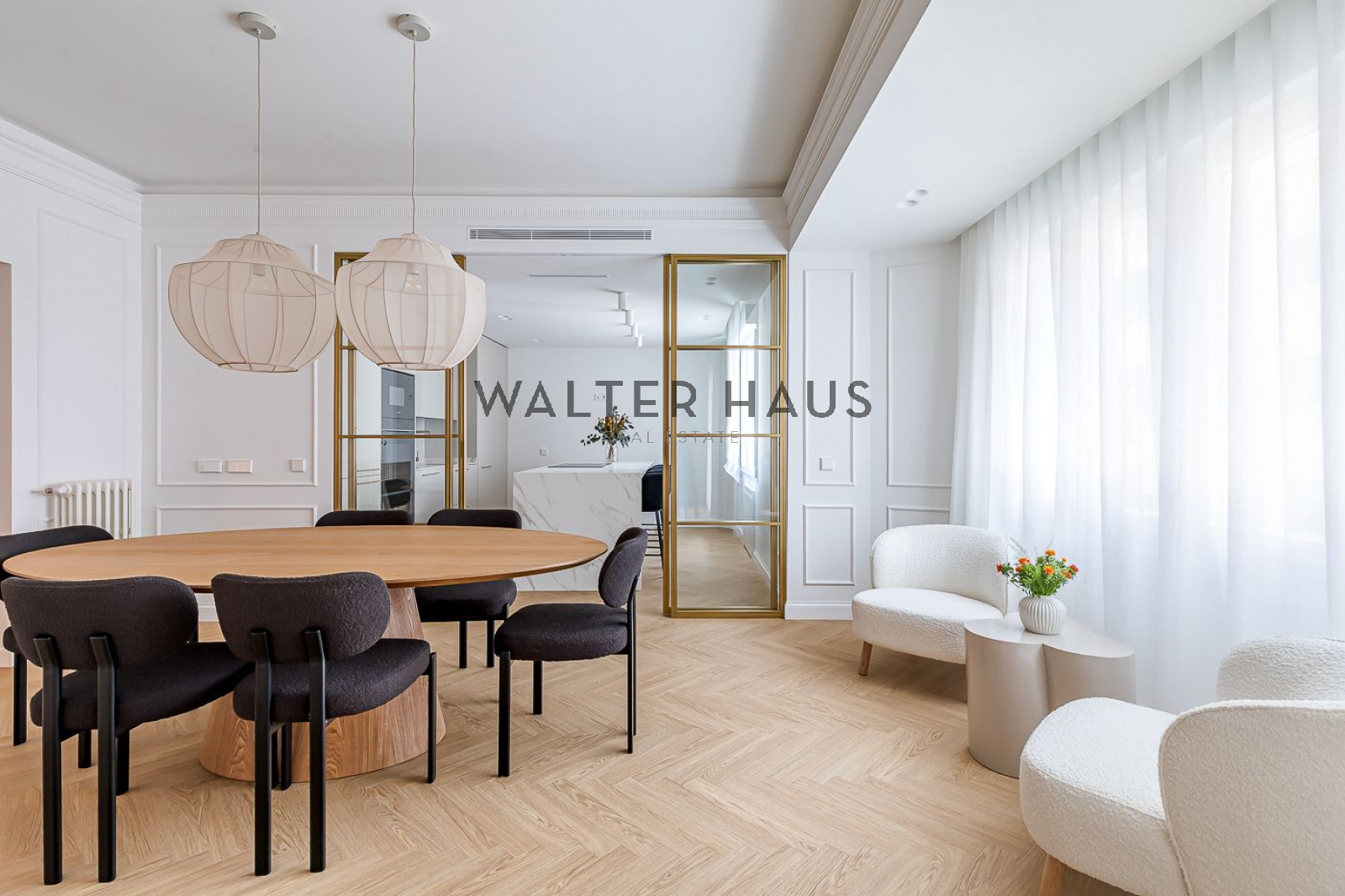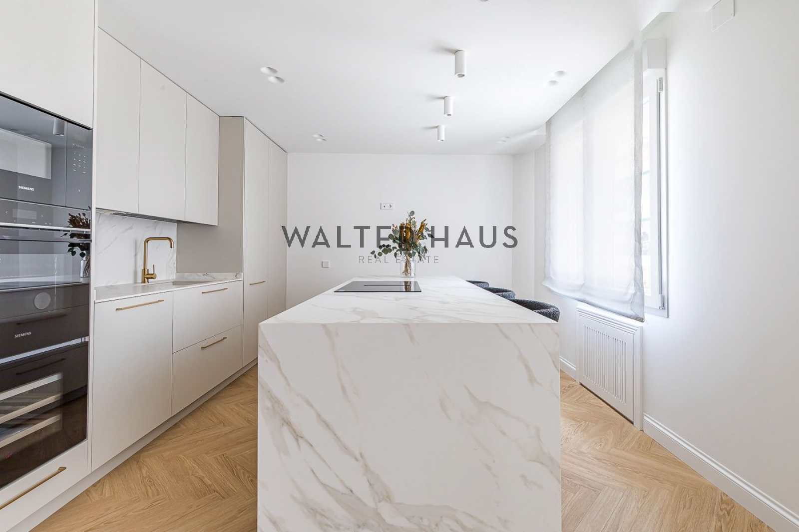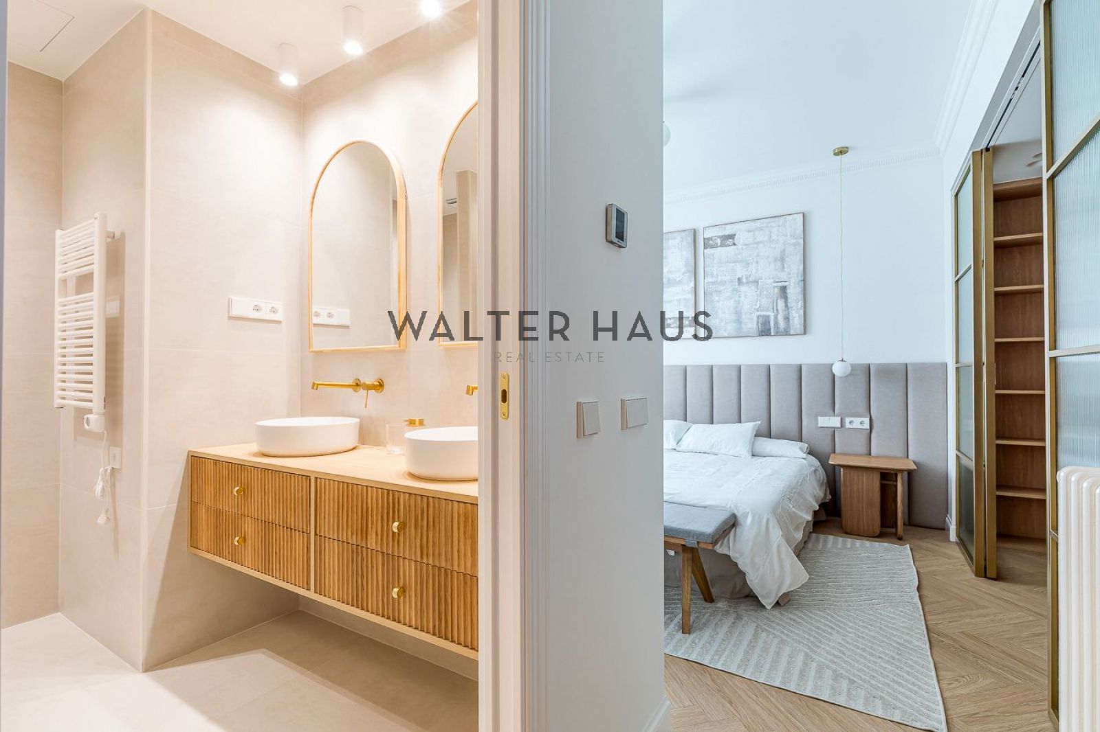 La distribució interior ha estat dissenyada acuradament per oferir el màxim confort i funcionalitat. La zona de dia s’inicia amb un rebedor elegant que condueix a un ampli saló-menjador, el qual compta amb sortida directa a la terrassa balconada. La cuina, independent i separada per una porta corredissa de vidre, es distingeix pels amplis finestrals i una distribució intel·ligent que inclou una illa central, encimera porcel·lànica amb efecte marbre i electrodomèstics d’alta gamma, garantint un espai culinari sofisticat. La zona de nit es compon de quatre dormitoris dobles amplis, tres d’ells amb bany en suite, a més d’una cambra de bany addicional i un lavabo de cortesia. La reforma ha emprat materials de primera qualitat, com terra en espiga, porcellànics de gran format als banys, fusteria lacada en blanc, motllures decoratives i panells de fusta que aporten calidesa.