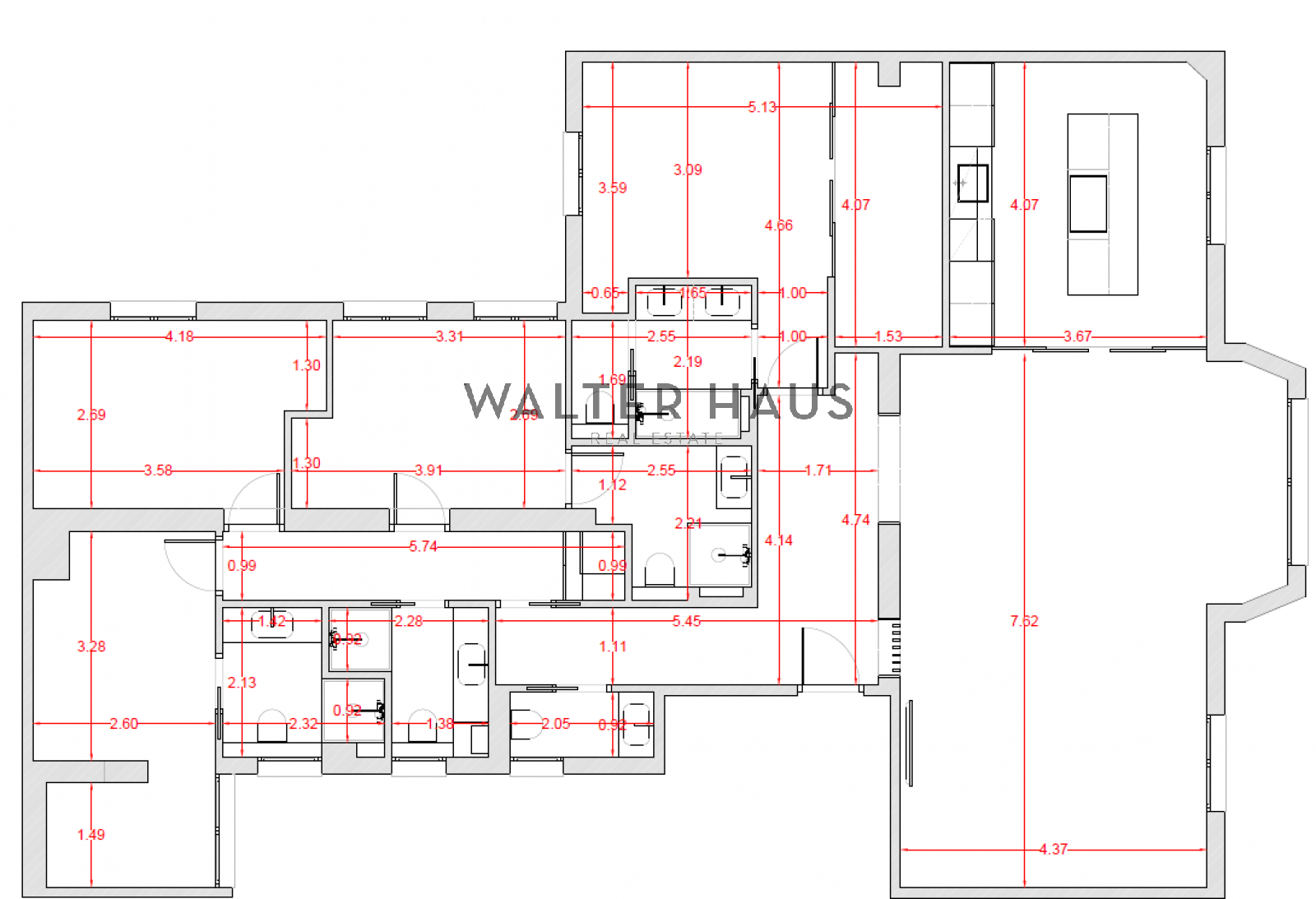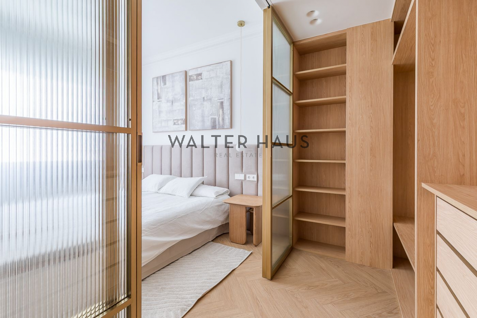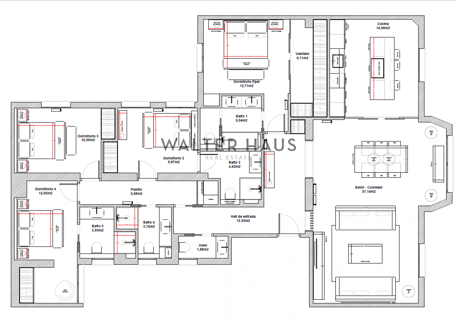La distribució interior ha estat dissenyada acuradament per oferir el màxim confort i funcionalitat. La zona de dia s’inicia amb un rebedor elegant que condueix a un ampli saló-menjador, el qual compta amb sortida directa a la terrassa balconada. La cuina, independent i separada per una porta corredissa de vidre, es distingeix pels amplis finestrals i una distribució intel·ligent que inclou una illa central, encimera porcel·lànica amb efecte marbre i electrodomèstics d’alta gamma, garantint un espai culinari sofisticat. La zona de nit es compon de quatre dormitoris dobles amplis, tres d’ells amb bany en suite, a més d’una cambra de bany addicional i un lavabo de cortesia. La reforma ha emprat materials de primera qualitat, com terra en espiga, porcellànics de gran format als banys, fusteria lacada en blanc, motllures decoratives i panells de fusta que aporten calidesa.