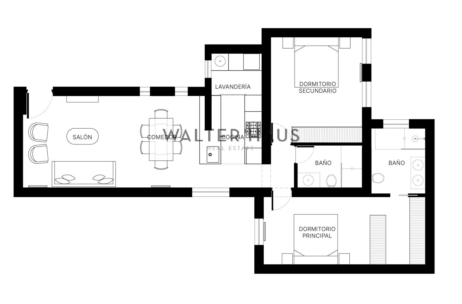 La zona privada s’organitza en dos dormitoris amplis, dissenyats per garantir el descans i la privadesa. L’habitació principal destaca per la configuració en suite, integrant un bany privat i un vestidor propi amb acabats d’alta qualitat. L’àrea social es defineix per un saló diàfan i lluminós que integra de manera natural el menjador i una cuina de concepte obert. Aquesta última es lliura completament equipada amb electrodomèstics d’alta gamma, pensats per integrar-se estèticament al mobiliari. A més, l’habitatge inclou una zona de safareig independent amb rentadora i assecadora, maximitzant la funcionalitat de la llar.