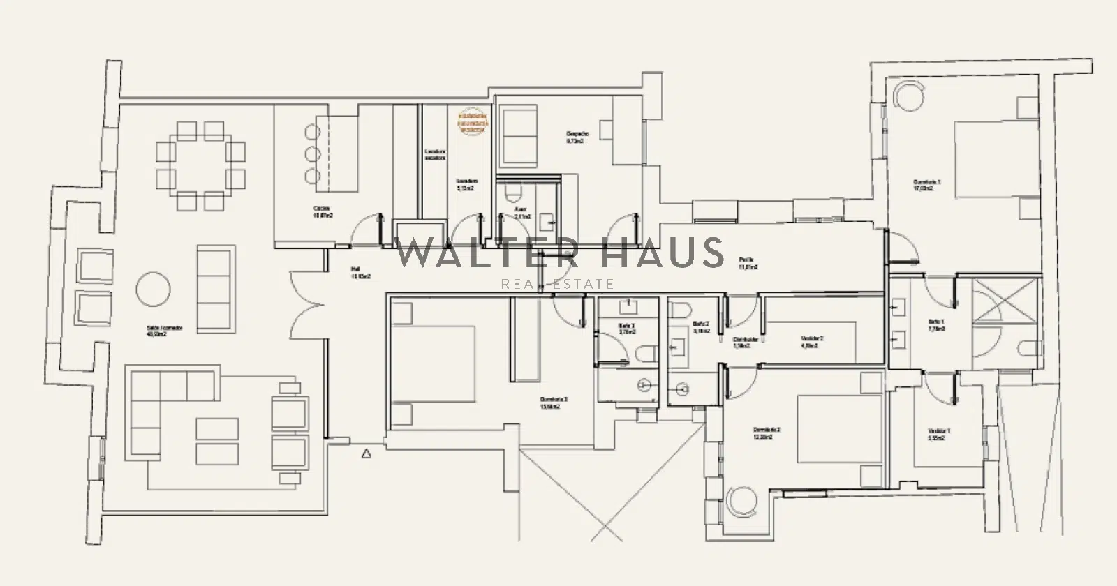 L’arquitectura interior es defineix per les seves qualitats extraordinàries i una funcionalitat impecable. L’àrea de descans compta amb tres amplis dormitoris en suite, cadascun amb bany privat, cosa que garanteix una privadesa total per als seus habitants. A més, disposa d´un lavabo de cortesia per a les visites i un despatx independent, configurat com el lloc perfecte per al teletreball o l´estudi. L’organització de la llar està reforçada per una zona de bugaderia independent, un detall tècnic que aporta ordre i comoditat a la rutina diària.