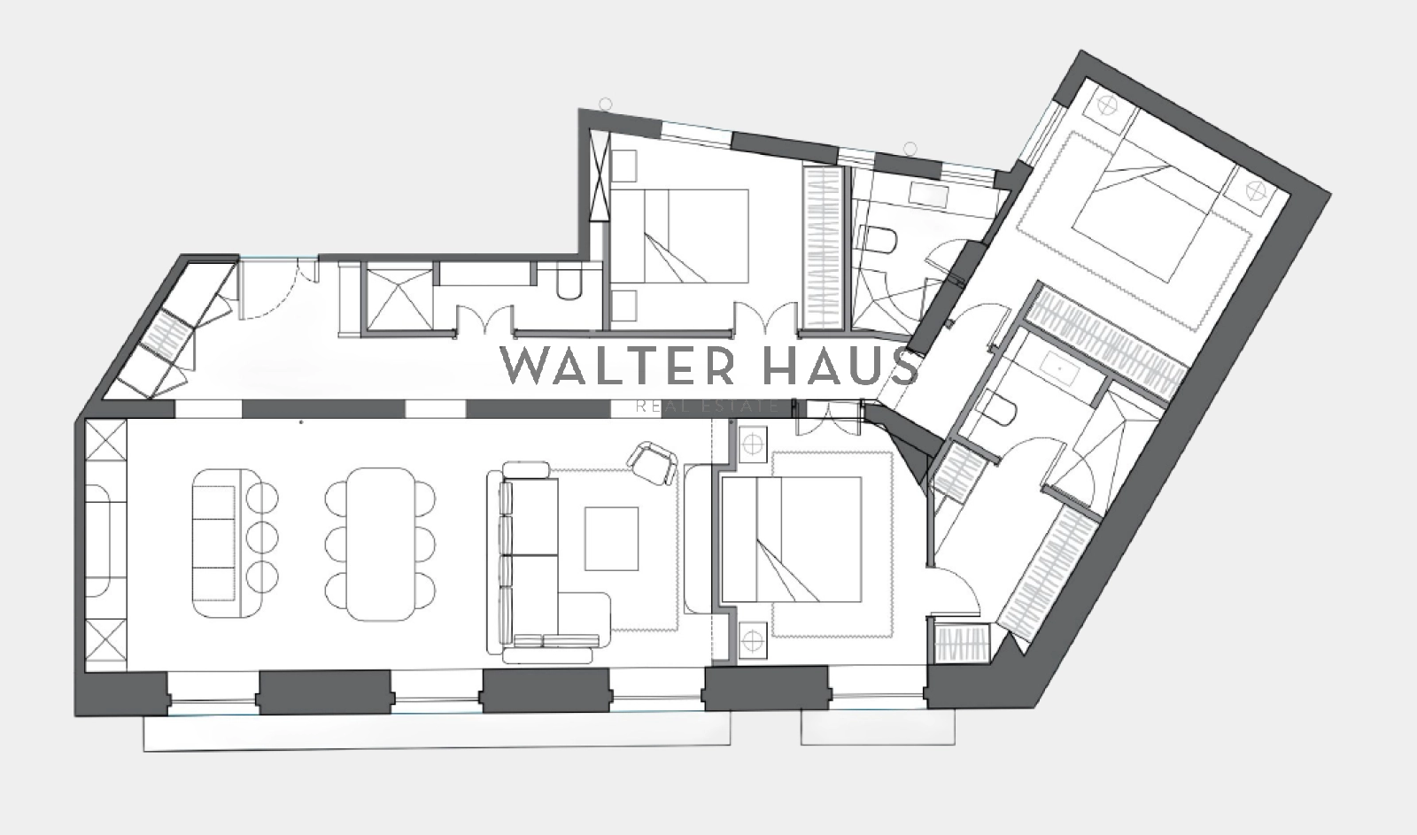 La zona de descans es compon de tres amplis dormitoris, dos amb bany en suite, completant un total de tres banys, tots amb acabats de primer nivell. La zona social gira al voltant d´un saló-menjador ampli i sofisticat, on els grans finestrals i balcons reforcen la connexió amb l´exterior i creen una atmosfera càlida i representativa. La propietat es lliura totalment moblada amb peces de disseny, integrades amb sensibilitat per respectar l’estètica original de l’edifici i adaptar-la a un estil de vida contemporani.