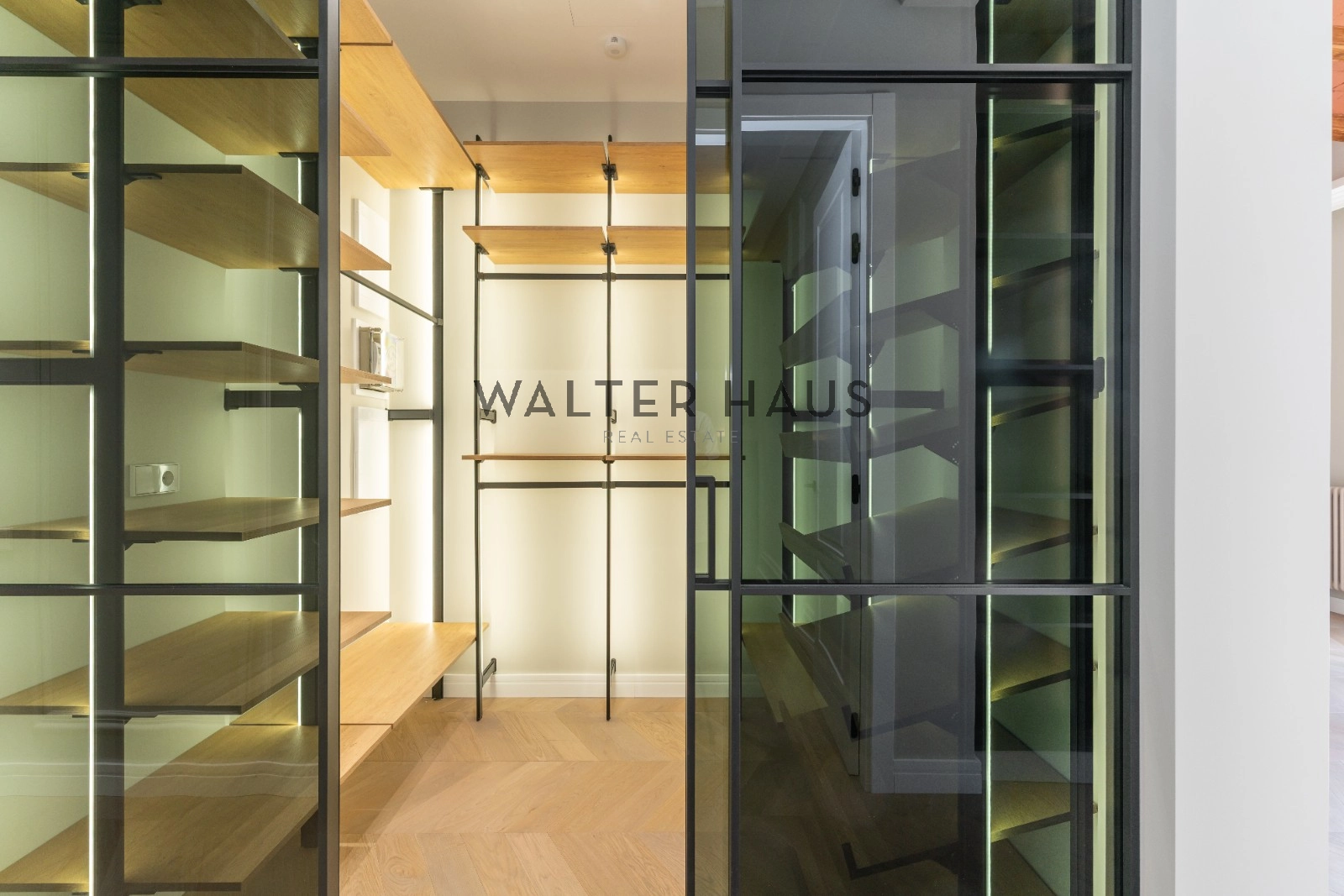 La zona de dia inclou un ampli saló, cuina moblada i menjador integrats en un espai diàfan i lluminós. L’habitatge disposa de tres balcons que afavoreixen l’entrada de llum natural, destacant els terres de parquet en espiga i el mosaic hidràulic original al vestíbul i la cuina. La zona de nit està formada per tres habitacions: una suite principal amb vestidor, bany privat i zona d’escriptori i dos dormitoris dobles que comparteixen un bany complet. Tots els banys ofereixen acabats de porcelànic d’alta qualitat, un equilibri entre estètica i durabilitat.