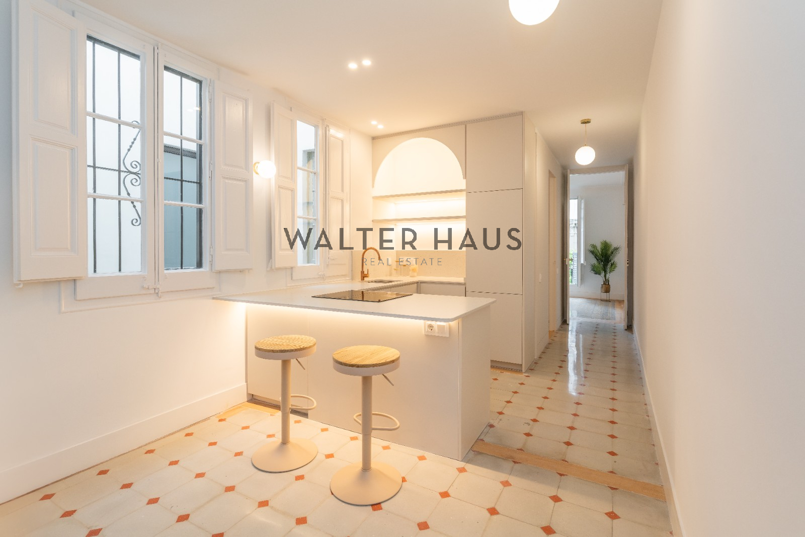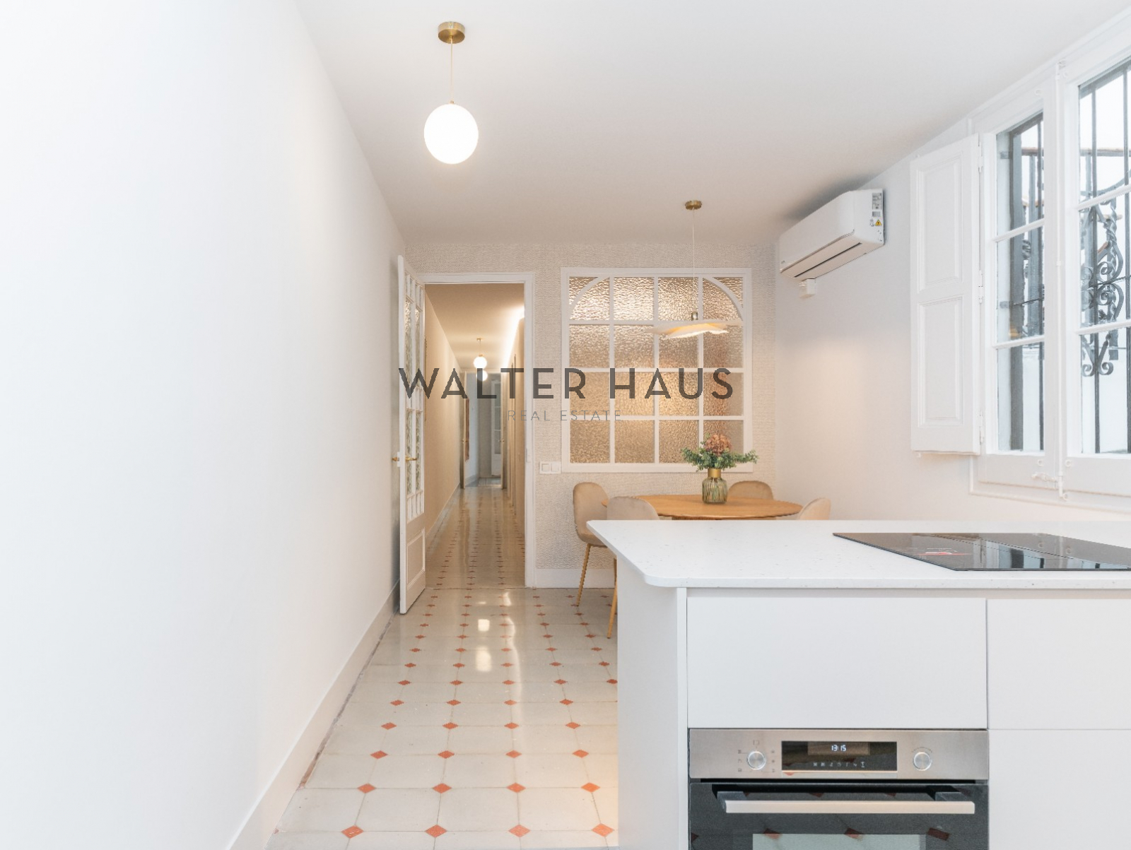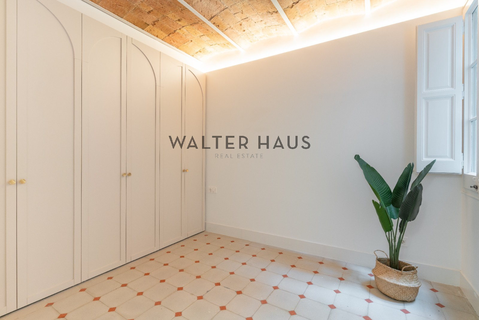 L´habitatge disposa d´un saló amb accés a un balcó dotat de vistes al´exterior, una cuina oberta tipus office amb menjador, dues habitacions dobles, una habitació amb bany en suite, una zona de bugaderia independent i un bany complet. La cuina, totalment equipada, compta amb electrodomèstics Bosch. Els elements originals, com ara els sòls hidràulics i la volta catalana aporten caràcter i autenticitat al conjunt. Tot el disseny compta amb detalls de la més alta qualitat i sostenibilitat. A més, lentrada principal compta amb una doble porta blindada i càmeres per reforçar la seguretat de la propietat.