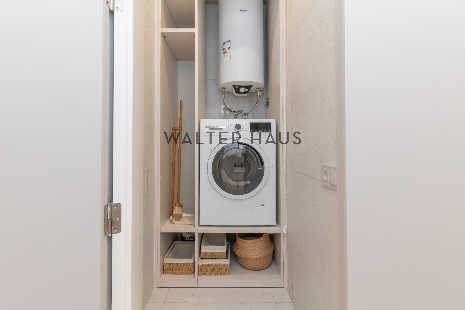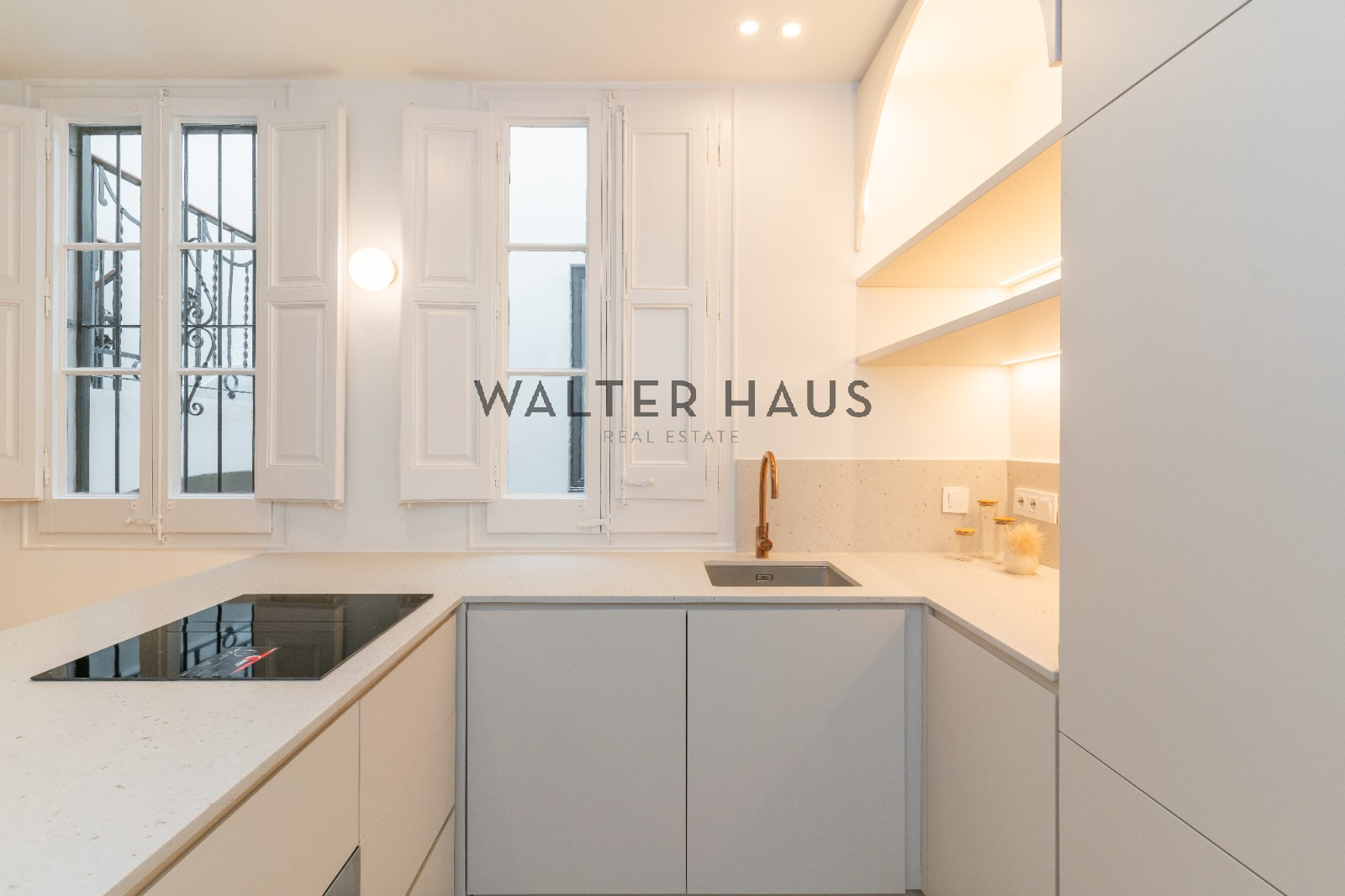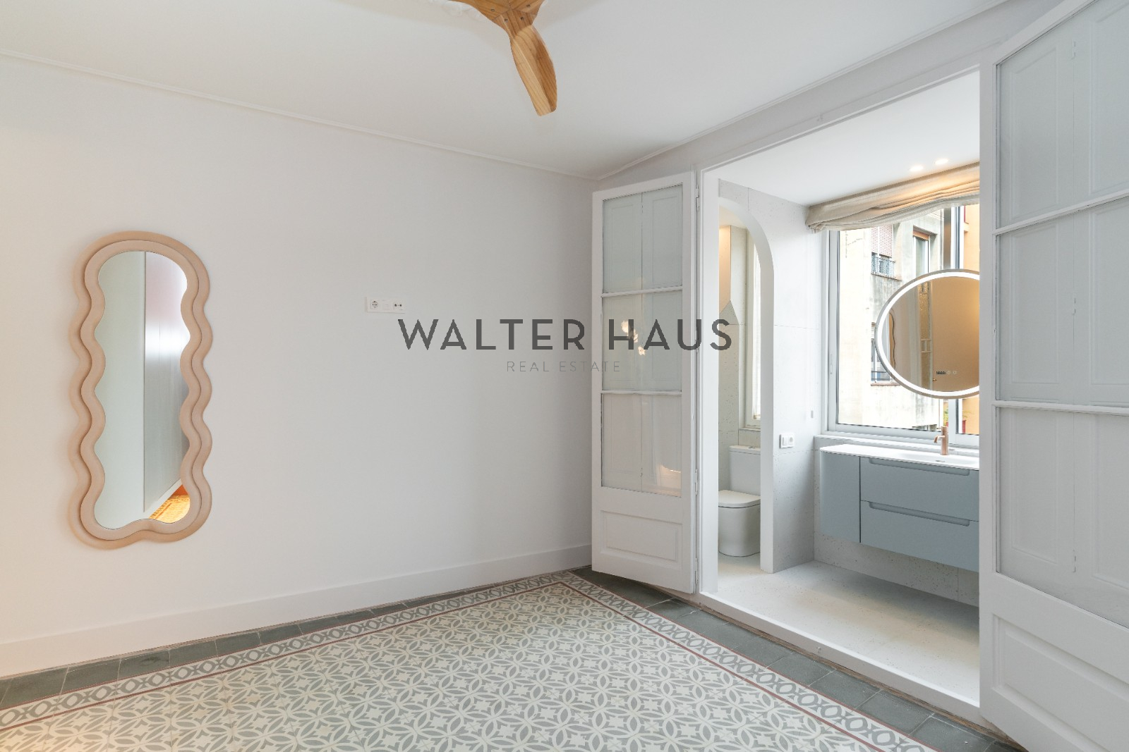 L´habitatge disposa d´un saló amb accés a un balcó dotat de vistes al´exterior, una cuina oberta tipus office amb menjador, dues habitacions dobles, una habitació amb bany en suite, una zona de bugaderia independent i un bany complet. La cuina, totalment equipada, compta amb electrodomèstics Bosch. Els elements originals, com ara els sòls hidràulics i la volta catalana aporten caràcter i autenticitat al conjunt. Tot el disseny compta amb detalls de la més alta qualitat i sostenibilitat. A més, lentrada principal compta amb una doble porta blindada i càmeres per reforçar la seguretat de la propietat.