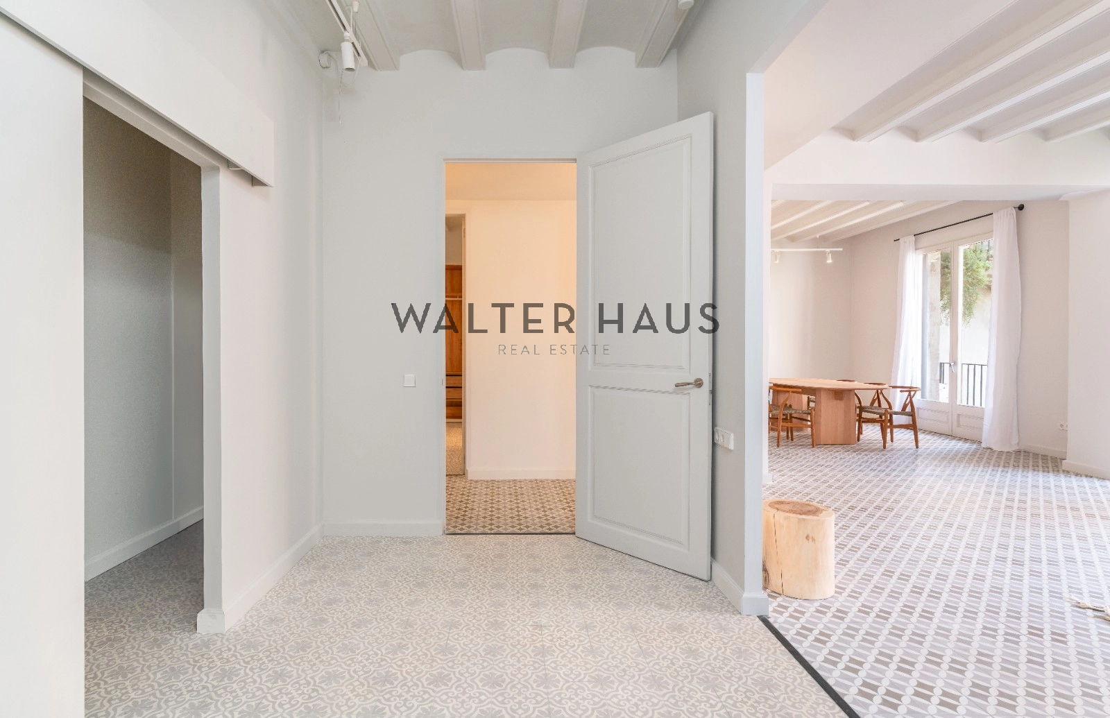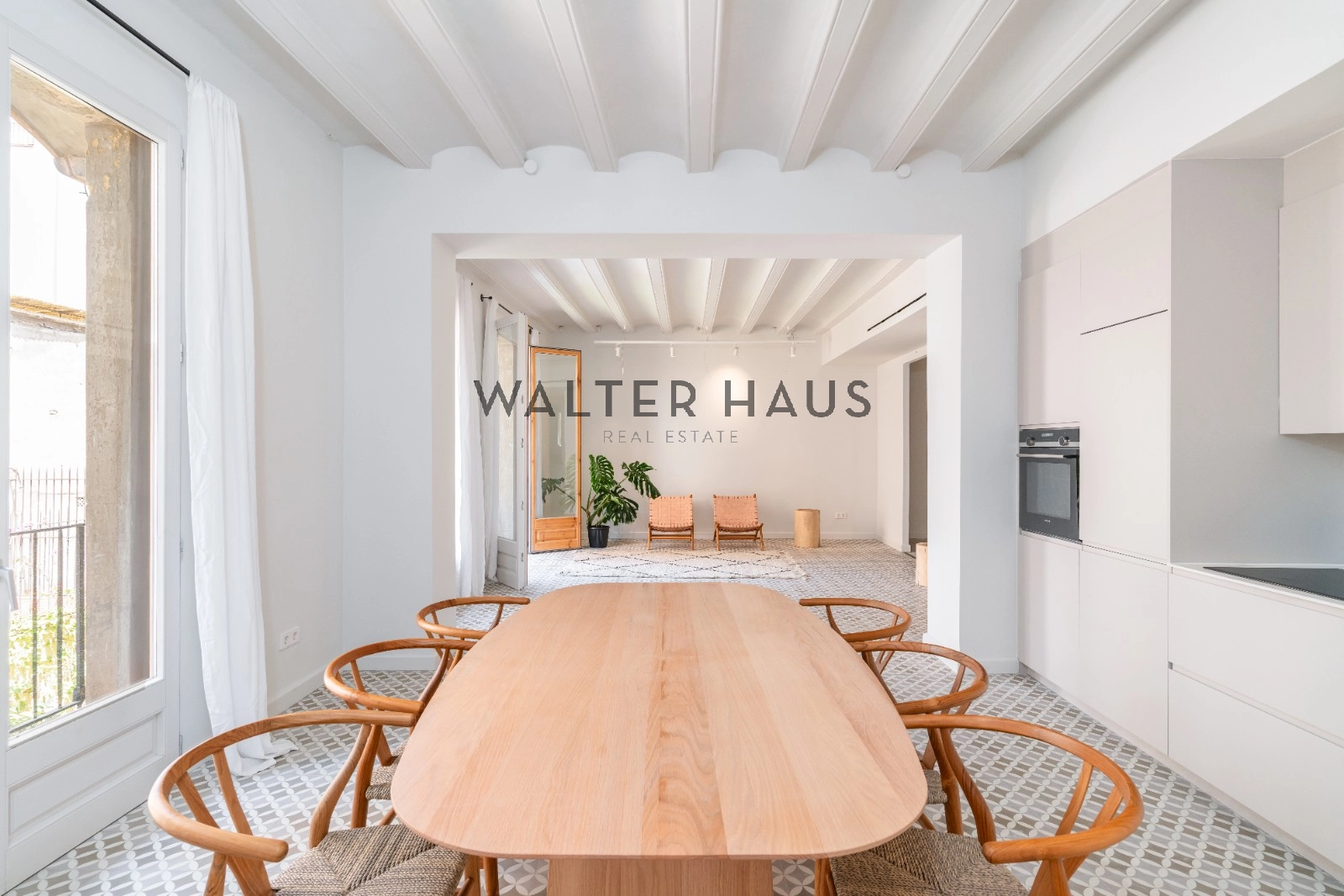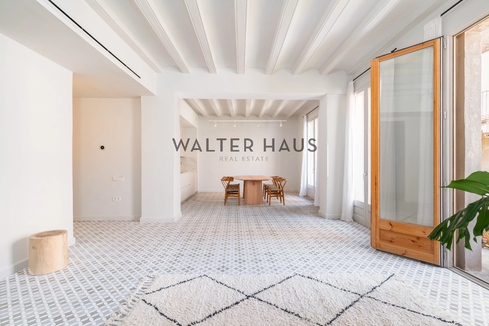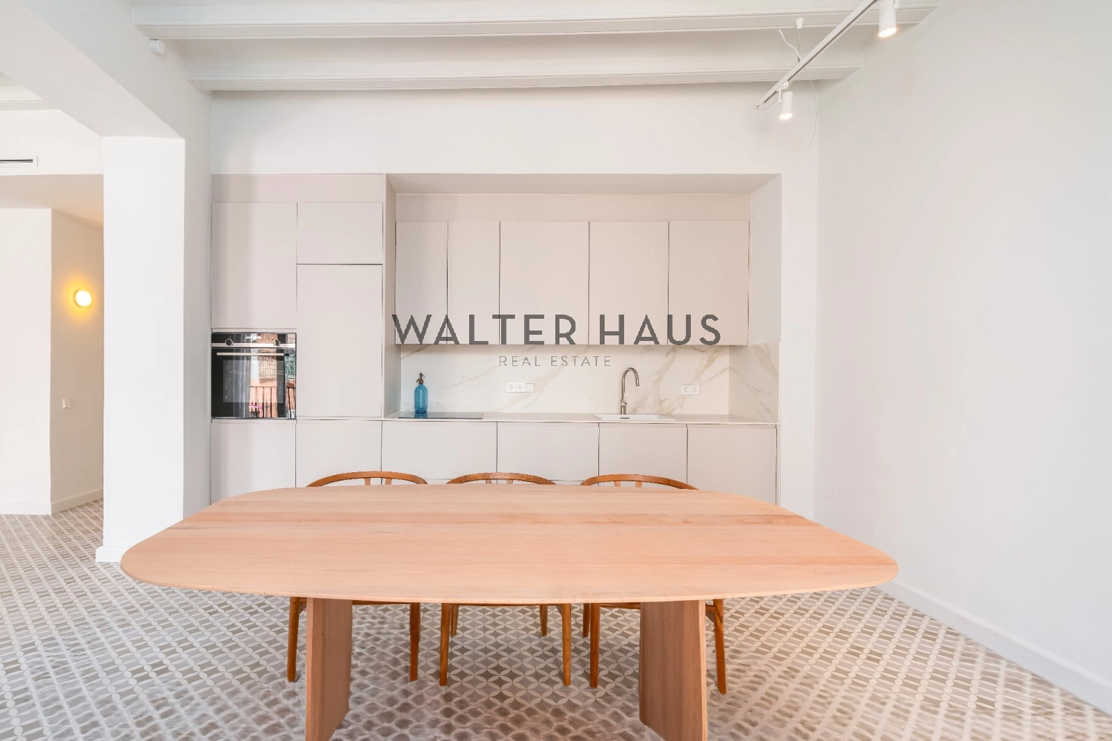Exclusiu pis de 137 m² construïts completament reformat al cor de Barcelona. L’habitatge destaca per la seva acurada rehabilitació que respecta els elements originals com les bigues de fusta als sostres i els terres hidràulics, integrant alhora acabats moderns de gran qualitat. Orientat cap a un tranquil pati interior, garanteix una atmosfera silenciosa i agradable, una característica molt valorada en una zona tan cèntrica.