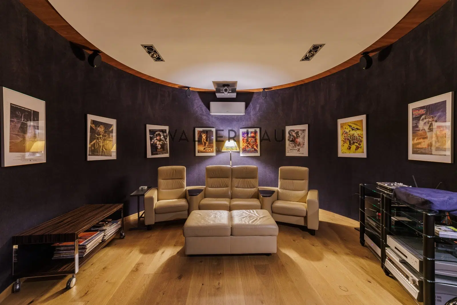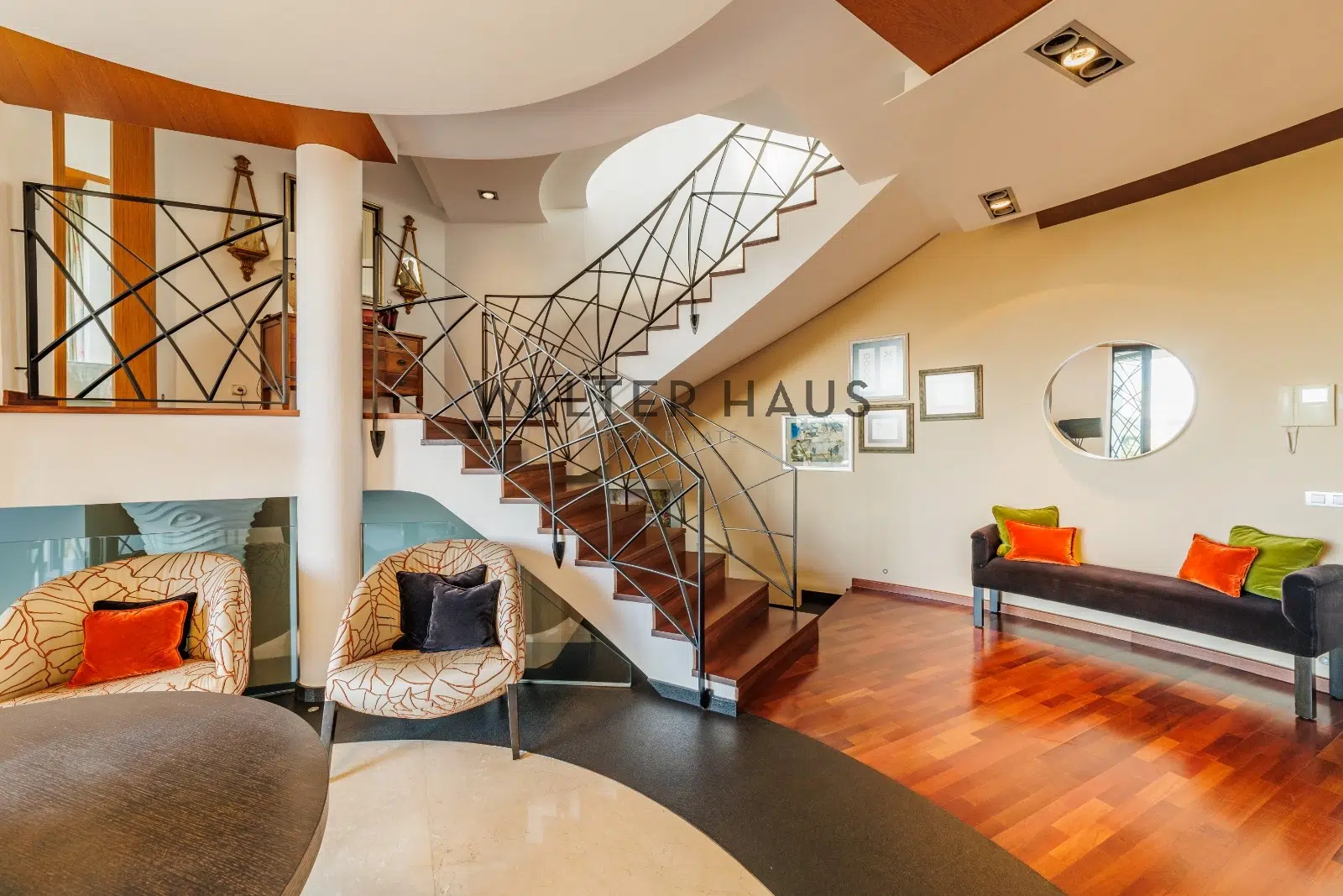 Aquesta propietat compta amb sis àmplies habitacions en suite, vuit banys, una sala de cinema insonoritzada, una cuina totalment equipada, menjador, gimnàs, spa, oficina i una sala de jocs. A la planta intermèdia hi trobem un vestíbul rodó amb terra de marbre i una escala de marbre negre de Zimbabwe que donen accés a 5 de les suites ia un ampli vestidor. La planta superior acull el saló-menjador de concepte obert que té accés a la terrassa amb piscina i jacuzzi. Alhora, des del saló podem passar a la sisena suite amb sortida privada. A més d’això, la casa compta amb un espai per aparcar 5 vehicles (inclòs en el preu), un traster, armaris de paret, calefacció central, piscina i un sistema d’energia solar per a més eficiència.