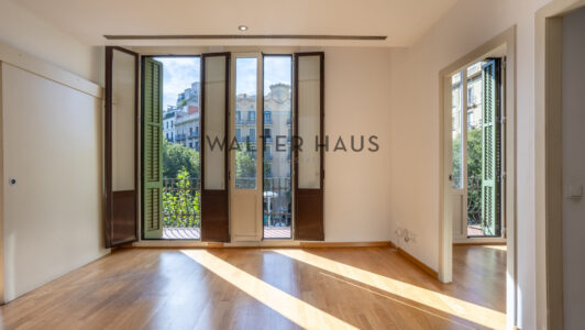 The open-plan kitchen, equipped with high-end appliances, flows seamlessly into the living room, creating a spacious and bright environment where natural light highlights the warmth of the materials and quality finishes. The apartment boasts two large double bedrooms, one of which is en suite, and a dressing room designed to be shared by both, offering a practical and sophisticated solution. It also includes a second full bathroom that doubles as a guest toilet. Its spaciousness and light make each room a welcoming and elegant space, ideal for those seeking a home with character in the heart of Barcelona.