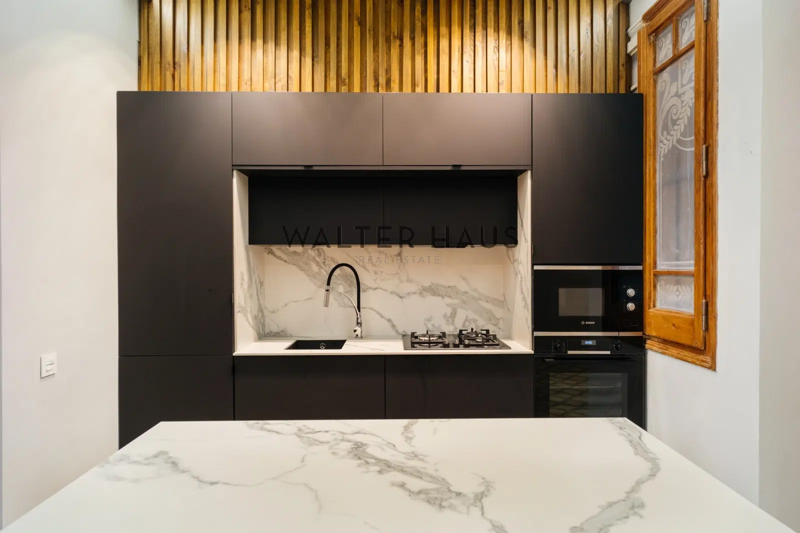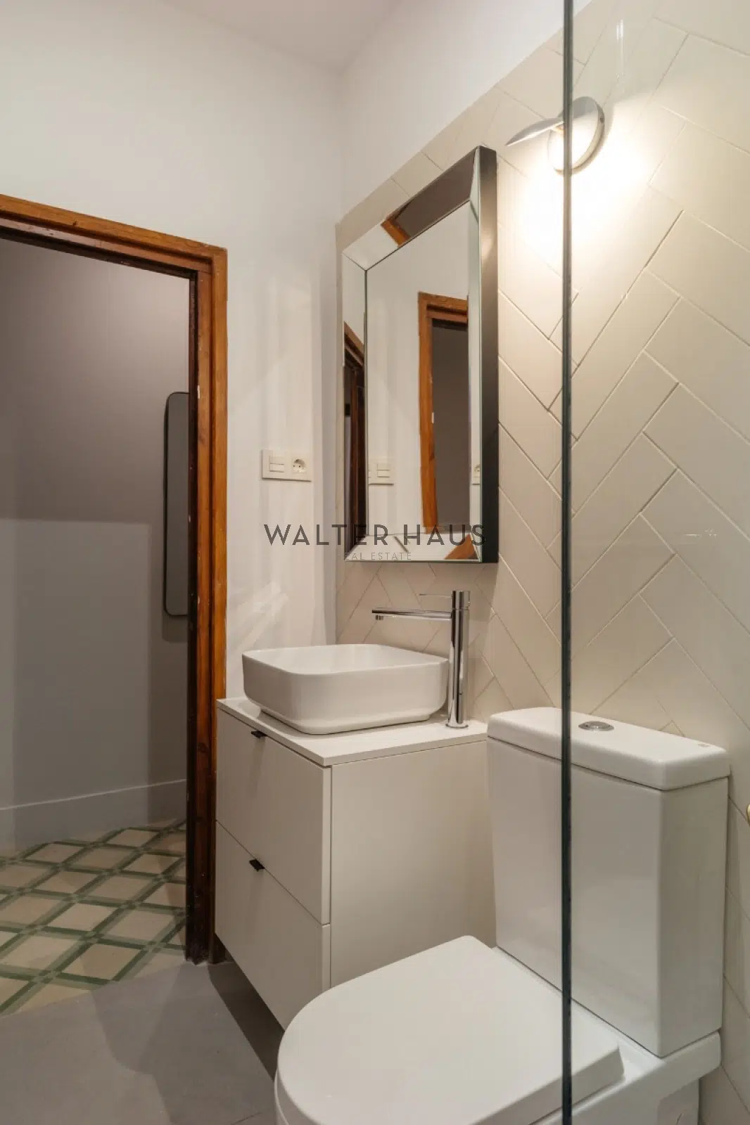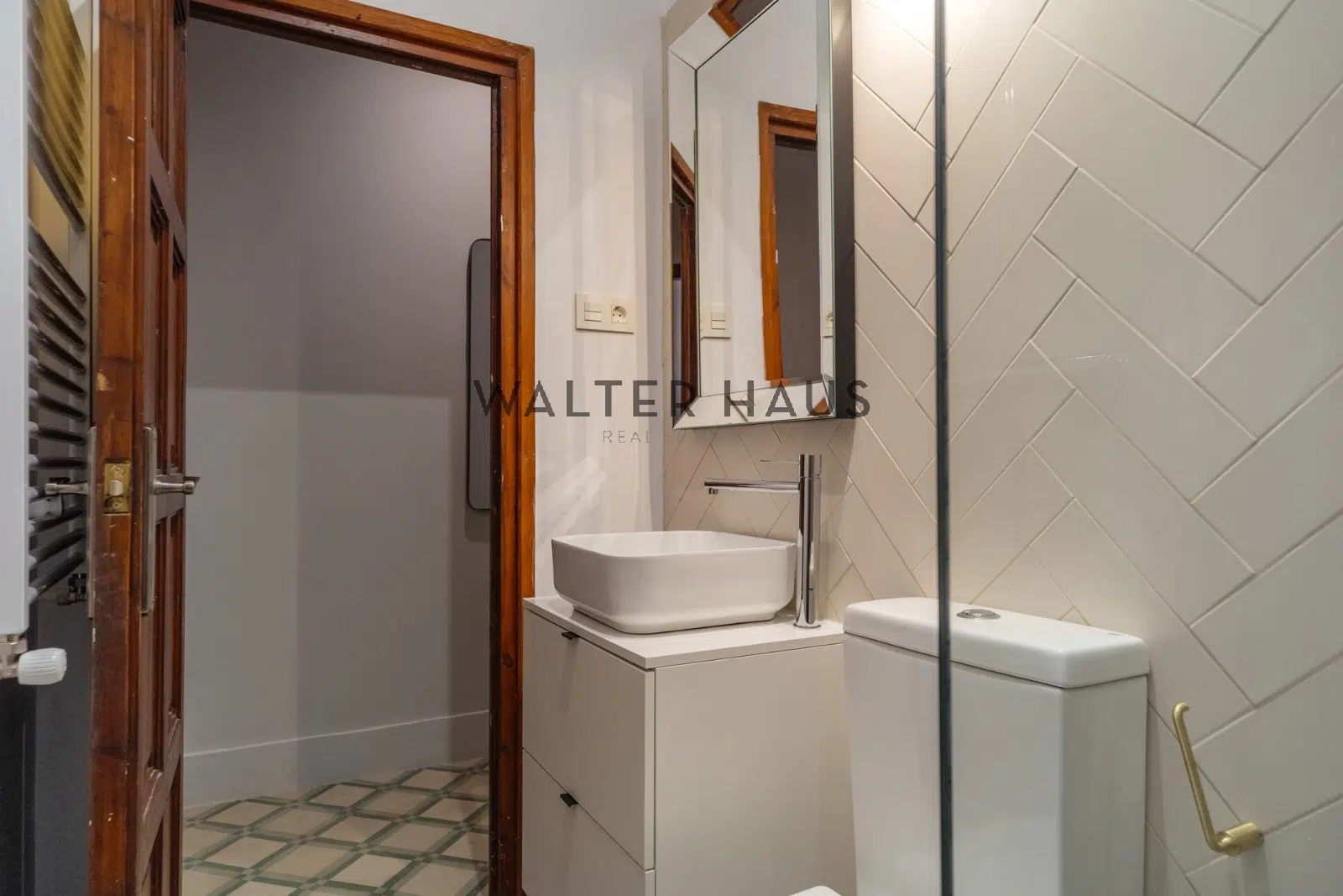 The interior design includes a 30 m² master suite with a private gallery that floods the space with natural light, accompanied by a modern bathroom with a high-quality shower. The distribution is completed with a spacious living room integrated with a contemporary kitchen, ideal for those looking for a comfortable and fluid environment. The large doors with windows provide light and connect with the charming balconies that offer views of the street.