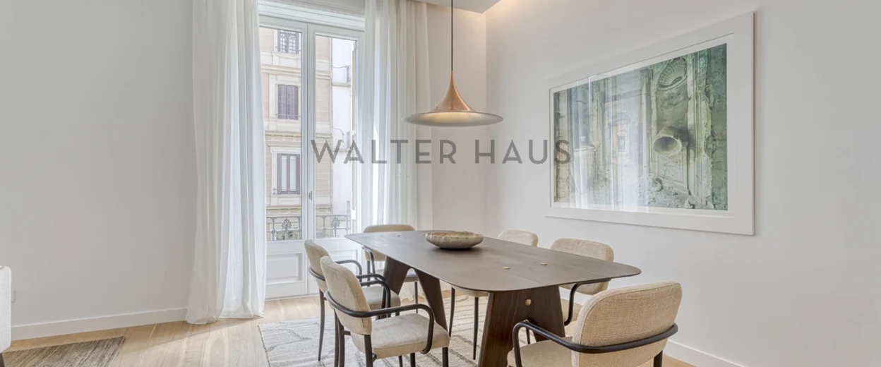 Exclusive 126 m² apartment located in a renovated building on Passeig de Gràcia, one of Barcelona’s most iconic avenues. The apartment features a spacious and bright living-dining room with access to two balconies that provide natural light throughout the day. The open-plan kitchen features a contemporary design and is equipped with high-end appliances, including a Liebherr wine cellar. The spaces are designed to offer functionality, comfort, and contemporary style.