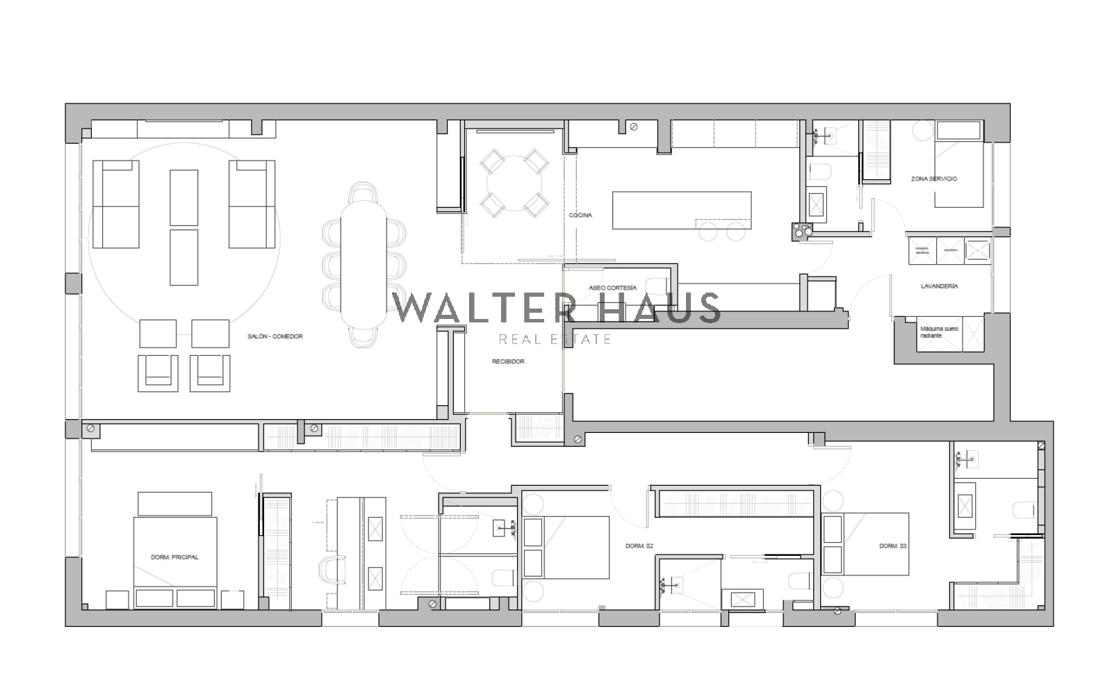 Inside the apartment, the design and materials have been exquisitely selected, incorporating a radiant floor heating system that guarantees an ideal and uniform climate in every room. The sleeping area comprises four en-suite bedrooms, each with its own private bathroom, plus a guest toilet. The social area is perfectly defined, offering spacious living rooms and two separate dining rooms: one formal for special occasions and another for everyday family life. Furthermore, functionality is enhanced by a separate laundry area and high-quality finishes.