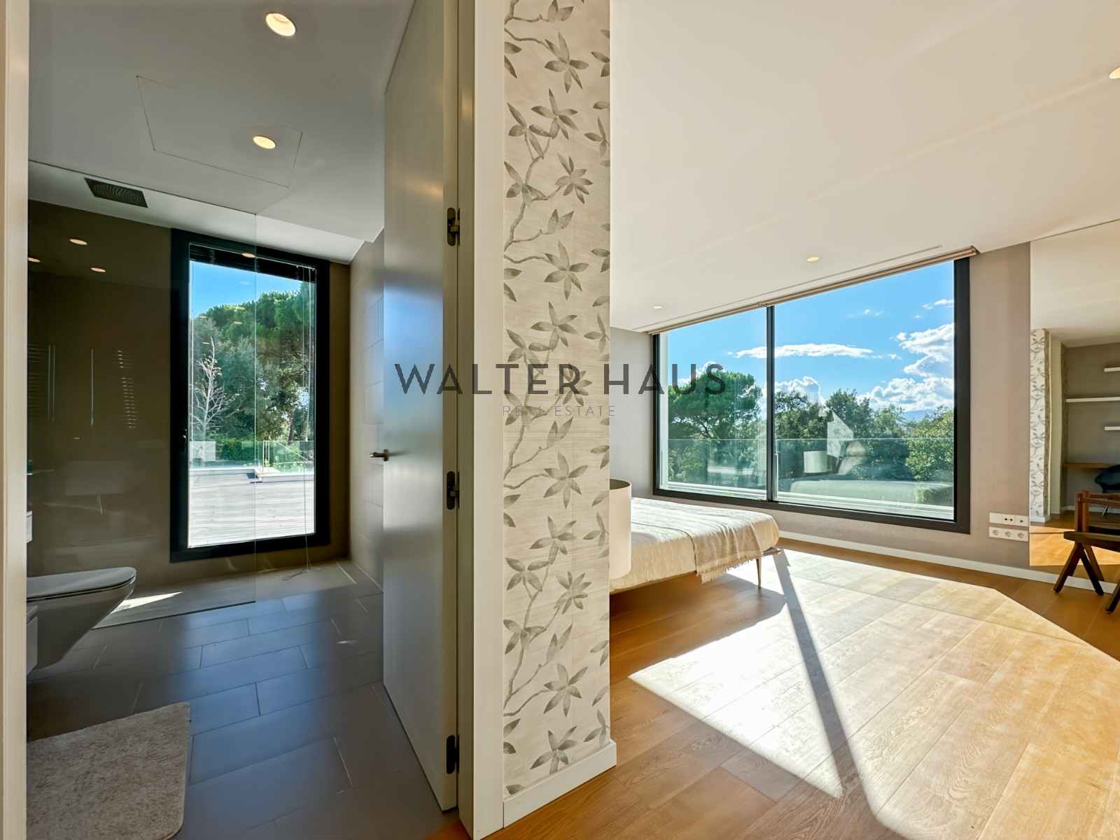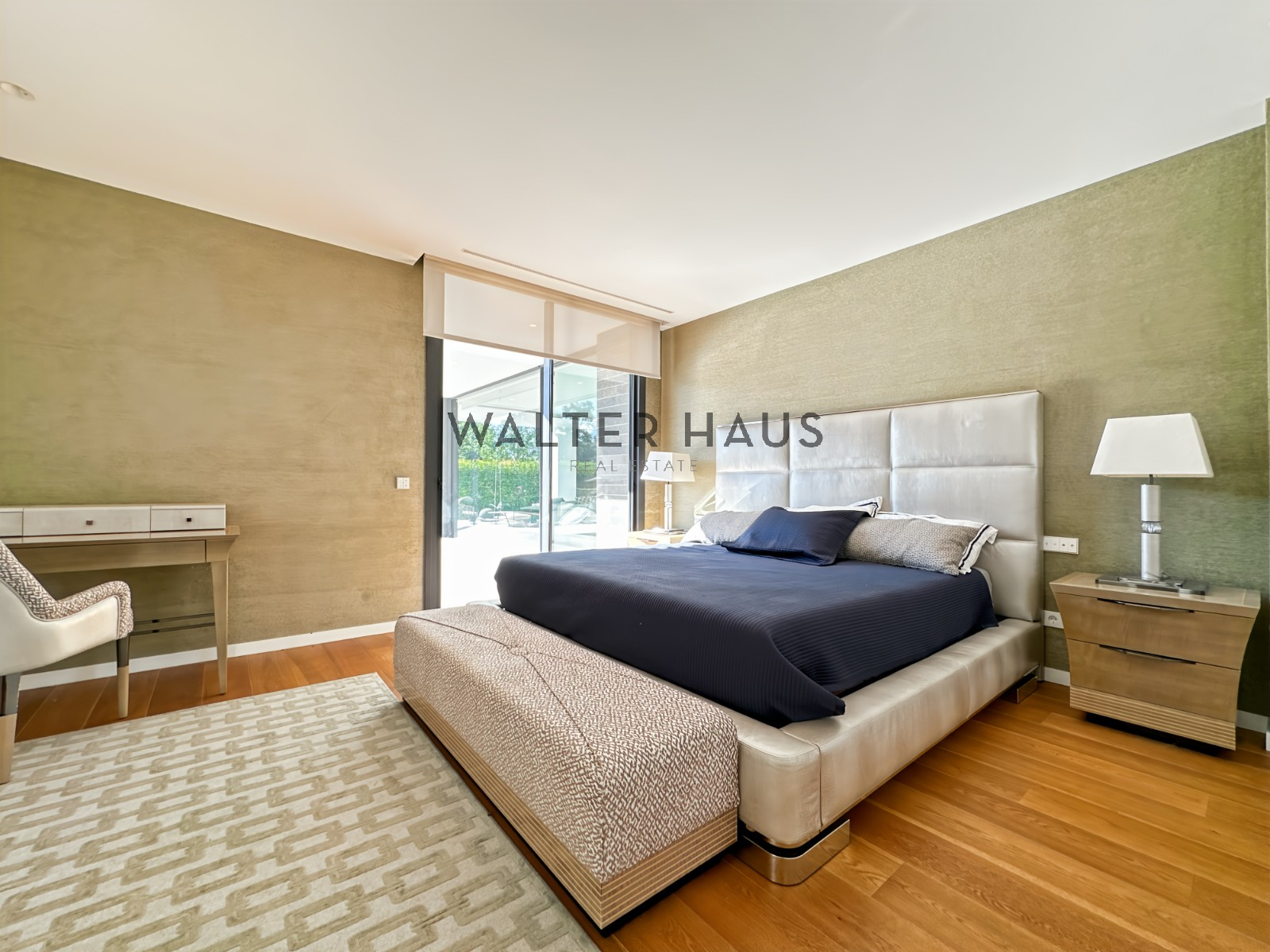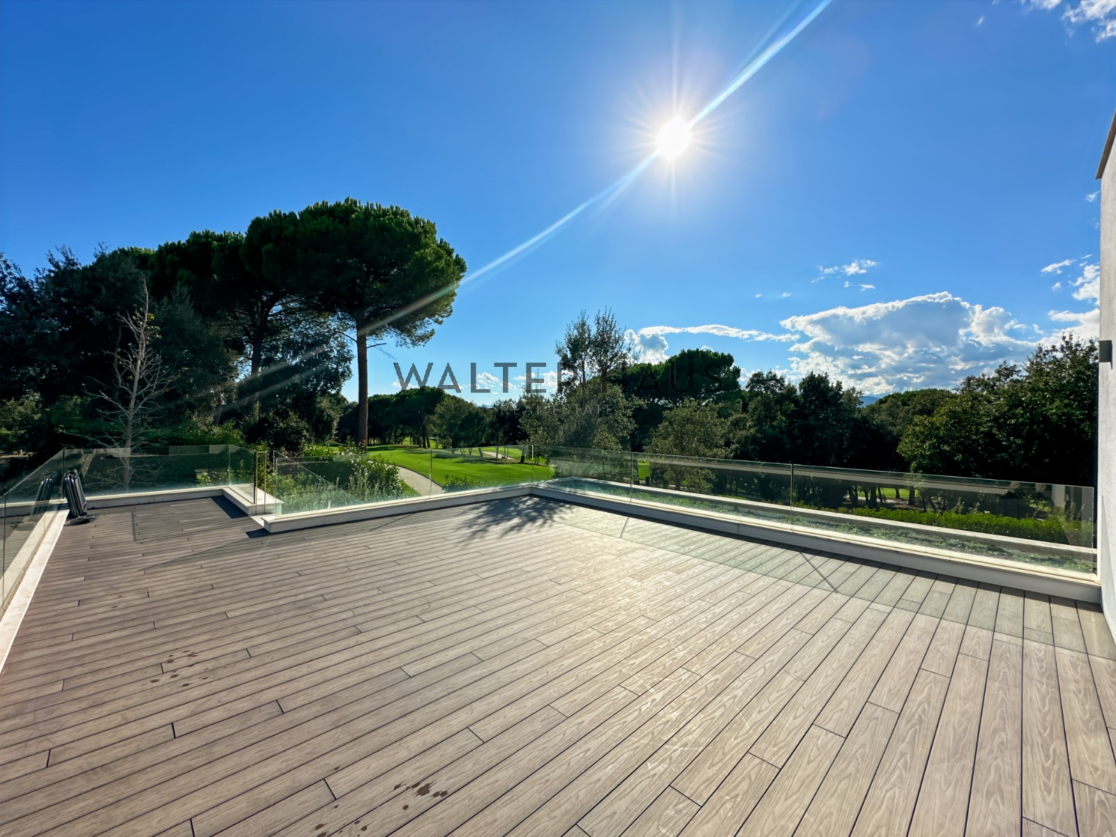 From the main entrance, located on the first floor, you access the master bedroom with direct access to the garden and views of the golf course.