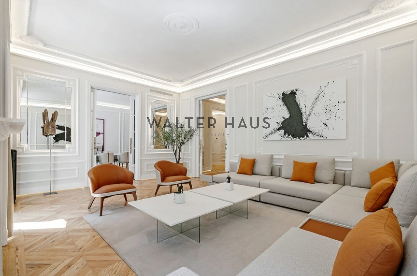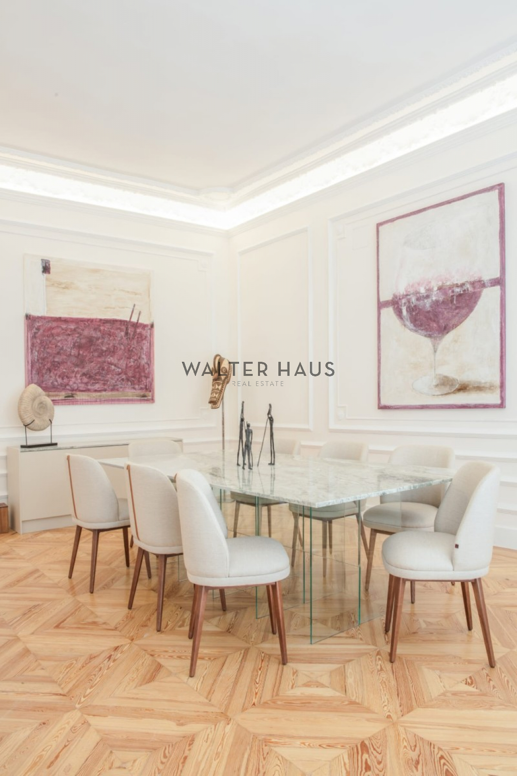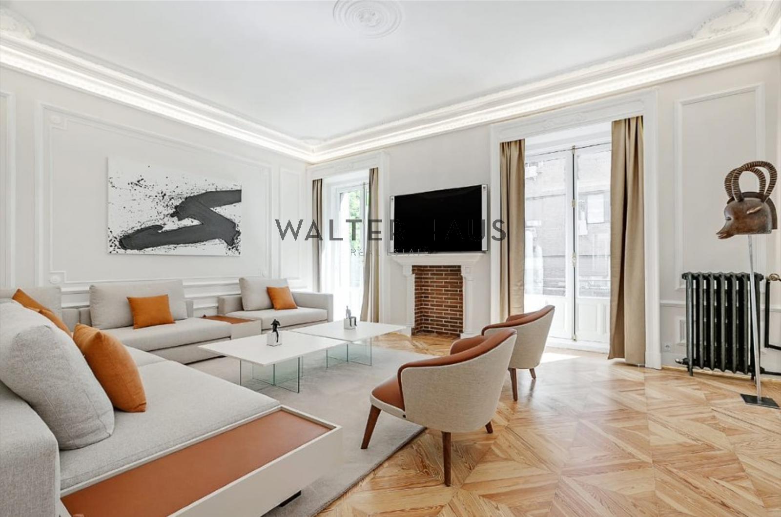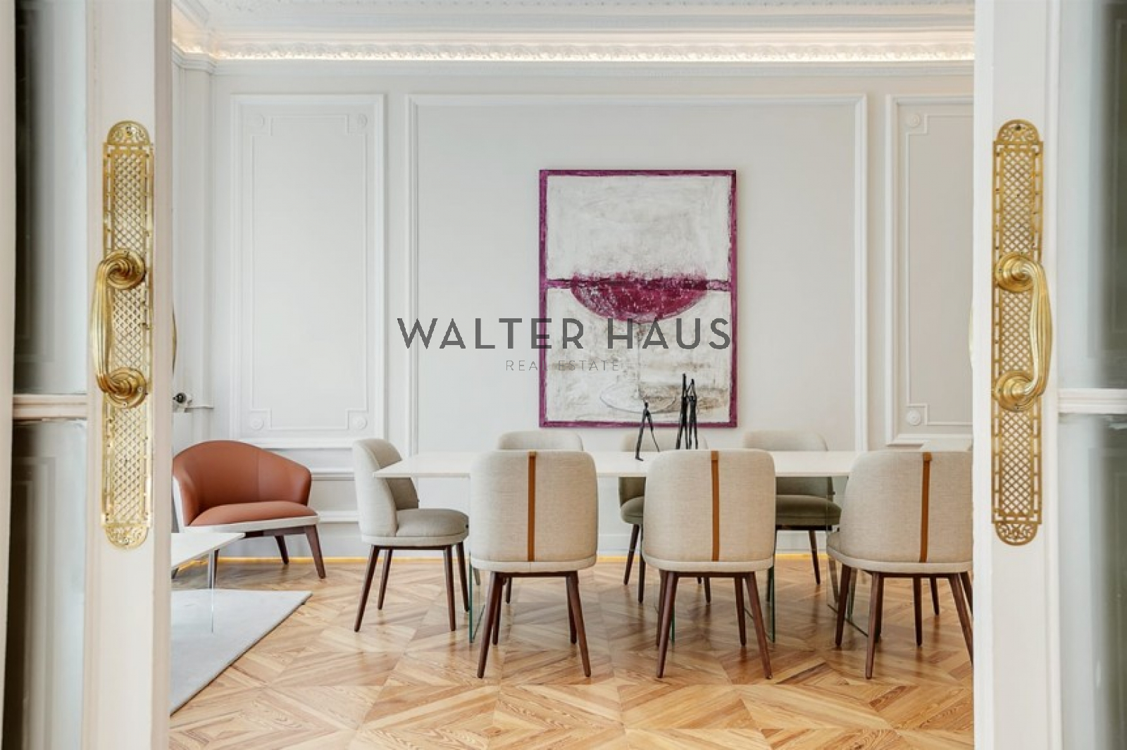 Located on a second floor with a 470 m2 exterior, this fabulous apartment with high ceilings and fascinating moldings is fully furnished and consists of a spacious open-plan living room with two large balconies with green views, providing a wonderful flood of natural light. There is a large L-shaped sofa with large coffee tables. In a separate room, separated by beautiful sliding wooden doors, there is a spacious dining room with seating for up to 2 guests, with access to a third bay window with large windows and green views, ideal for use as a reading area.