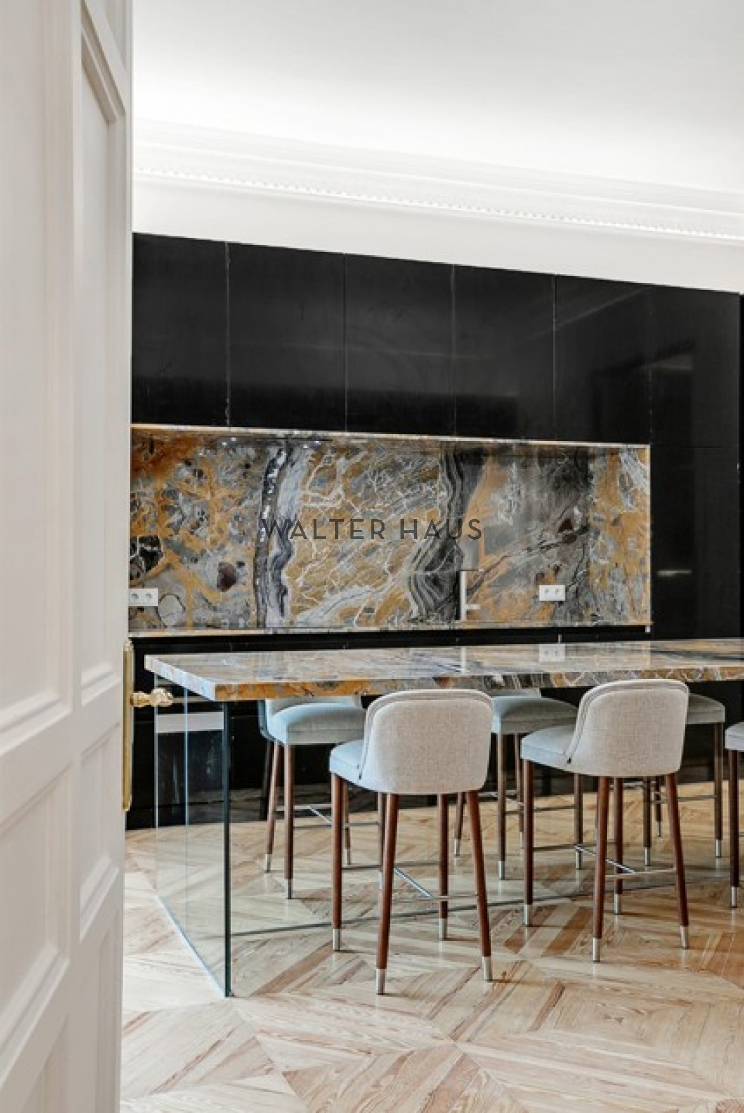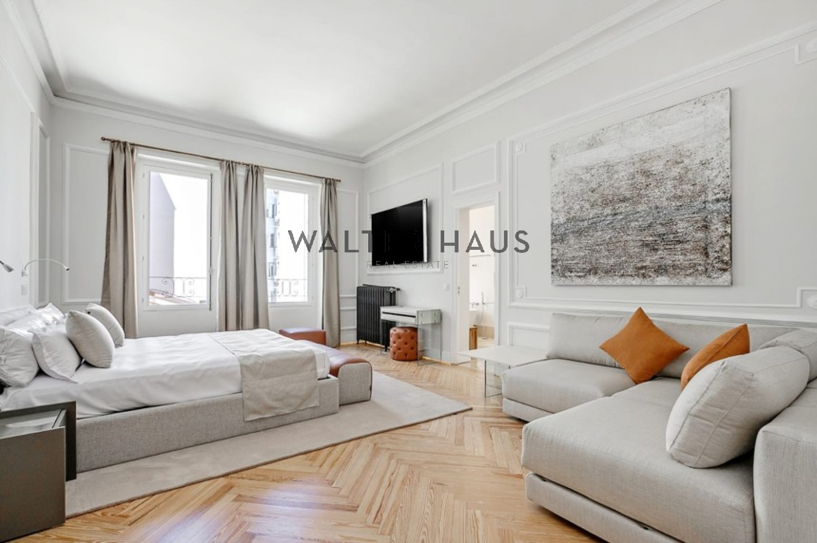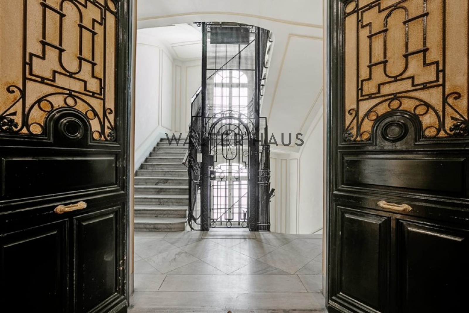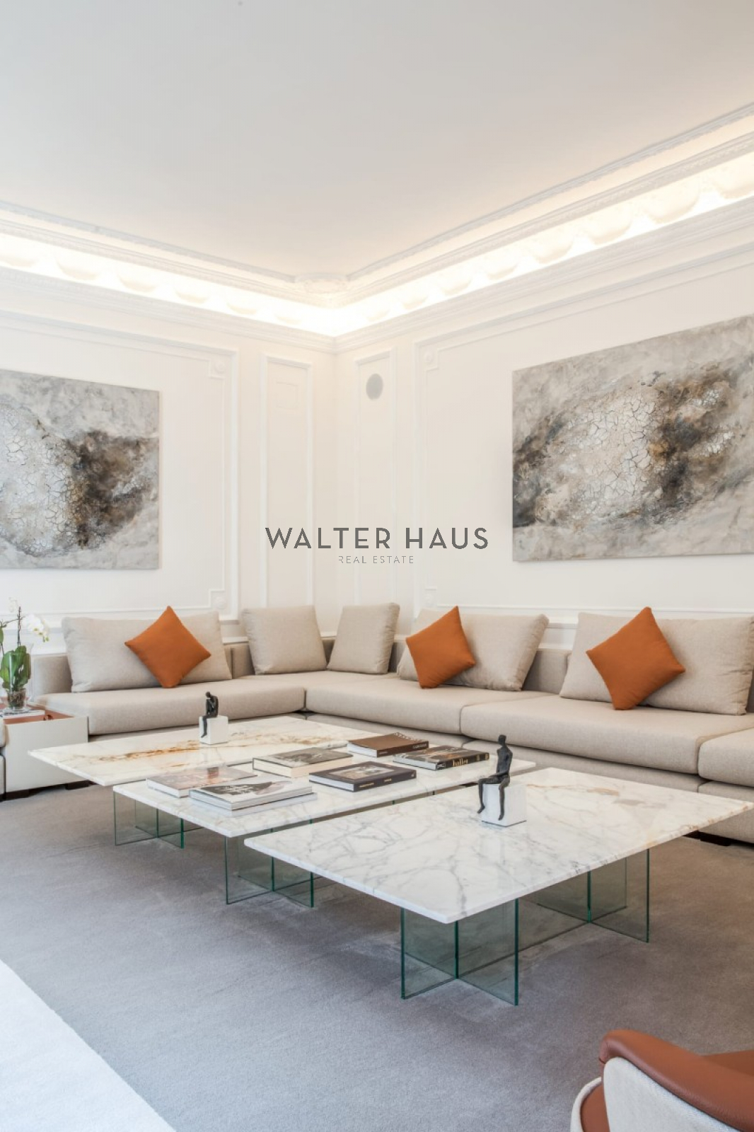 Located on a second floor with a 470 m2 exterior, this fabulous apartment with high ceilings and fascinating moldings is fully furnished and consists of a spacious open-plan living room with two large balconies with green views, providing a wonderful flood of natural light. There is a large L-shaped sofa with large coffee tables. In a separate room, separated by beautiful sliding wooden doors, there is a spacious dining room with seating for up to 2 guests, with access to a third bay window with large windows and green views, ideal for use as a reading area.