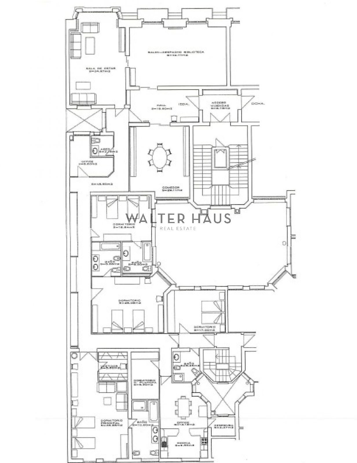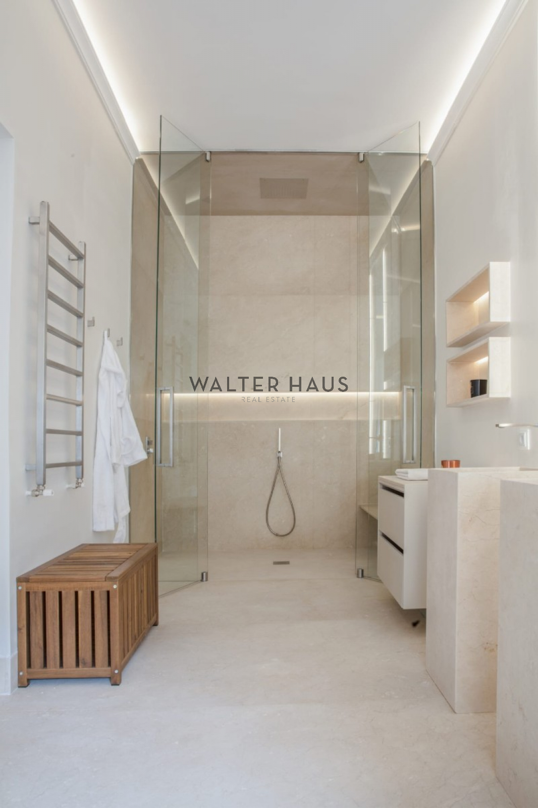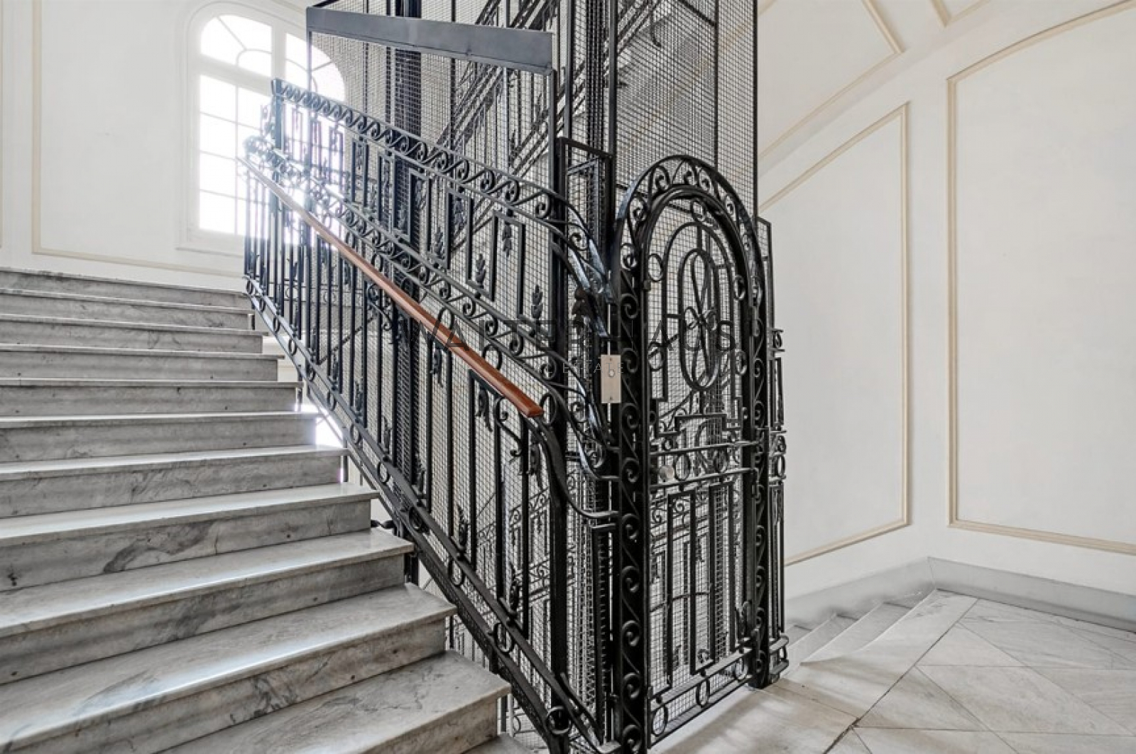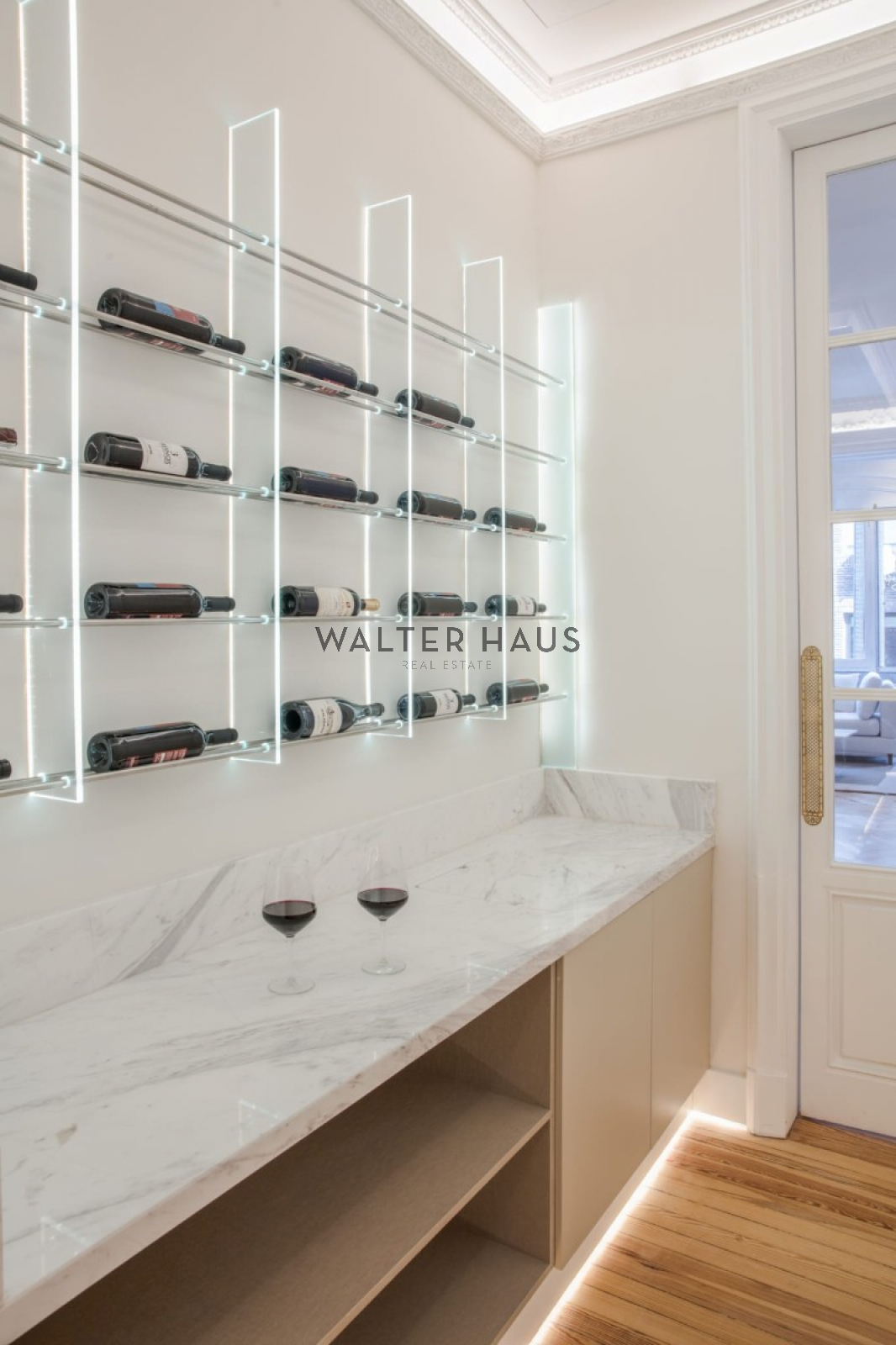 Located on a second floor with a 470 m2 exterior, this fabulous apartment with high ceilings and fascinating moldings is fully furnished and consists of a spacious open-plan living room with two large balconies with green views, providing a wonderful flood of natural light. There is a large L-shaped sofa with large coffee tables. In a separate room, separated by beautiful sliding wooden doors, there is a spacious dining room with seating for up to 2 guests, with access to a third bay window with large windows and green views, ideal for use as a reading area.