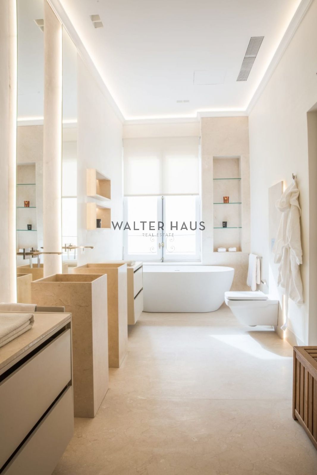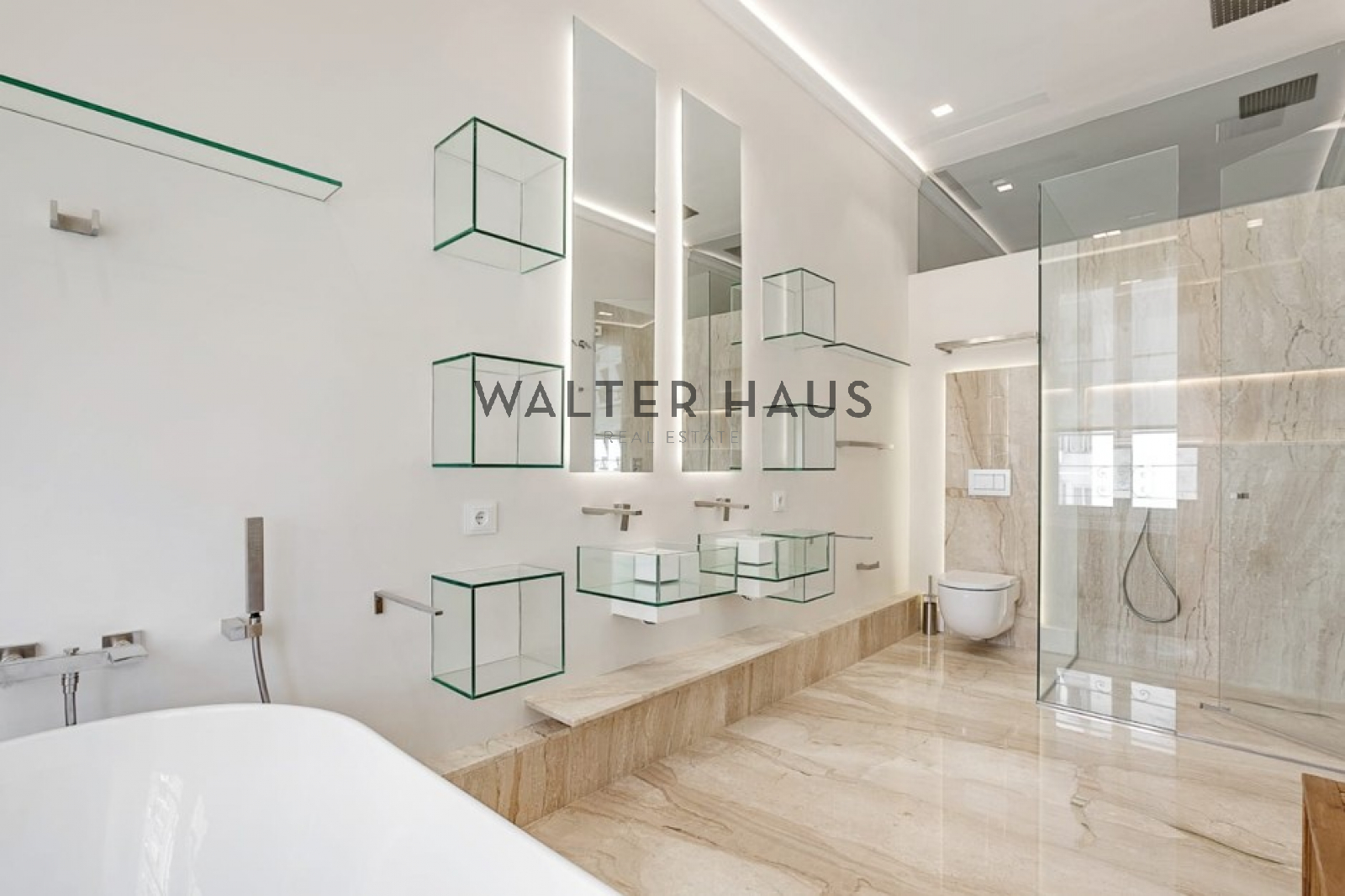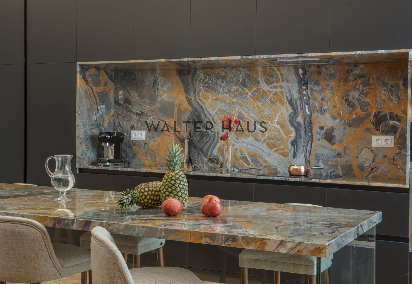 Continuing further, you can see a large kitchen with plenty of storage space and all the necessary built-in appliances, matching the entire decor. There is a large marble countertop with capacity for up to 6 guests. Nearby, there is a guest toilet with everything you need and a laundry room with a washer, dryer, storage unit, and more.