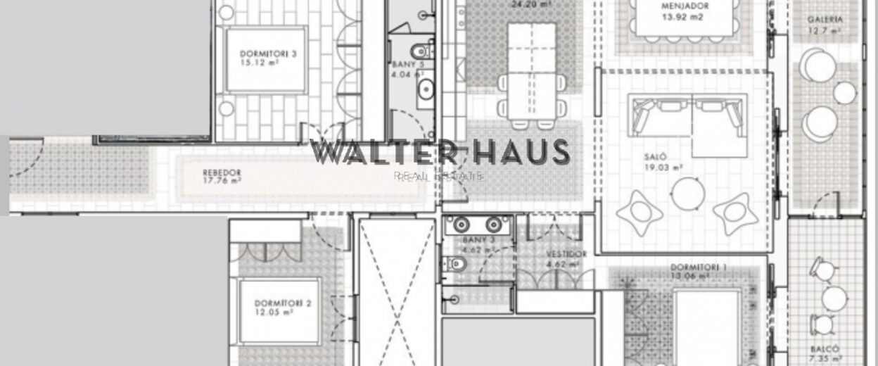 The property has three bedrooms, one en-suite with a bathroom, dressing room, and access to the 20 m² balcony that connects to the gallery, and two double bedrooms. There is also an additional full bathroom in the apartment. It features a large kitchen-diner with a central breakfast bar, equipped with stainless steel cabinets and appliances by Gaggenau, Siemens, and Liebherr. Connected to the kitchen is the spacious living-dining room with access to the gallery that connects to the balcony of the master bedroom, ideal for those who want to enjoy natural light and views of the outdoors. The high-end finishes include original Nolla mosaic floors, porcelain tile wall tiles, a Roca shower tray, and ICONIC stainless steel faucets in the bathrooms.