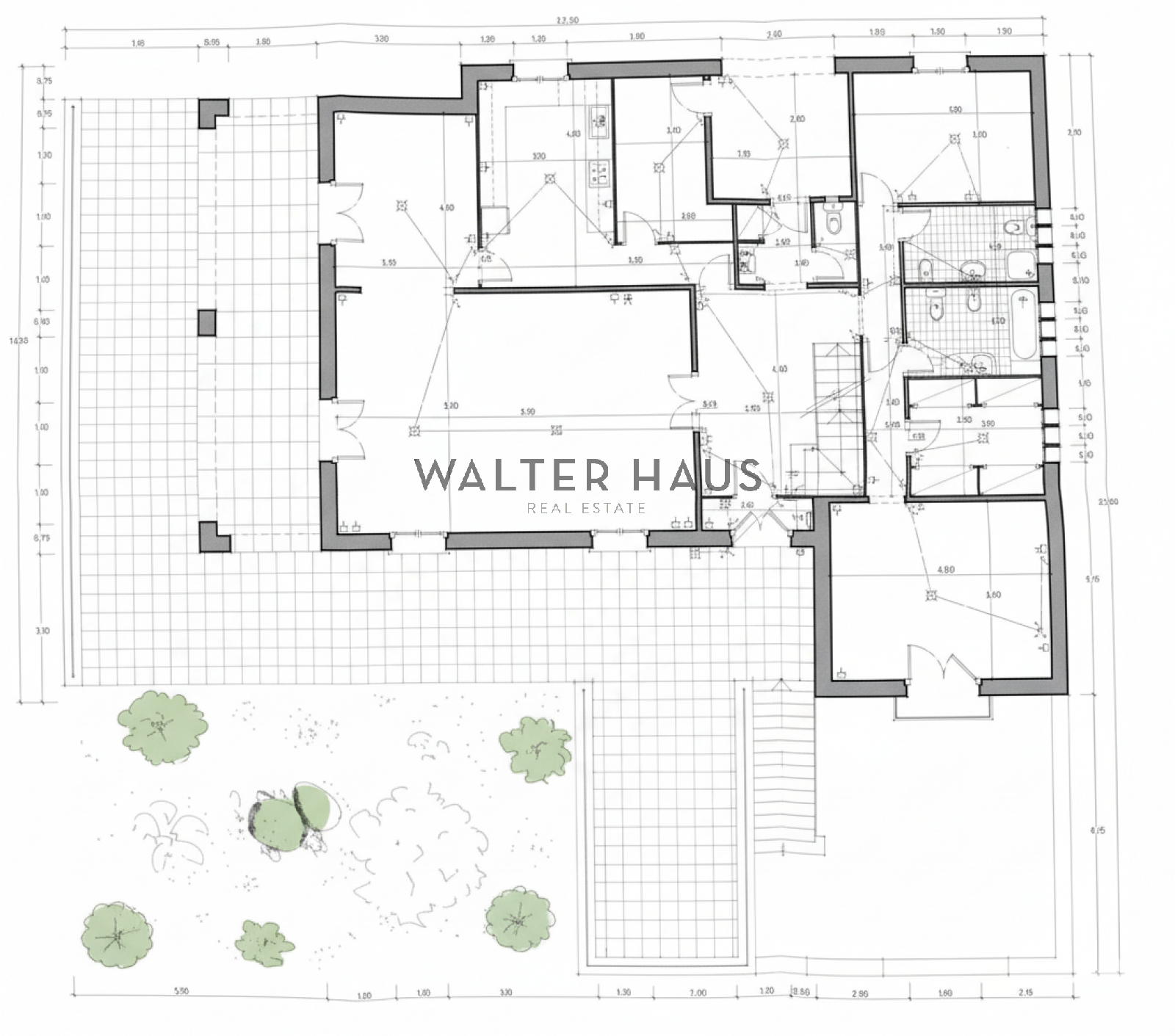 On the ground floor is the entrance hall with wooden beams, a wine cellar, laundry room, and storage room, as well as a closed garage.