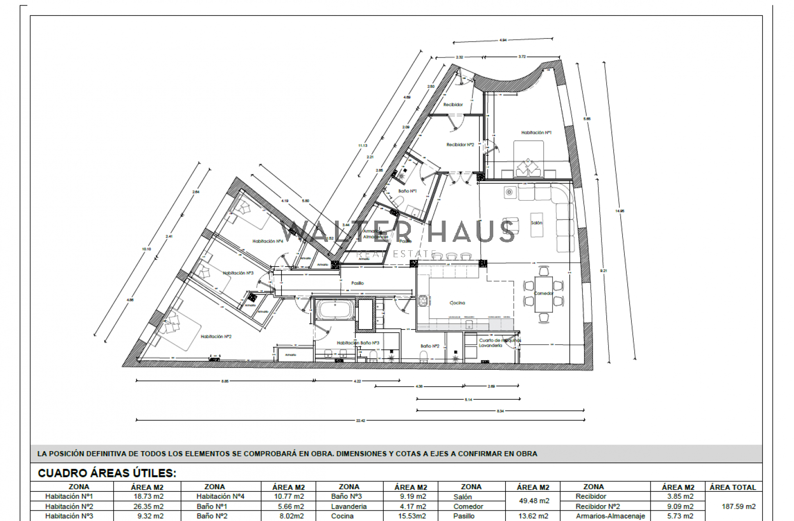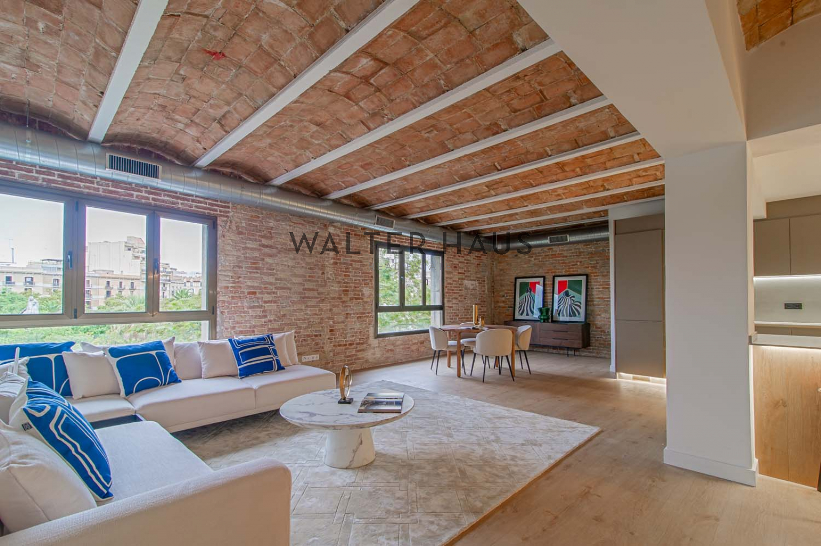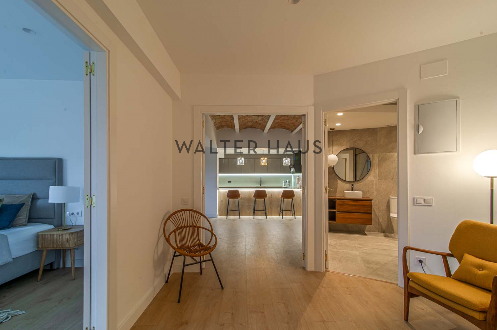 The living-dining room, dominated by a restored Catalan vault, blends harmoniously with a designer open kitchen, equipped with a central island and high-end finishes. The layout includes four bedrooms, three of them doubles, and a master suite measuring over 25 m². The home also features three full bathrooms, a separate laundry room, and renovated built-in wardrobes, providing functionality and style.
