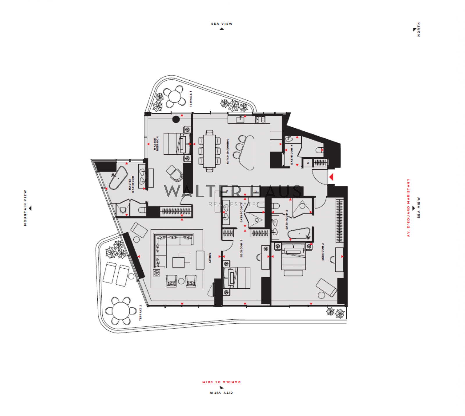 The home has two terraces: a 43.8 m² main terrace faces the sea and offers unparalleled panoramic views of the coast, while the second 15.5 m² terrace offers open views of the city. A setting where light and connection with the outdoors are essential parts of everyday life. Inside, the apartment features a spacious living-dining room with an open kitchen that connects directly to the main terrace, ideal for gatherings and enjoying al fresco dining overlooking the Mediterranean. The master suite offers a relaxing atmosphere with a reading area, separate dressing room, and private bathroom. The two additional bedrooms each have their own bathrooms, providing independence and comfort. Furthermore, the built-in wardrobes and modern finishes enhance the functionality of the apartment.