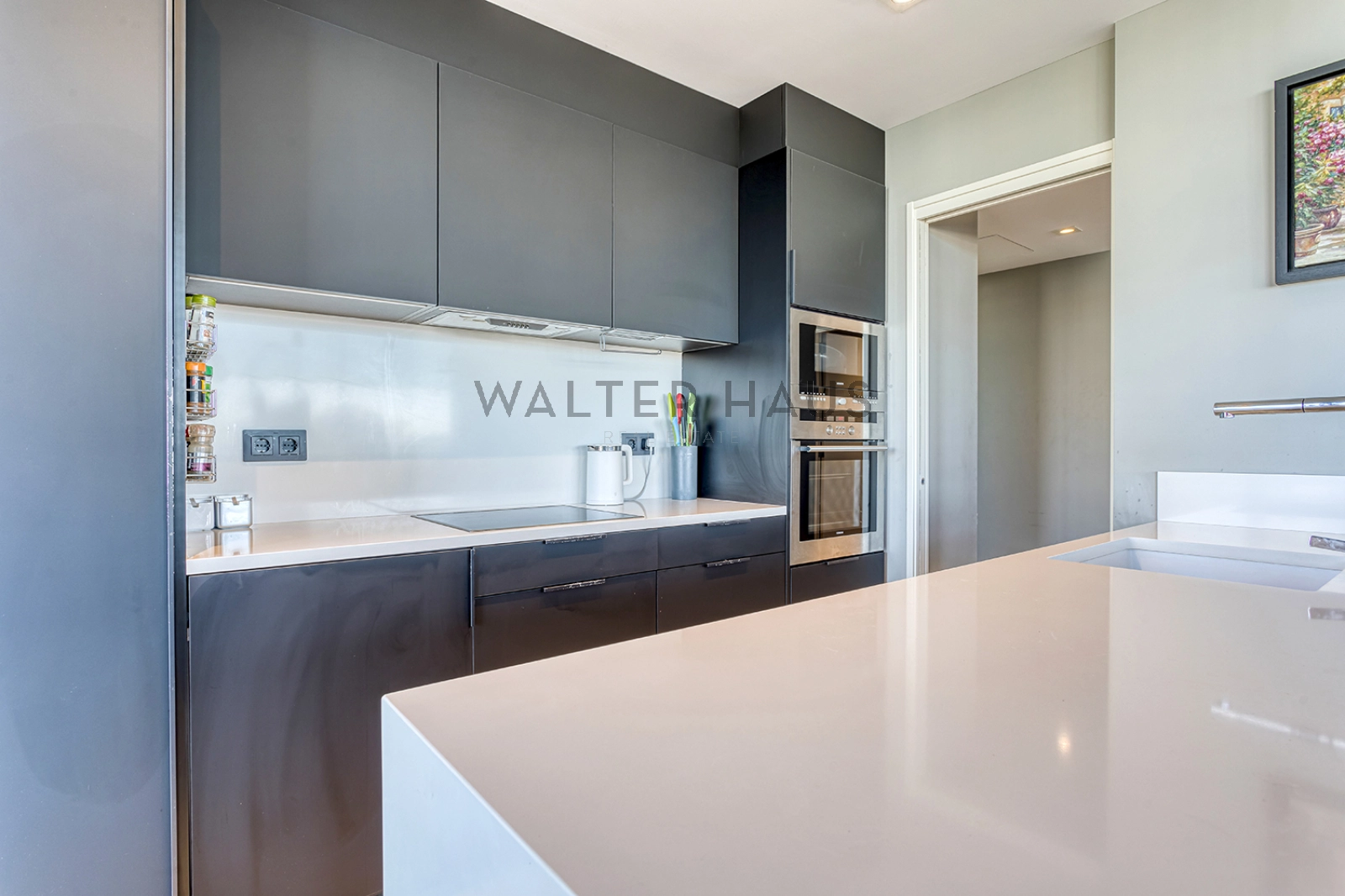 The apartment features a spacious living-dining room with large windows and direct access to the terrace, a fully equipped open-plan kitchen with a breakfast bar, and a sleeping area comprising three bedrooms. The master suite includes built-in wardrobes and an elegant bathroom with a shower and bathtub. The two additional single bedrooms also have access to the terrace and share a full bathroom. The property has been renovated with high-quality finishes, such as parquet flooring, laminate flooring on the terrace, ducted air conditioning and heating, and a separate utility area.