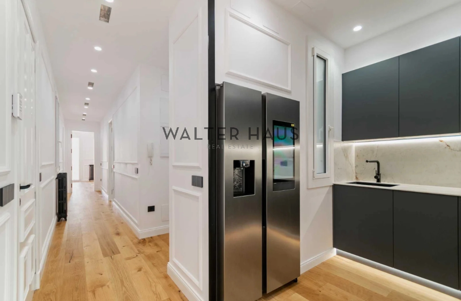 On the south-facing façade, overlooking a sunny interior courtyard, is the spacious living-dining room, which enjoys natural light throughout the day thanks to its French balconies and a beautiful south-facing gallery. This space connects to a semi-open kitchen, equipped with a large central island and a layout designed for both practicality and social interaction. The sleeping area offers three double bedrooms, one with an en-suite bathroom, as well as a second full bathroom and a laundry room. All the rooms feature generous proportions and harmonious lines characteristic of the elegant apartments in the Eixample district.