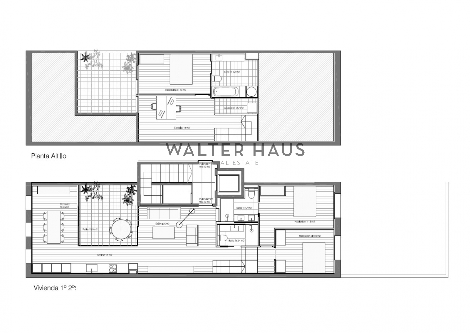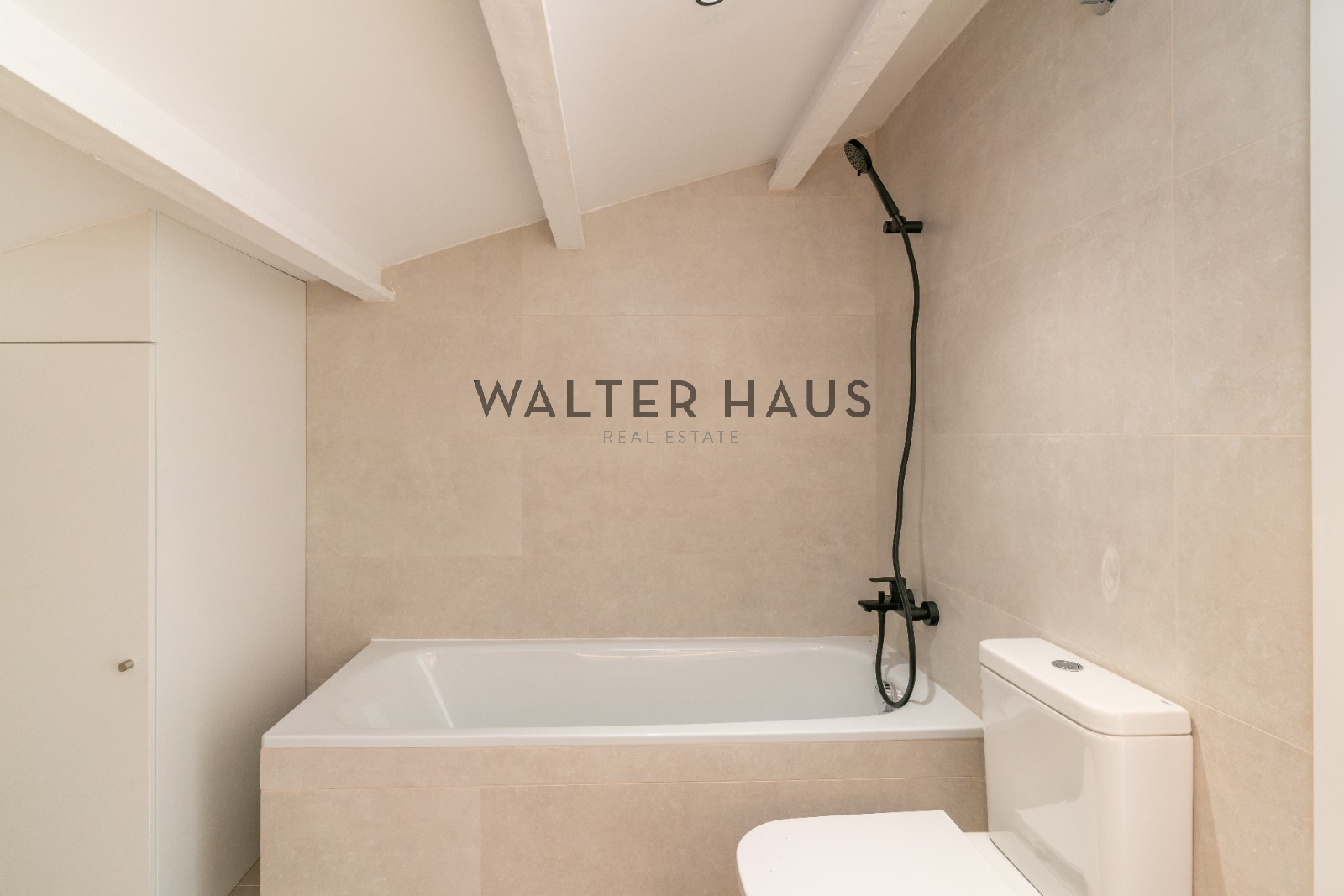 On the main floor, there is a spacious living room with direct access to a 14m² interior patio, perfect for enjoying the outdoors in the heart of the city. The kitchen is integrated into the dining area and features south-facing windows that provide constant light. Also on this floor are two double bedrooms with sloping ceilings and exposed wooden beams, which add warmth and personality to the space. On the upper level, the master suite is complemented by a multipurpose area ideal for an office, reading room, or a cozy relaxation corner. The building has been designed with sustainability criteria, incorporating aerothermal systems, ducted air conditioning, and solar panels for energy supply, ensuring efficiency and comfort year-round.