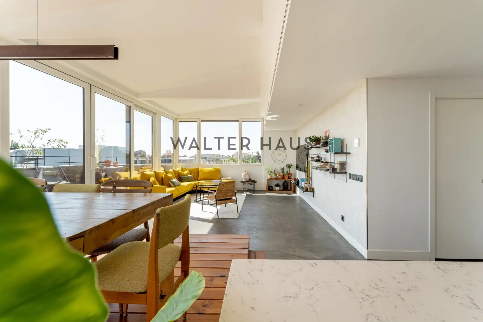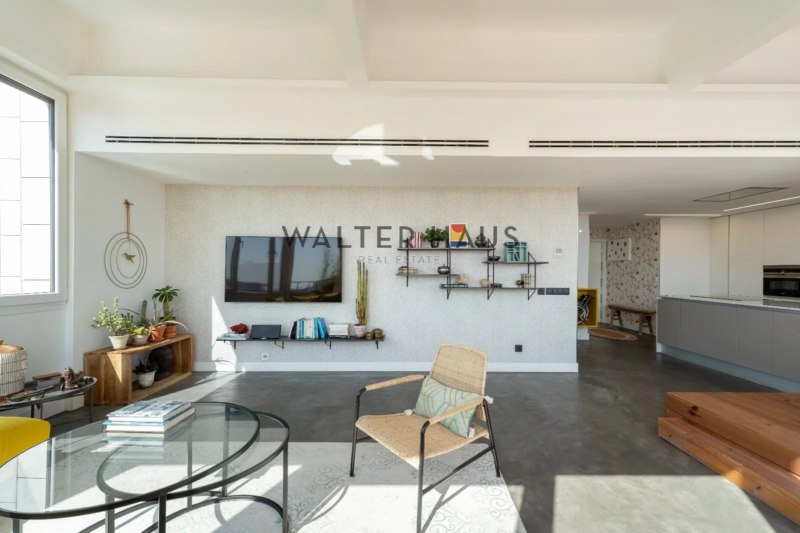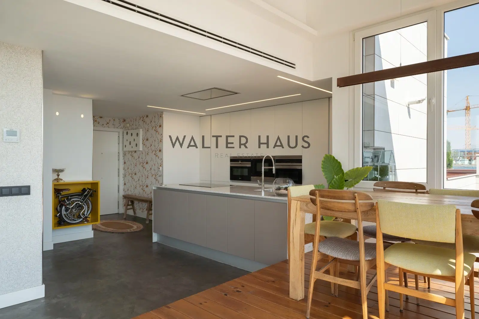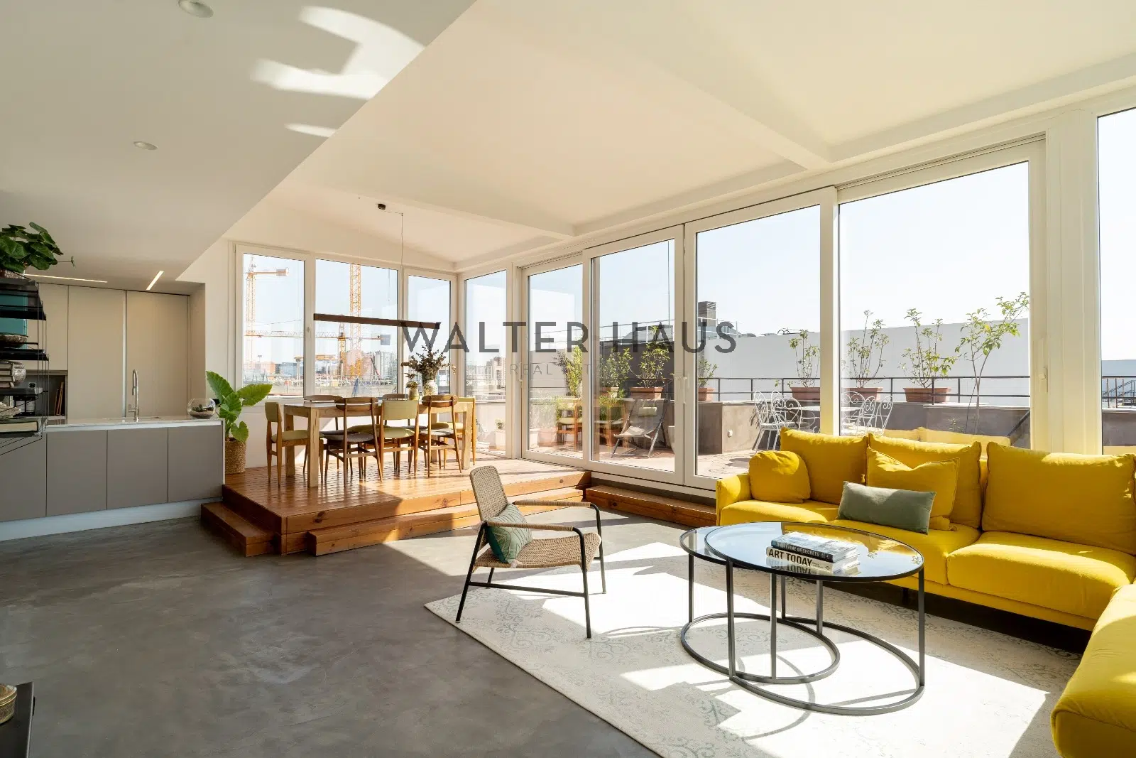 We present this exclusive, fully renovated penthouse, located in one of the city’s most sought-after areas. With 118 square meters of living space, the apartment boasts a modern and functional design, featuring an entrance hall that leads to a spacious living room with an open-plan kitchen. The jewel of the property is its magnificent terrace, offering unparalleled panoramic views.