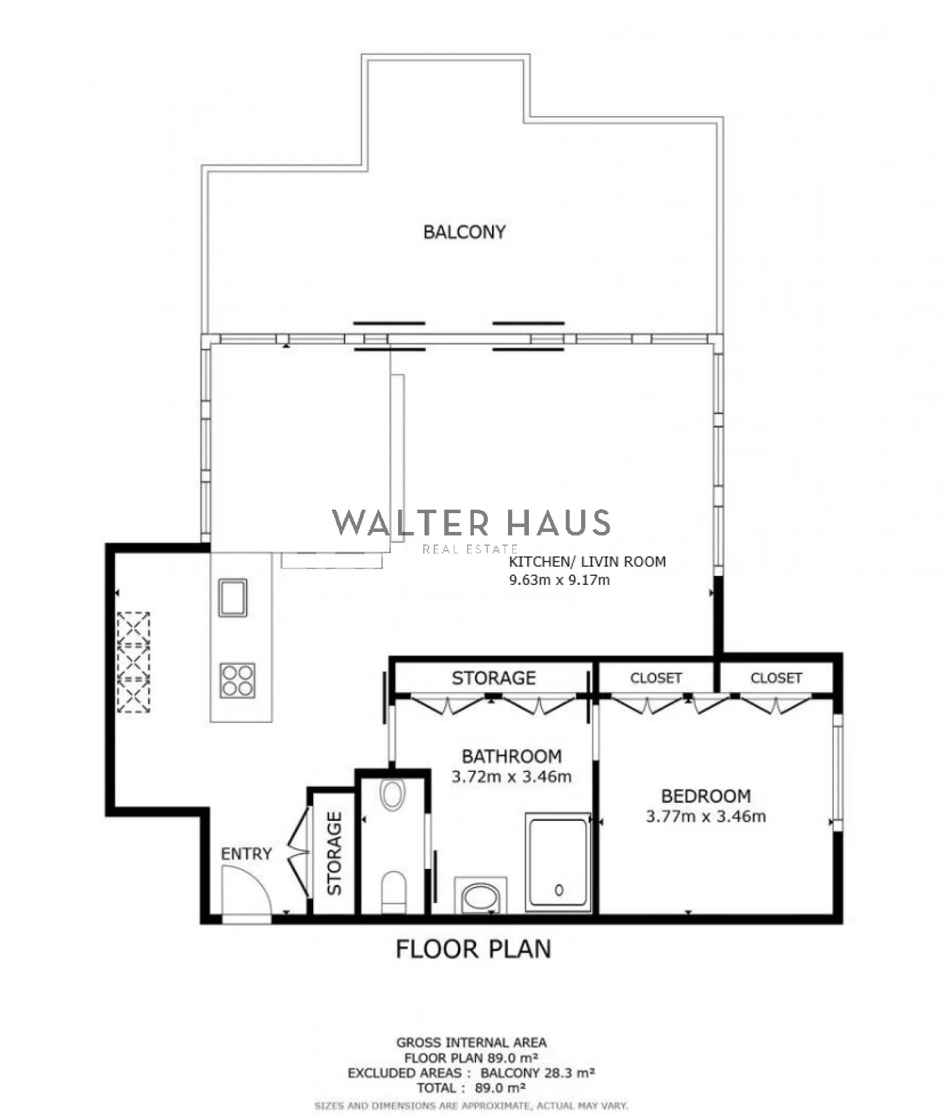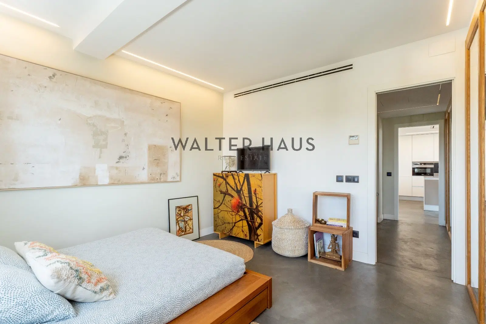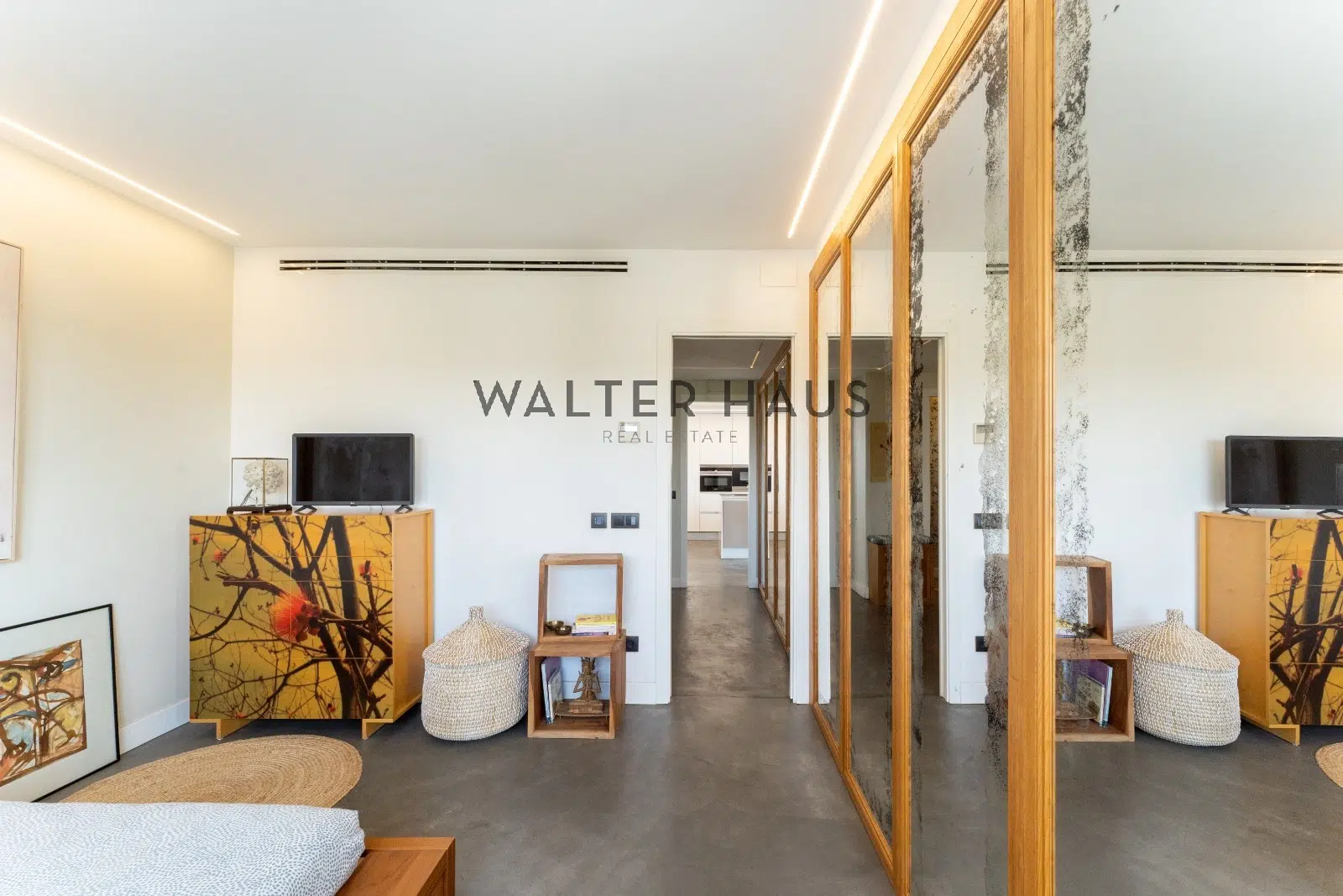 The living room, divided into two distinct areas—a sitting area and a dining area—is remarkably versatile. The glass enclosure opens almost entirely, creating a sense of spaciousness and light. The apartment includes a designer bathroom and a bedroom equipped with ample wardrobes and storage space. Polished concrete floors, along with underfloor heating and a heat pump air conditioning system, ensure maximum comfort year-round.