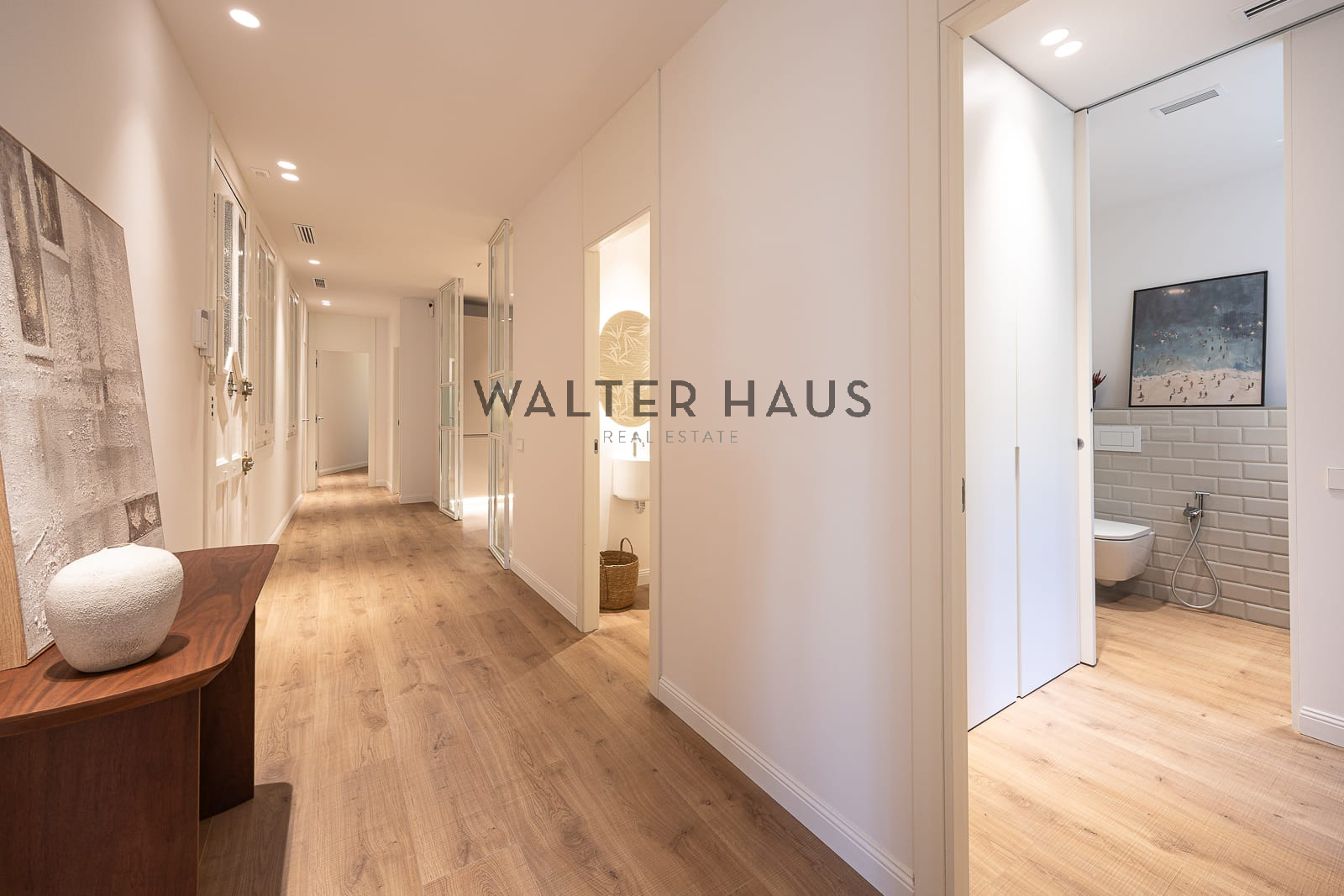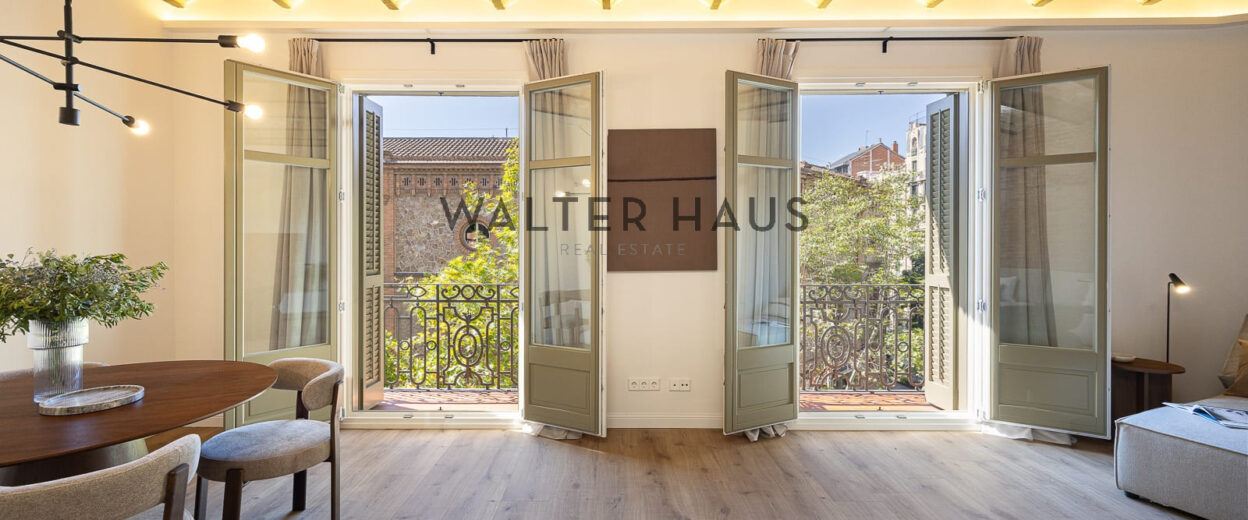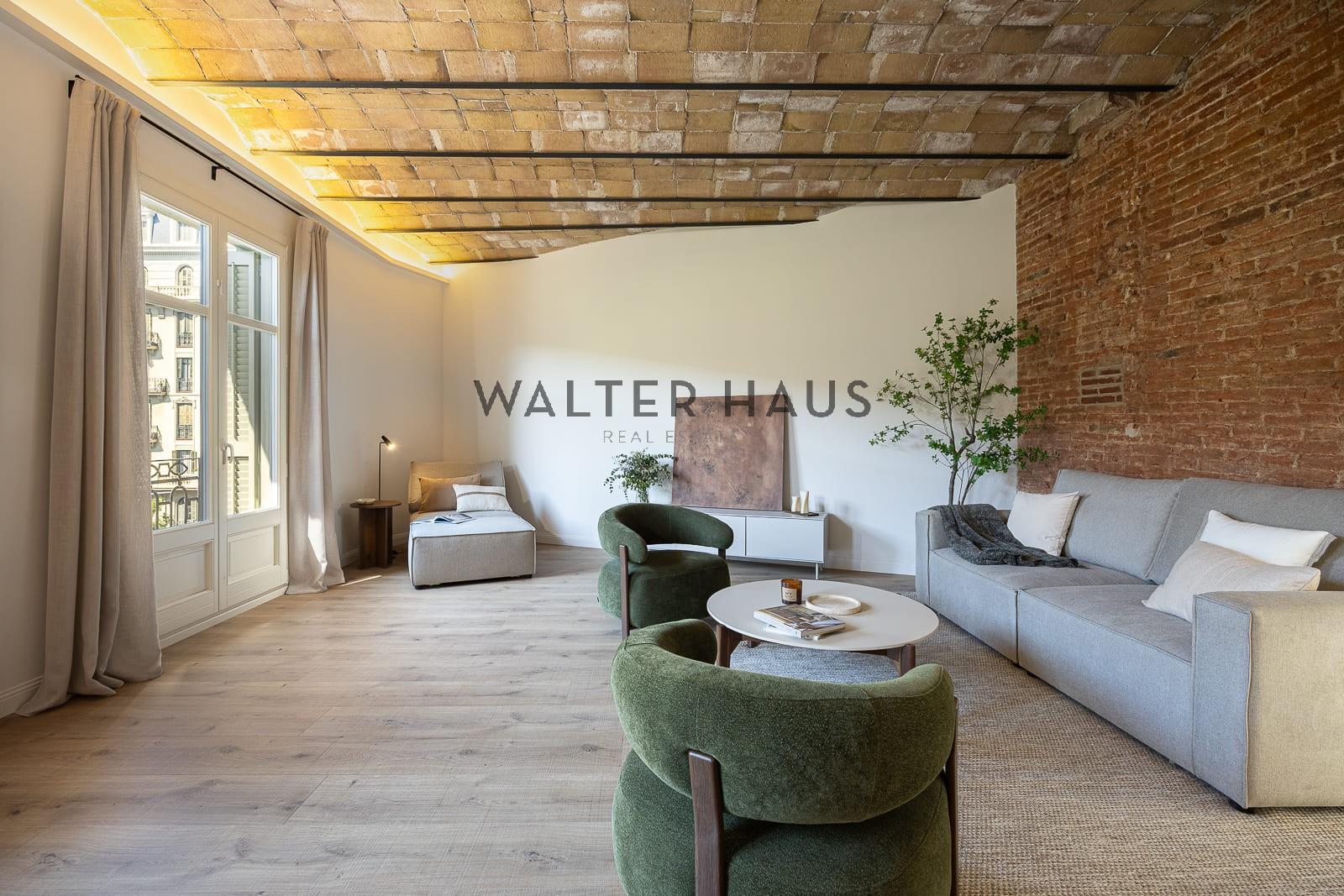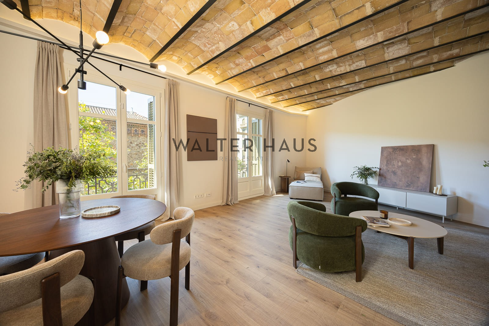 Exclusive 137 m² apartment for sale located on the second floor of a stately 1936 building with an elevator. The home has been completely renovated, respecting the original architectural elements, such as the Catalan vaulted ceiling, and integrating high-quality modern materials and finishes.