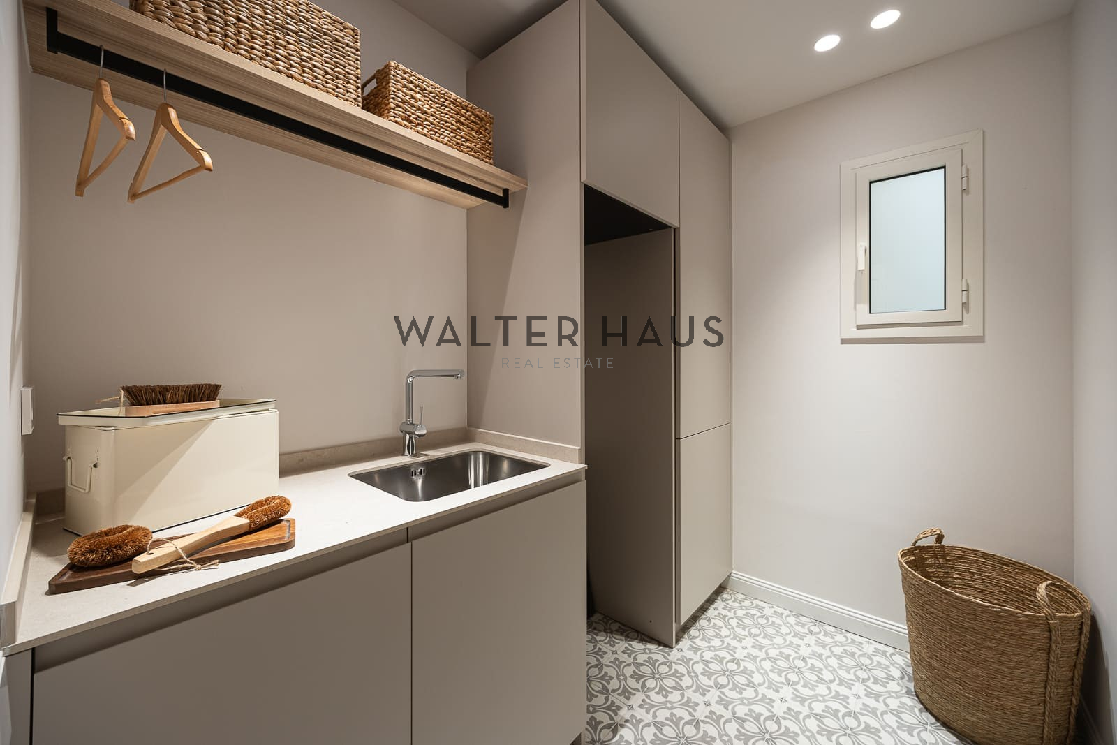 The property features a spacious and bright living-dining room with access to two balconies, allowing for natural light and the urban charm of the surroundings. The fully equipped kitchen-diner is complemented by a separate laundry area. The sleeping area consists of two en-suite bedrooms, both with private bathrooms, dressing rooms, and access to balconies, providing privacy and comfort. Additionally, the apartment has a guest toilet. Highlights include restored exposed brick walls, built-in wardrobes, Parador AC5 oak laminate flooring, white water-repellent baseboards, and a strip lighting system.
