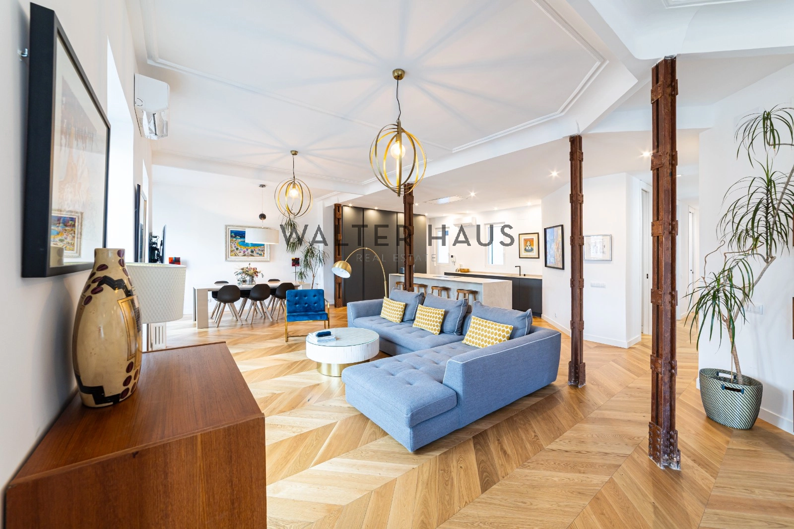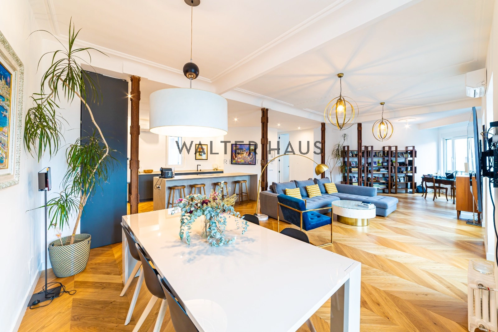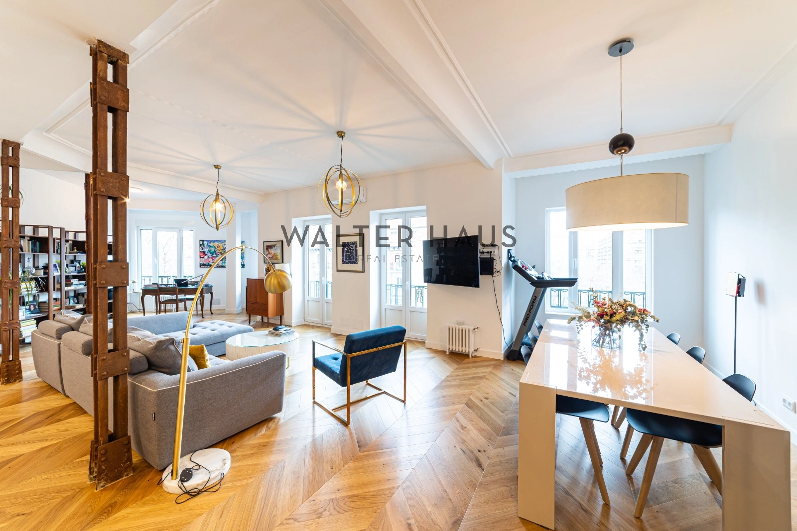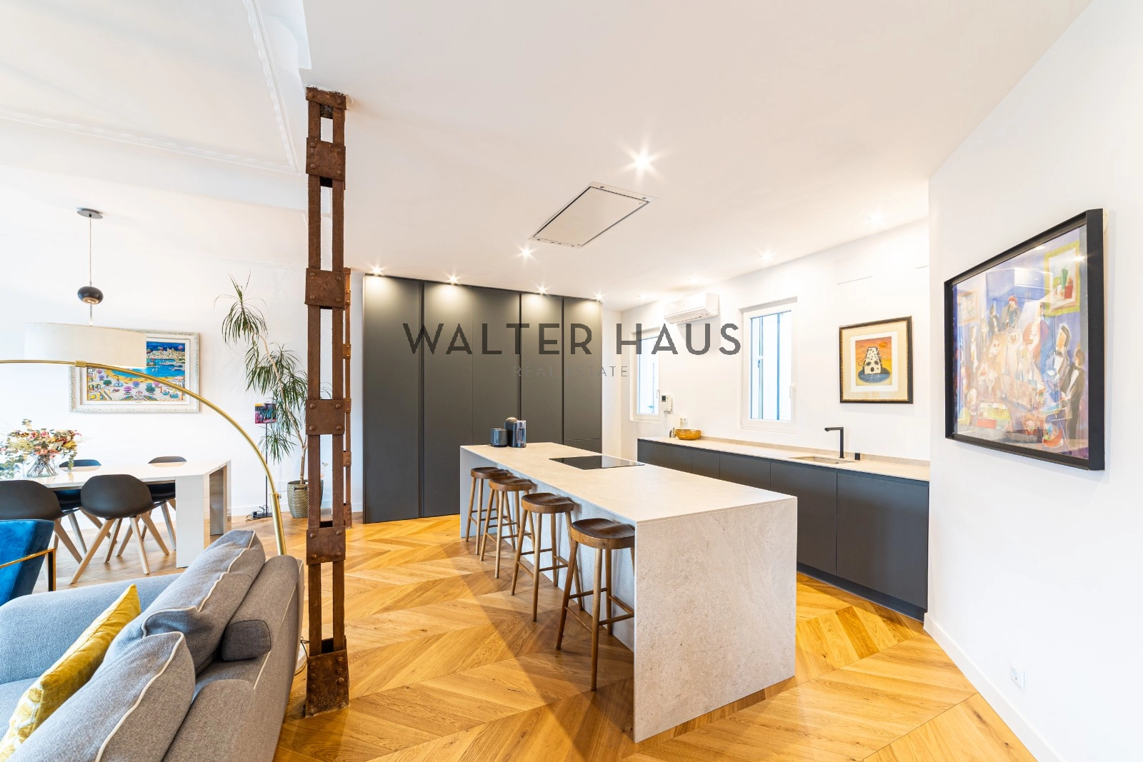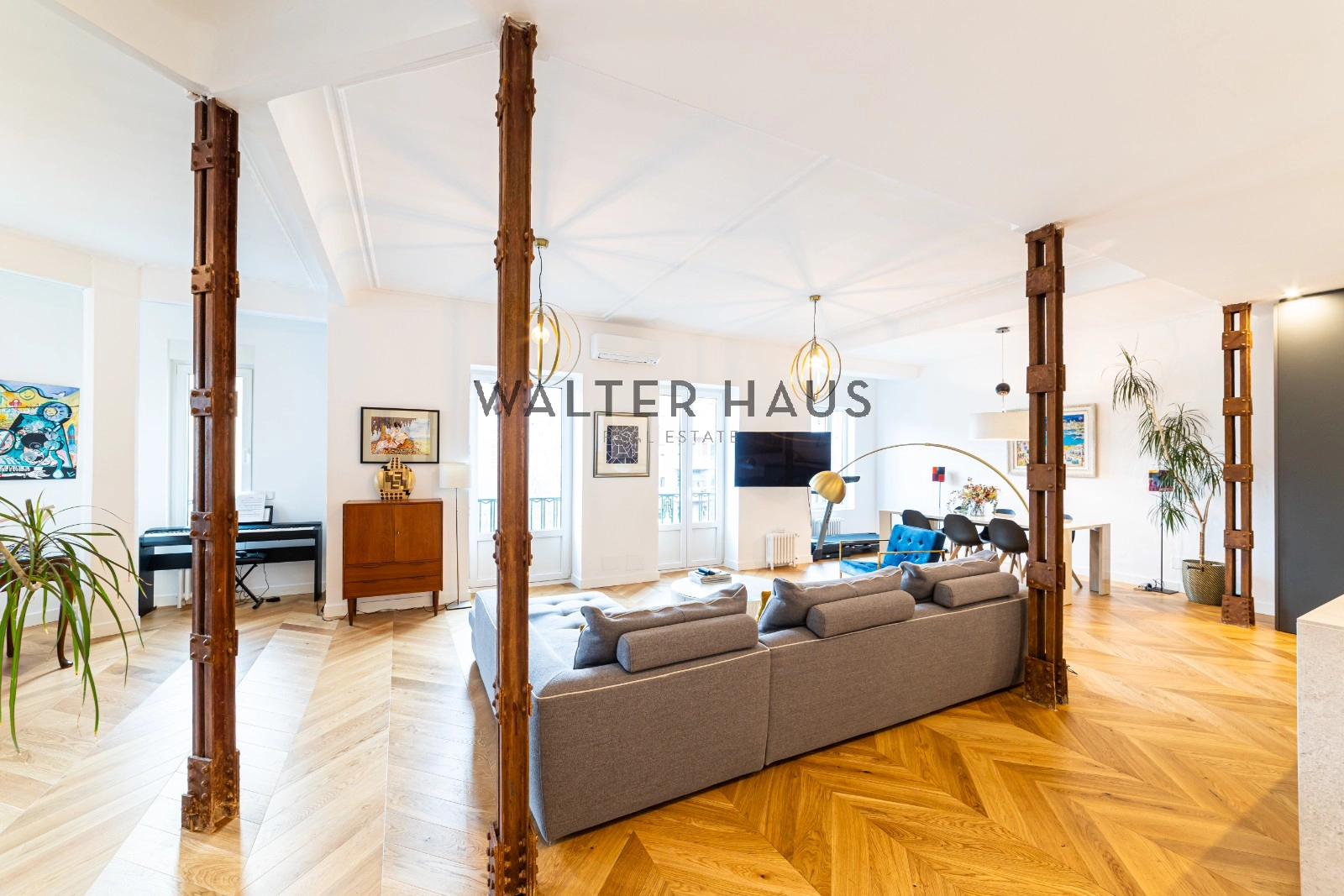 Following a complete renovation a couple of years ago, the apartment’s layout was redesigned for a more functional and social lifestyle. It now comprises an entrance hall with ample closet space, two spacious bedrooms with built-in wardrobes and balconies, two full bathrooms with natural ventilation, and a guest toilet. The living and dining area, along with the kitchen featuring a large island and work area, have been seamlessly integrated into a bright and versatile open space. The original wrought iron beams, now exposed, break the monotony and remind us of the building’s origins in the first half of the 20th century.