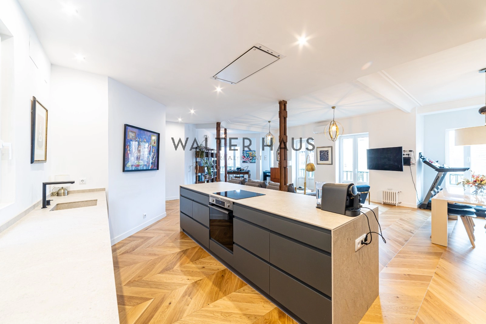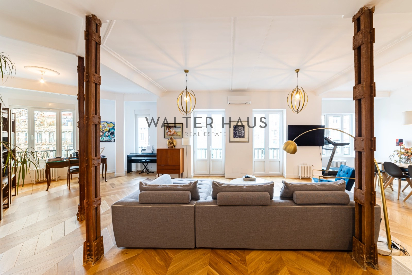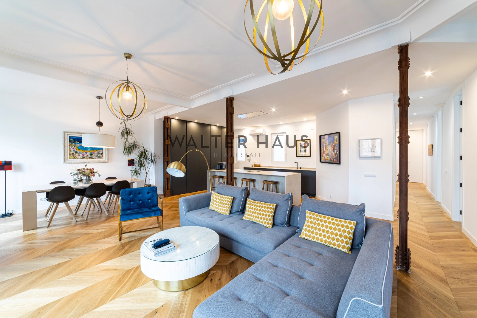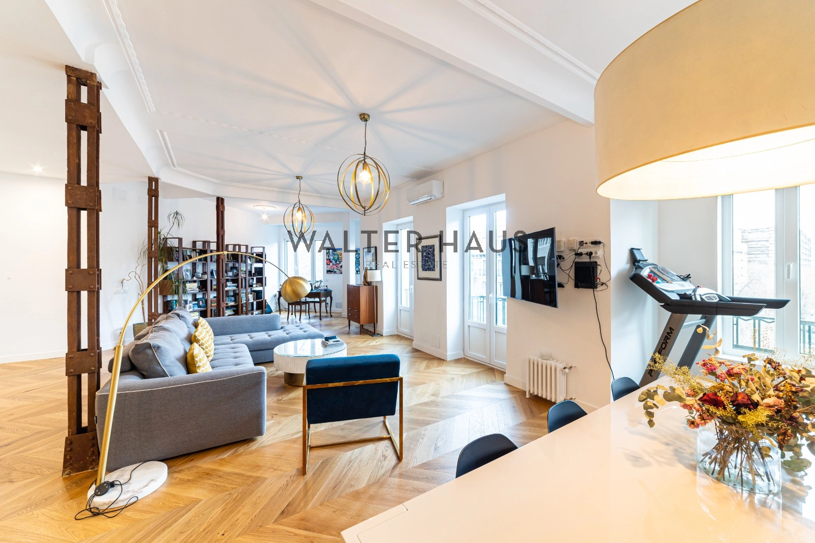 Following a complete renovation a couple of years ago, the apartment’s layout was redesigned for a more functional and social lifestyle. It now comprises an entrance hall with ample closet space, two spacious bedrooms with built-in wardrobes and balconies, two full bathrooms with natural ventilation, and a guest toilet. The living and dining area, along with the kitchen featuring a large island and work area, have been seamlessly integrated into a bright and versatile open space. The original wrought iron beams, now exposed, break the monotony and remind us of the building’s origins in the first half of the 20th century.