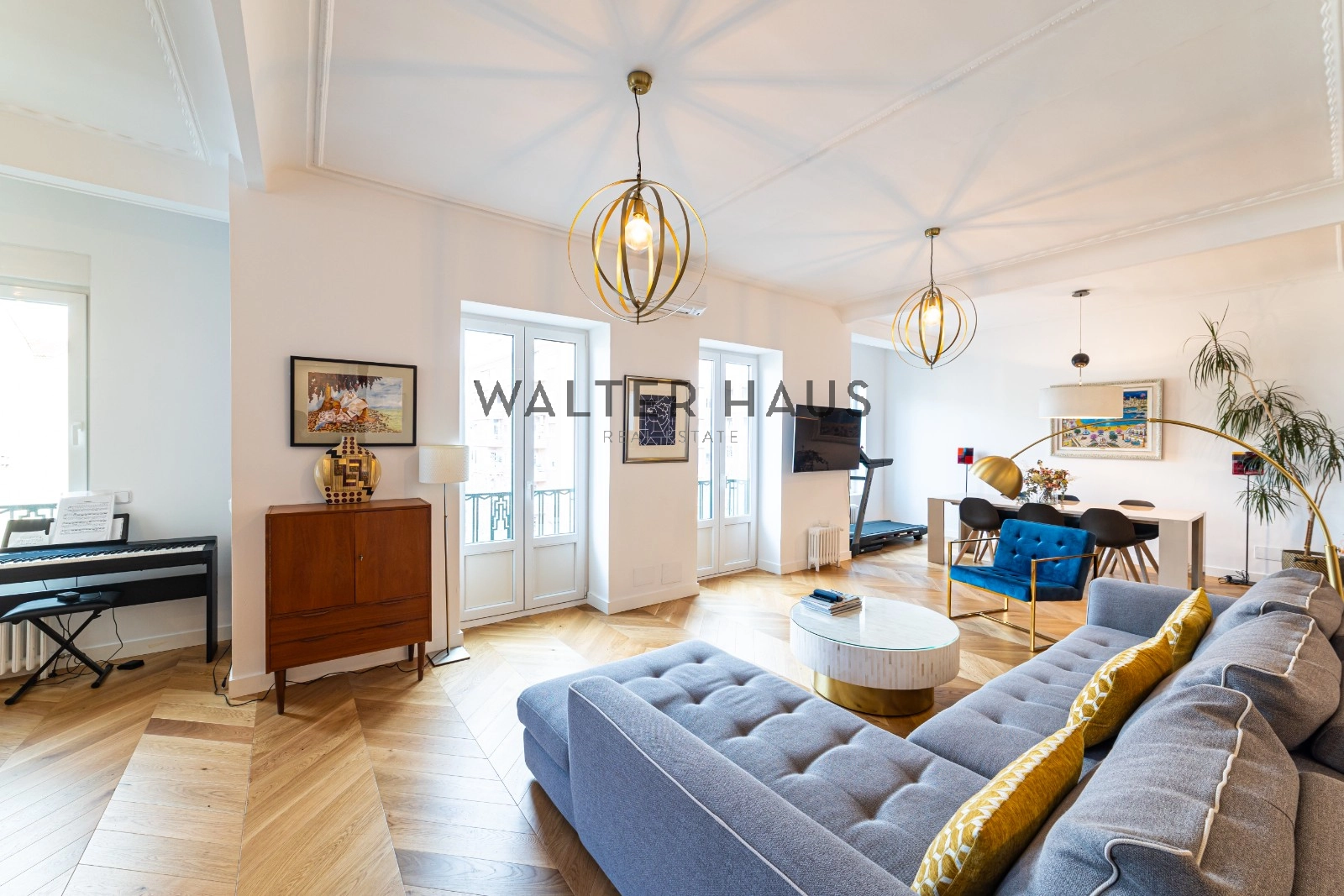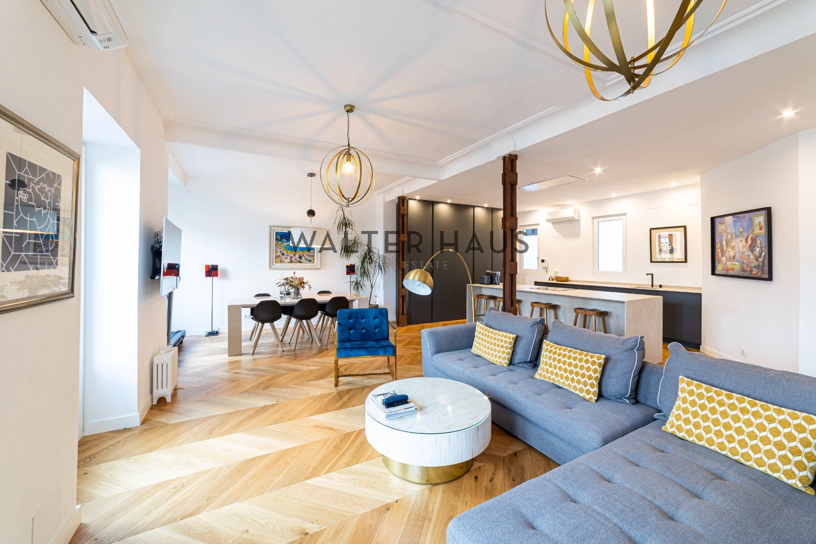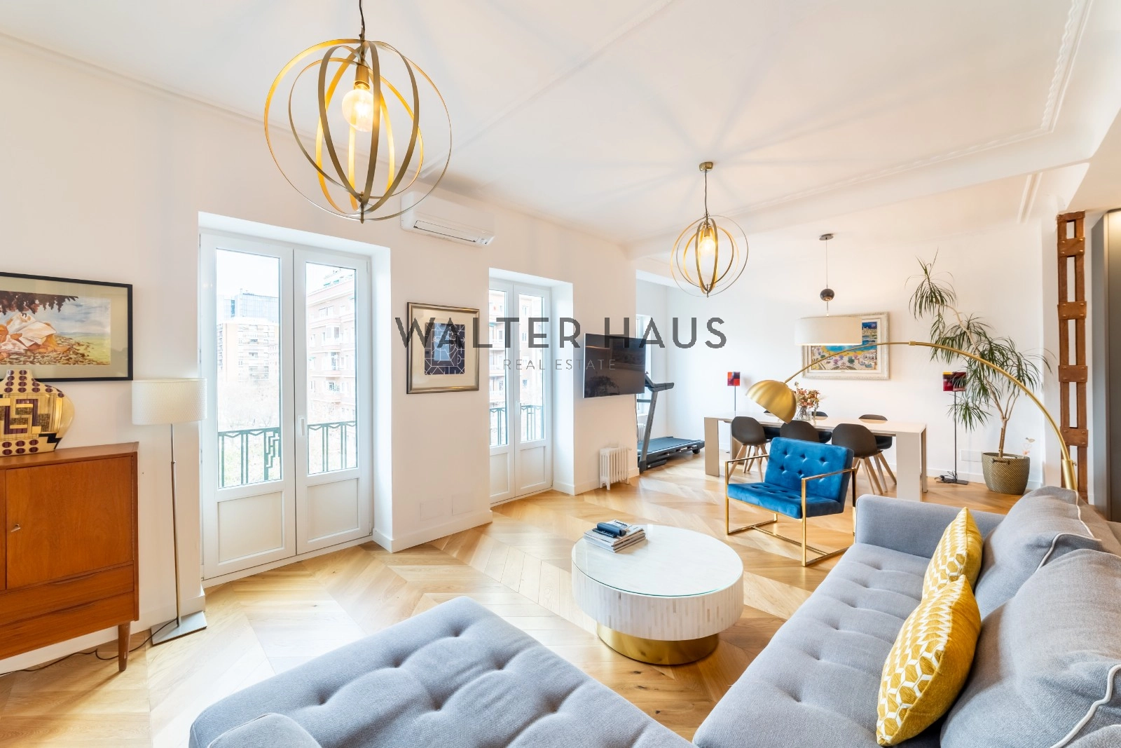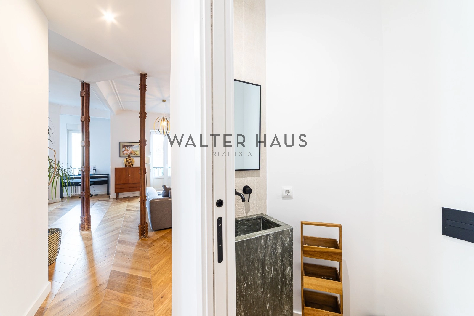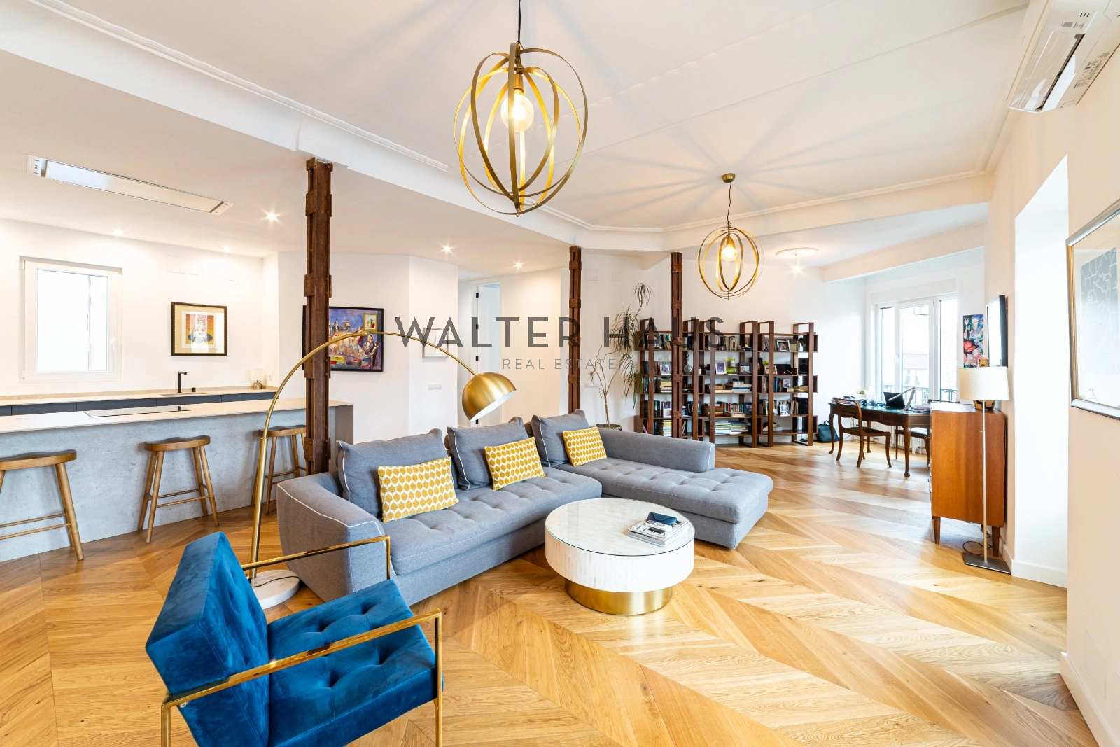 Following a complete renovation a couple of years ago, the apartment’s layout was redesigned for a more functional and social lifestyle. It now comprises an entrance hall with ample closet space, two spacious bedrooms with built-in wardrobes and balconies, two full bathrooms with natural ventilation, and a guest toilet. The living and dining area, along with the kitchen featuring a large island and work area, have been seamlessly integrated into a bright and versatile open space. The original wrought iron beams, now exposed, break the monotony and remind us of the building’s origins in the first half of the 20th century.