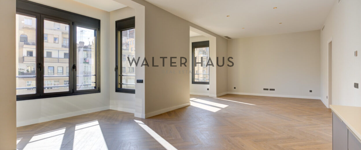 This exclusive, renovated 150 m² apartment is located on the fourth floor (third floor in US/UK terms) of a historic Modernist building in the heart of Barcelona’s Eixample district. Its design blends classic architecture with contemporary finishes, creating a sophisticated and functional atmosphere. Three-meter-high ceilings enhance the spaciousness and light of each room, while the fluid layout brings harmony to the entire space. The 3.1 m² entrance hall leads to a 13.6 m² central foyer that seamlessly connects to the different areas of the apartment.