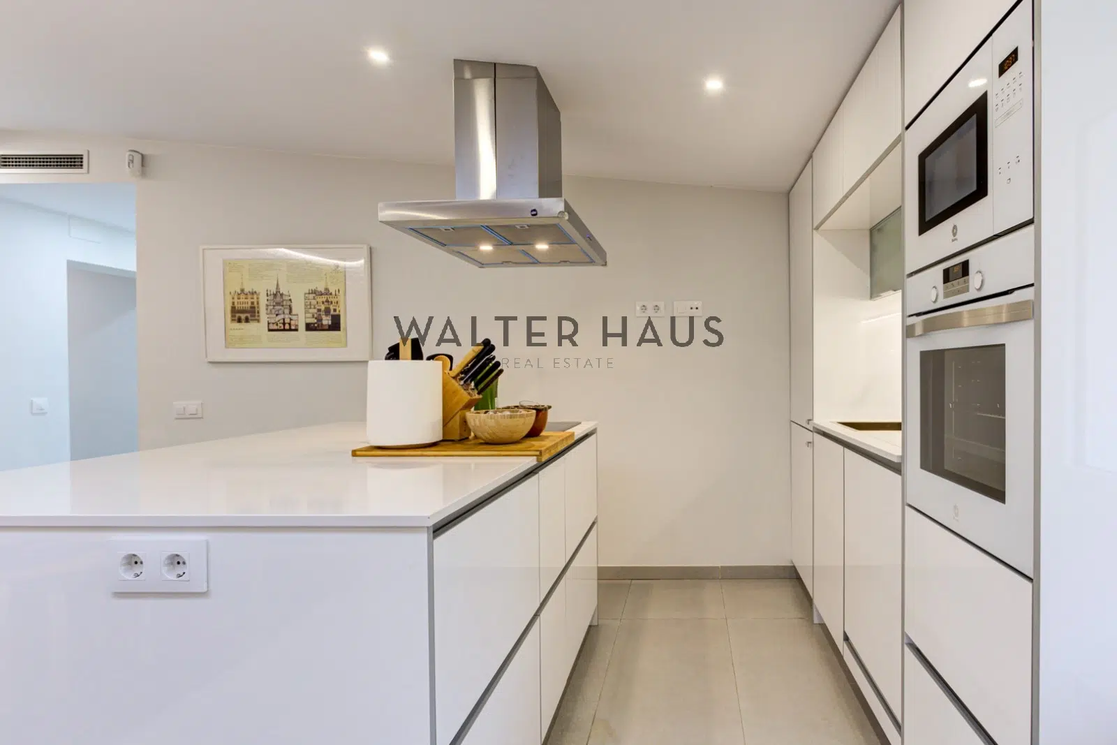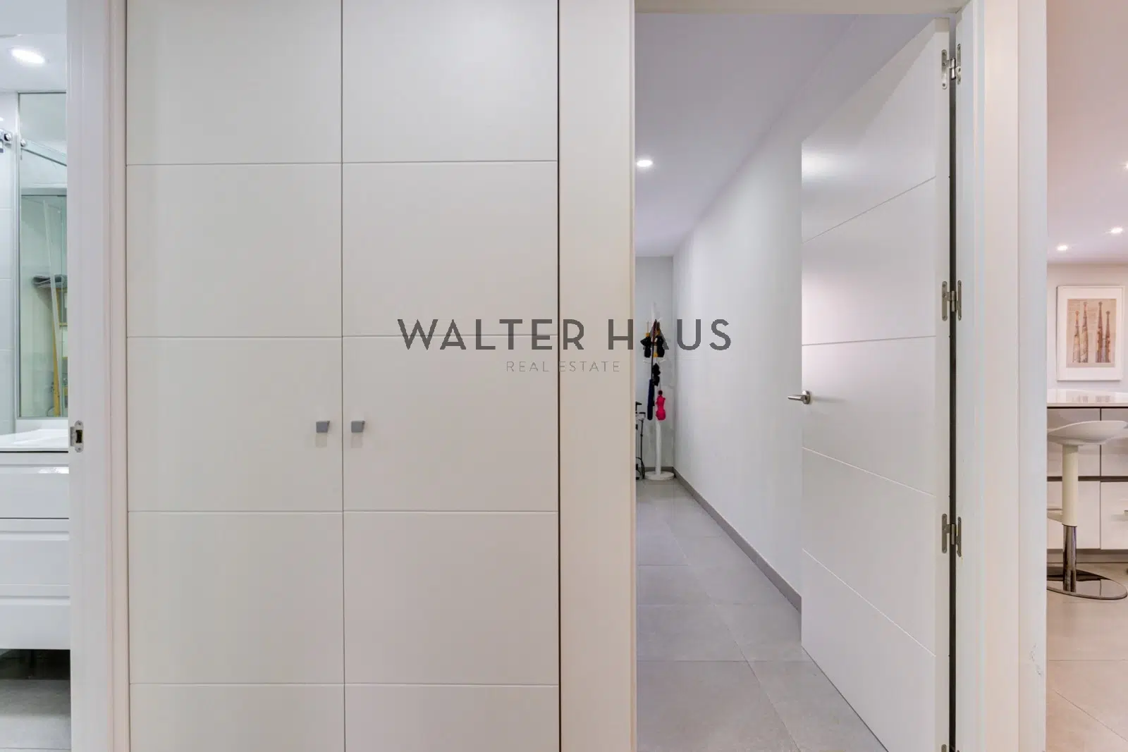 The main living area features a spacious open-plan living and dining room with a kitchen and a large central island, ideal for enjoying time with family and friends. The layout includes two bedrooms and two full bathrooms, providing comfort and functionality in every room. Natural light floods every corner thanks to its orientation and height, creating a feeling of spaciousness and well-being.