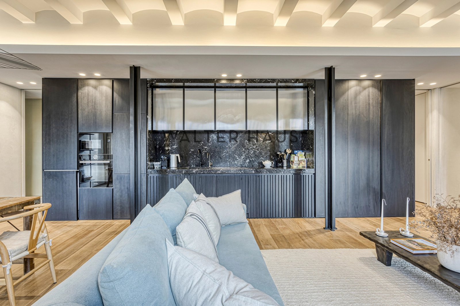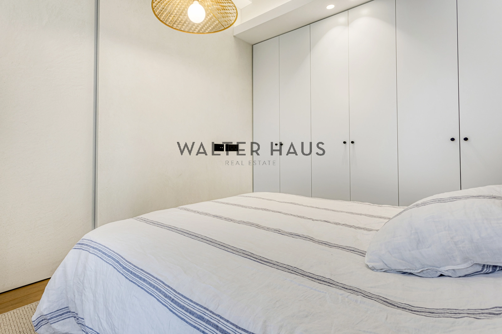 The apartment has been renovated with high-quality materials and features an open-plan living area that integrates the living room, dining room, and a designer kitchen with Bosch appliances. It has three double bedrooms, including a master suite with a dressing room and ensuite bathroom. All rooms have access to the exterior, ensuring natural light and ventilation throughout the home. The building has an elevator and concierge service. Renovated by the prestigious Luv Studio.