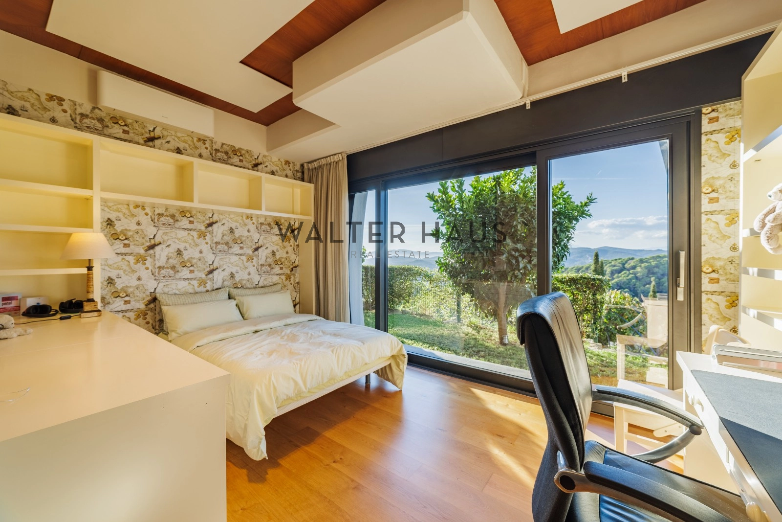 This property boasts six spacious en-suite bedrooms, eight bathrooms, a soundproofed cinema room, a fully equipped kitchen, a dining room, a gym, a spa, an office, and a games room. On the middle floor, a circular entrance hall with marble flooring and a black Zimbabwe marble staircase provides access to five of the suites and a large dressing room. The top floor houses the open-plan living and dining area, which opens onto a terrace with a swimming pool and jacuzzi. From the living room, one can also access the sixth suite via a private entrance. In addition, the house features parking for 5 vehicles (included in the price), a storage room, built-in wardrobes, central heating, a swimming pool, and a solar energy system for greater efficiency.