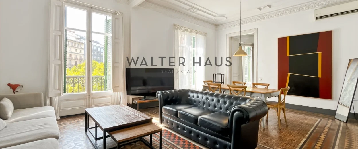 LOCATION SAISONNIÈRE. Fantastique appartement de 115 m² situé au deuxième étage d’un immeuble prestigieux avec ascenseur, au cœur du Quadrat d’Or de Barcelone, à proximité de la Plaza Tetuán, du Passeig de Sant Joan et du traditionnel Passeig de Gràcia.