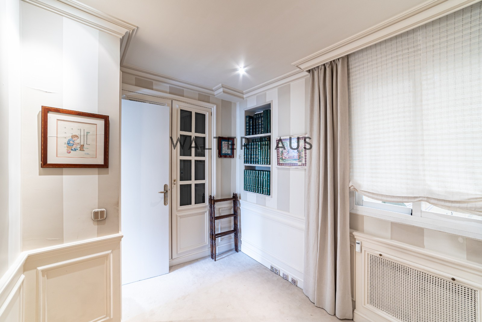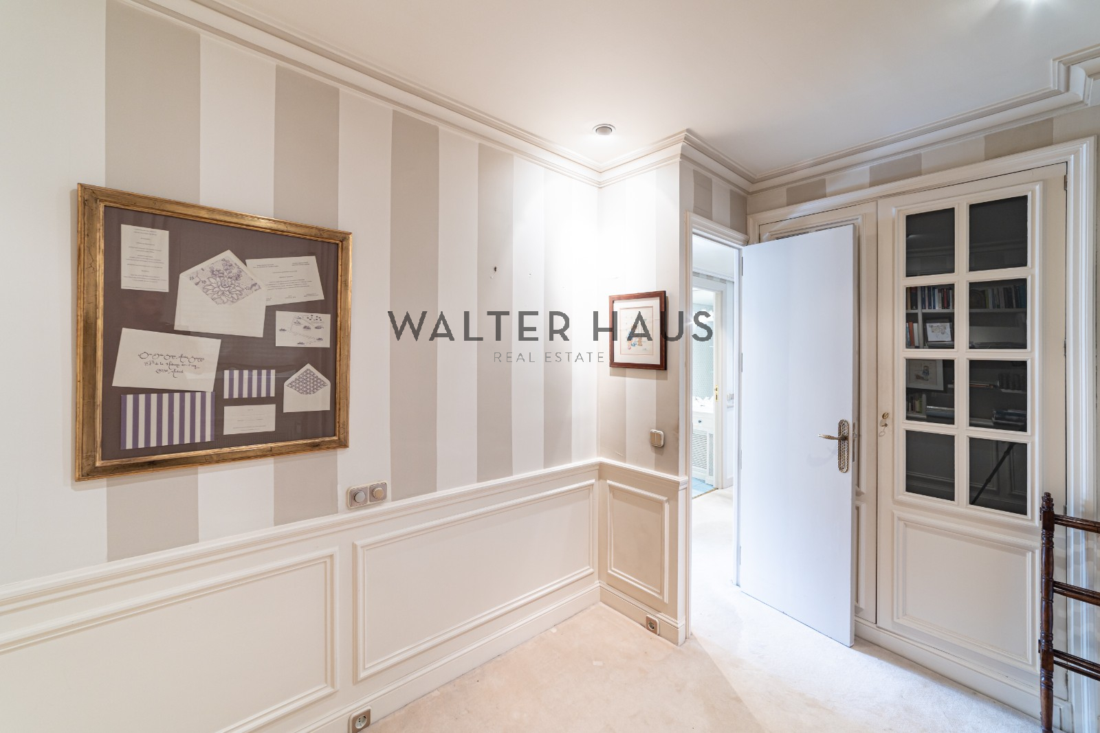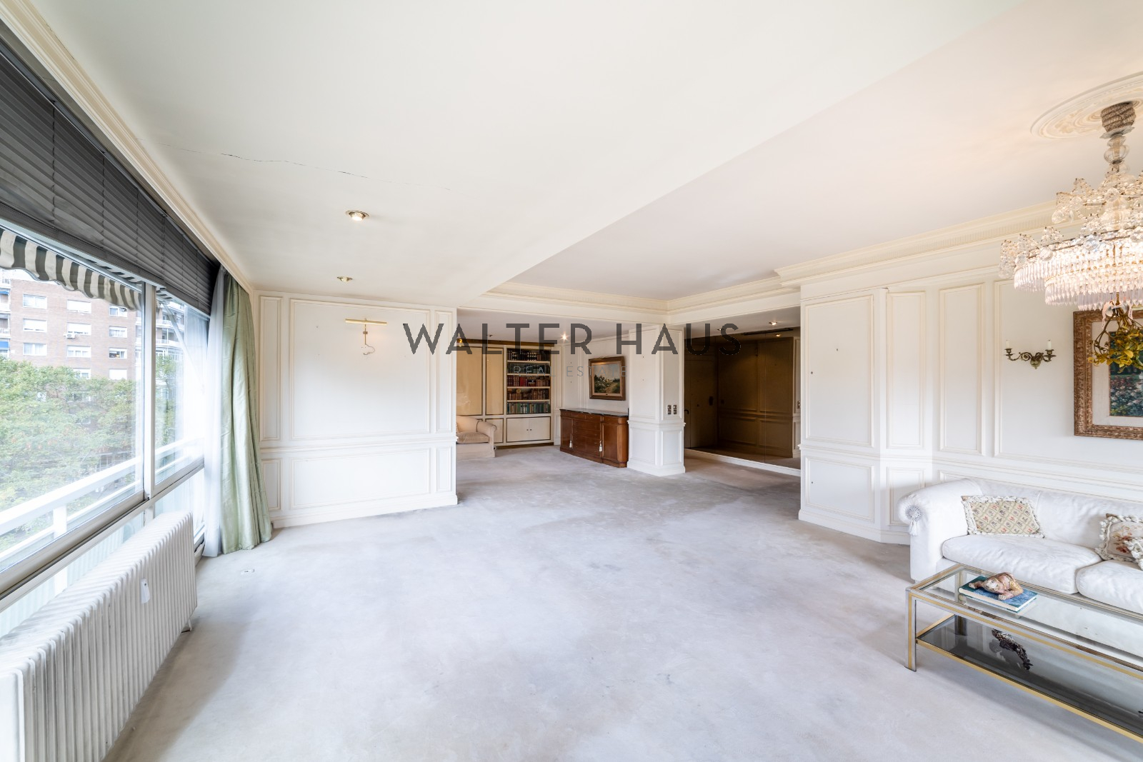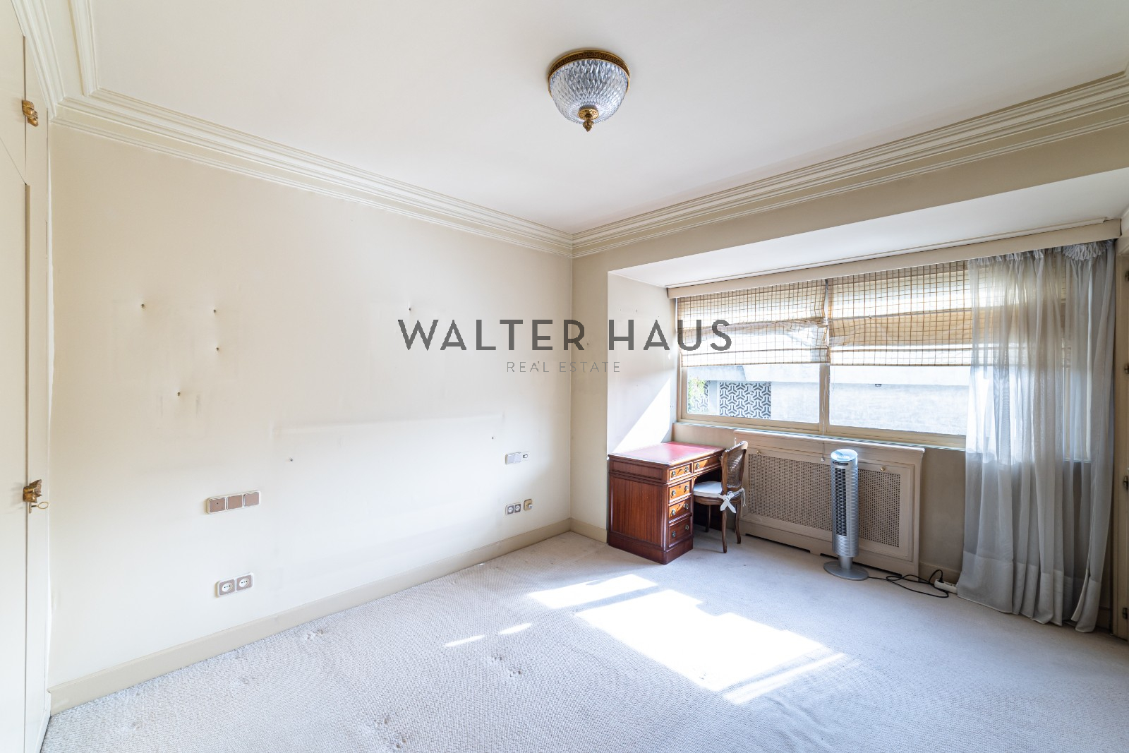 L’aménagement intérieur soigné débute par un élégant hall de réception, équipé d’un dressing pratique. Le spacieux séjour, divisé en trois espaces, constitue le cœur de la maison, remarquable par ses grandes fenêtres offrant une vue imprenable sur le Paseo de la Habana. L’espace nuit comprend quatre chambres au total : une suite parentale donnant sur l’extérieur avec salle de bains privative et grands placards intégrés, et deux autres chambres, également extérieures, partageant une seconde salle de bains. La cuisine séparée comprend un petit bureau et dispose d’une porte de service, ainsi que d’une buanderie. La propriété dispose également d’un débarras et d’un service de conciergerie.