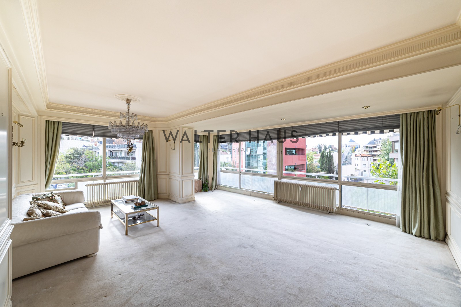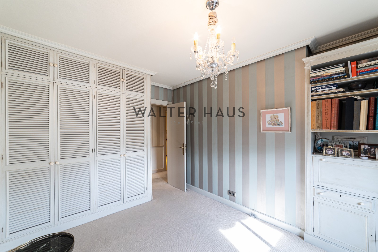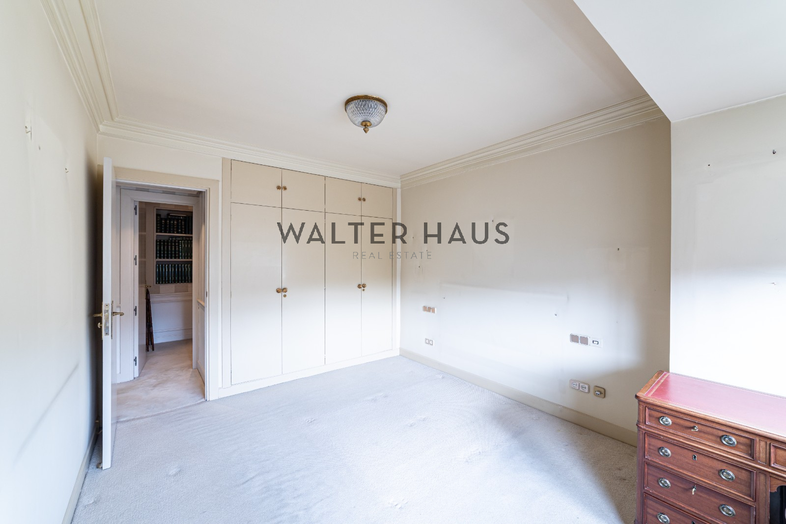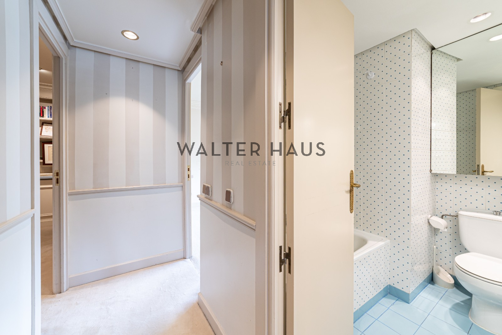 L’aménagement intérieur soigné débute par un élégant hall de réception, équipé d’un dressing pratique. Le spacieux séjour, divisé en trois espaces, constitue le cœur de la maison, remarquable par ses grandes fenêtres offrant une vue imprenable sur le Paseo de la Habana. L’espace nuit comprend quatre chambres au total : une suite parentale donnant sur l’extérieur avec salle de bains privative et grands placards intégrés, et deux autres chambres, également extérieures, partageant une seconde salle de bains. La cuisine séparée comprend un petit bureau et dispose d’une porte de service, ainsi que d’une buanderie. La propriété dispose également d’un débarras et d’un service de conciergerie.