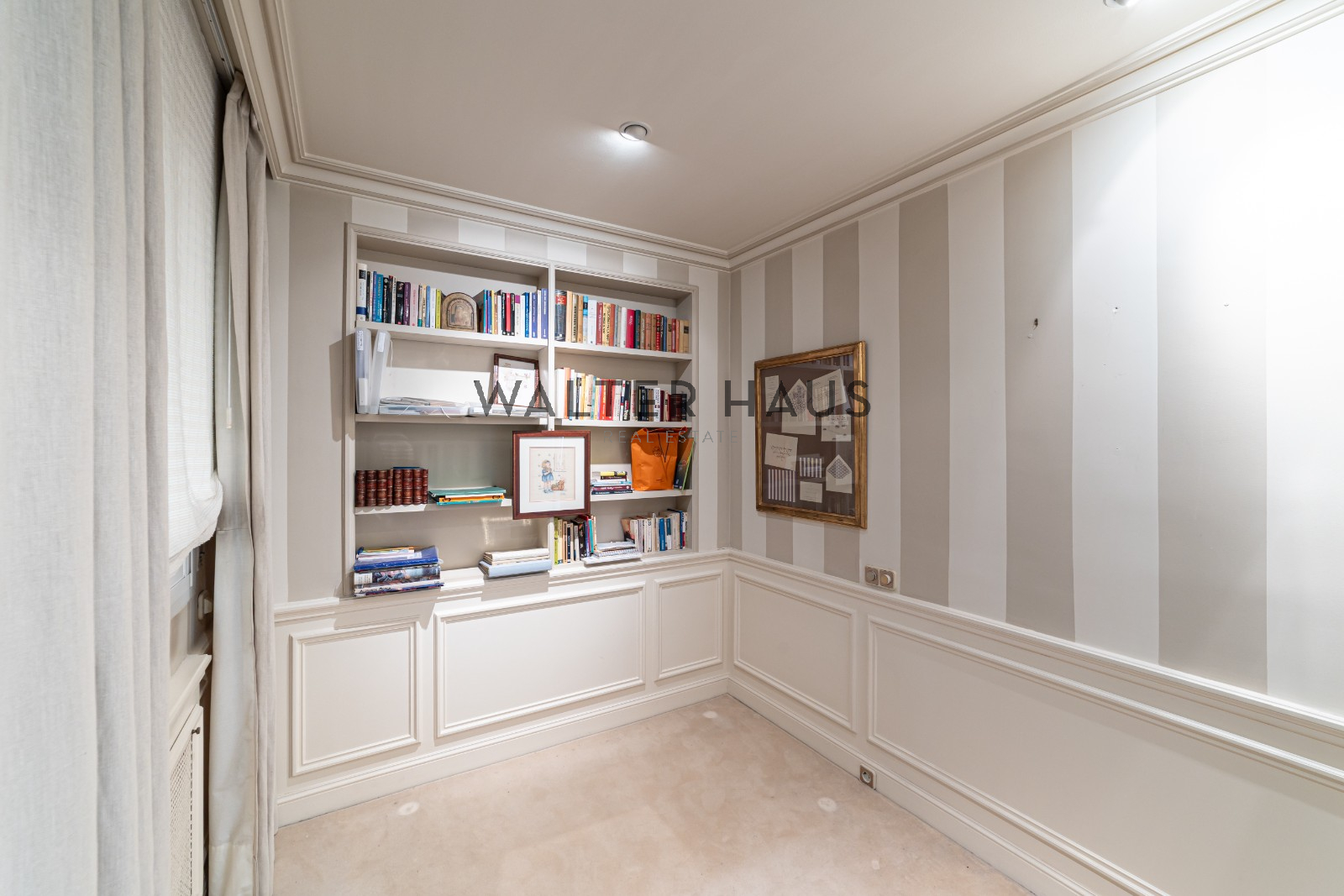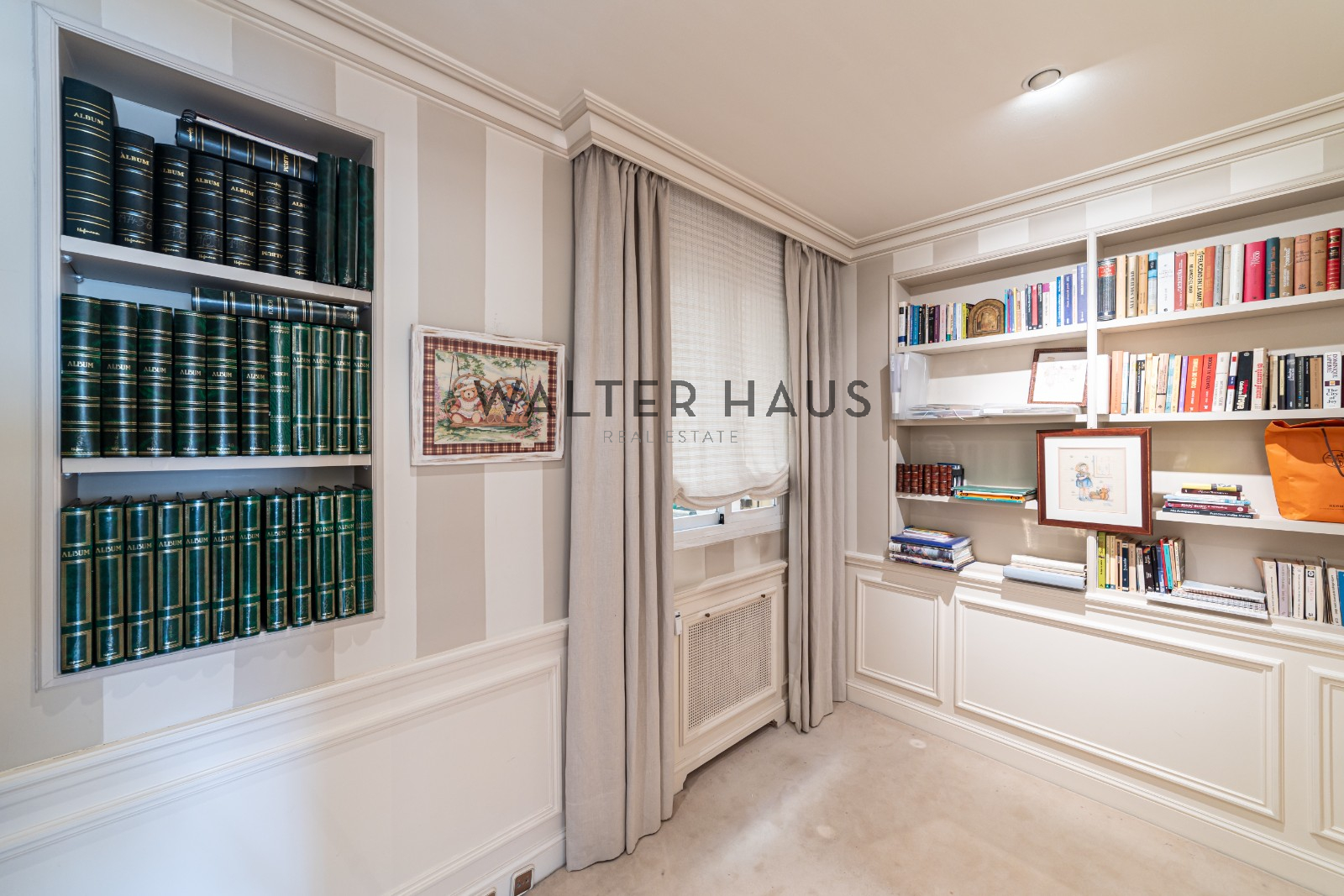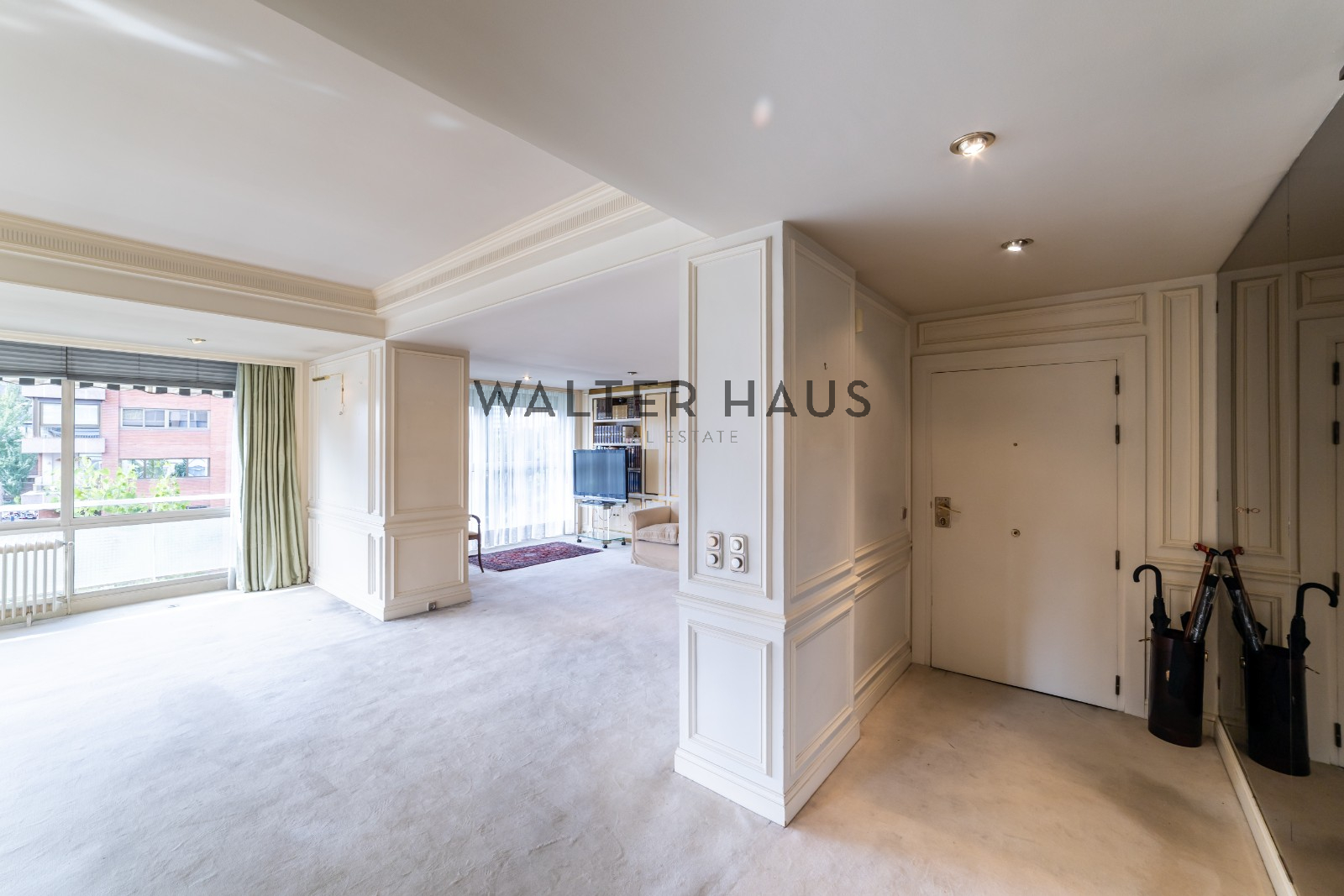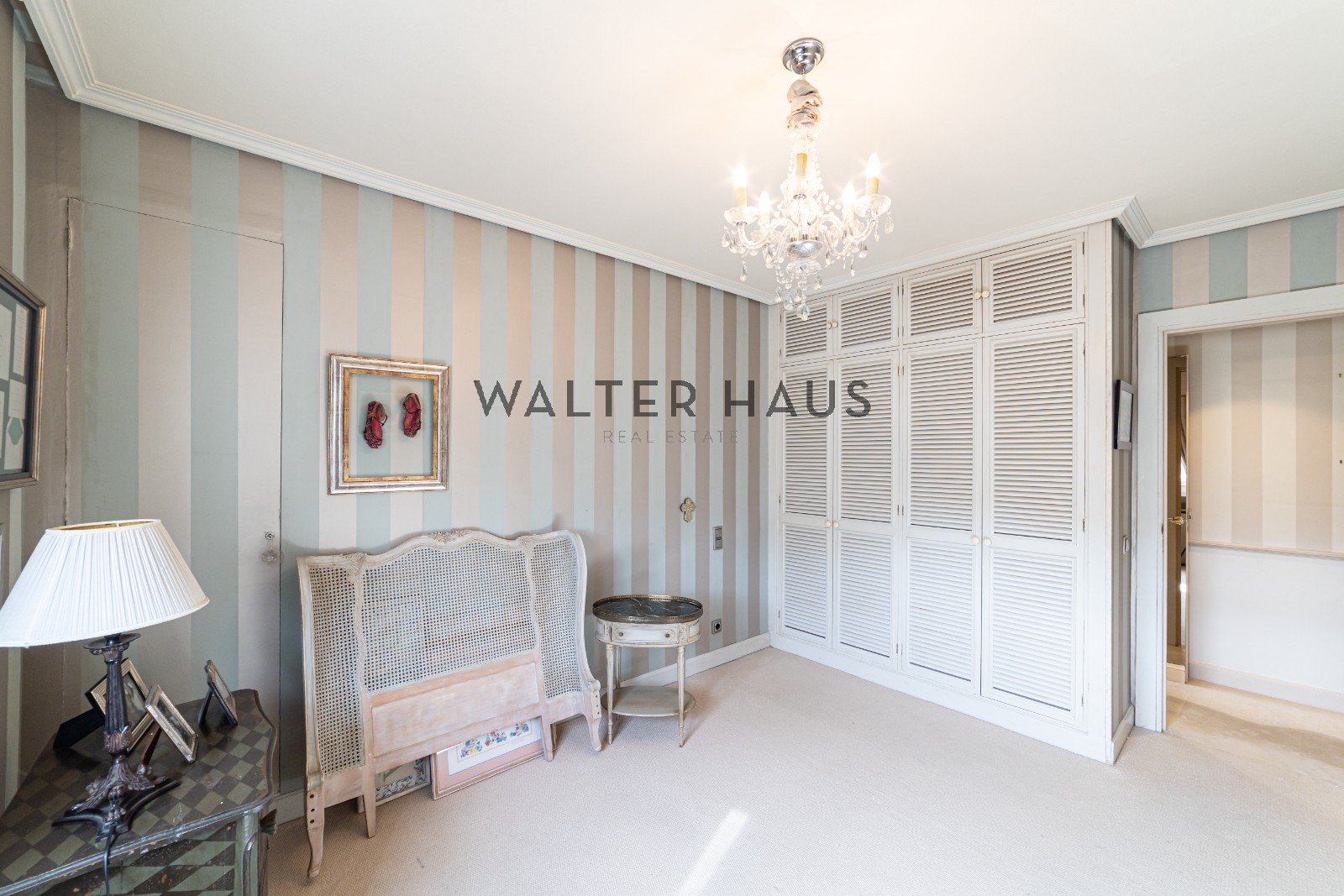 L’aménagement intérieur soigné débute par un élégant hall de réception, équipé d’un dressing pratique. Le spacieux séjour, divisé en trois espaces, constitue le cœur de la maison, remarquable par ses grandes fenêtres offrant une vue imprenable sur le Paseo de la Habana. L’espace nuit comprend quatre chambres au total : une suite parentale donnant sur l’extérieur avec salle de bains privative et grands placards intégrés, et deux autres chambres, également extérieures, partageant une seconde salle de bains. La cuisine séparée comprend un petit bureau et dispose d’une porte de service, ainsi que d’une buanderie. La propriété dispose également d’un débarras et d’un service de conciergerie.